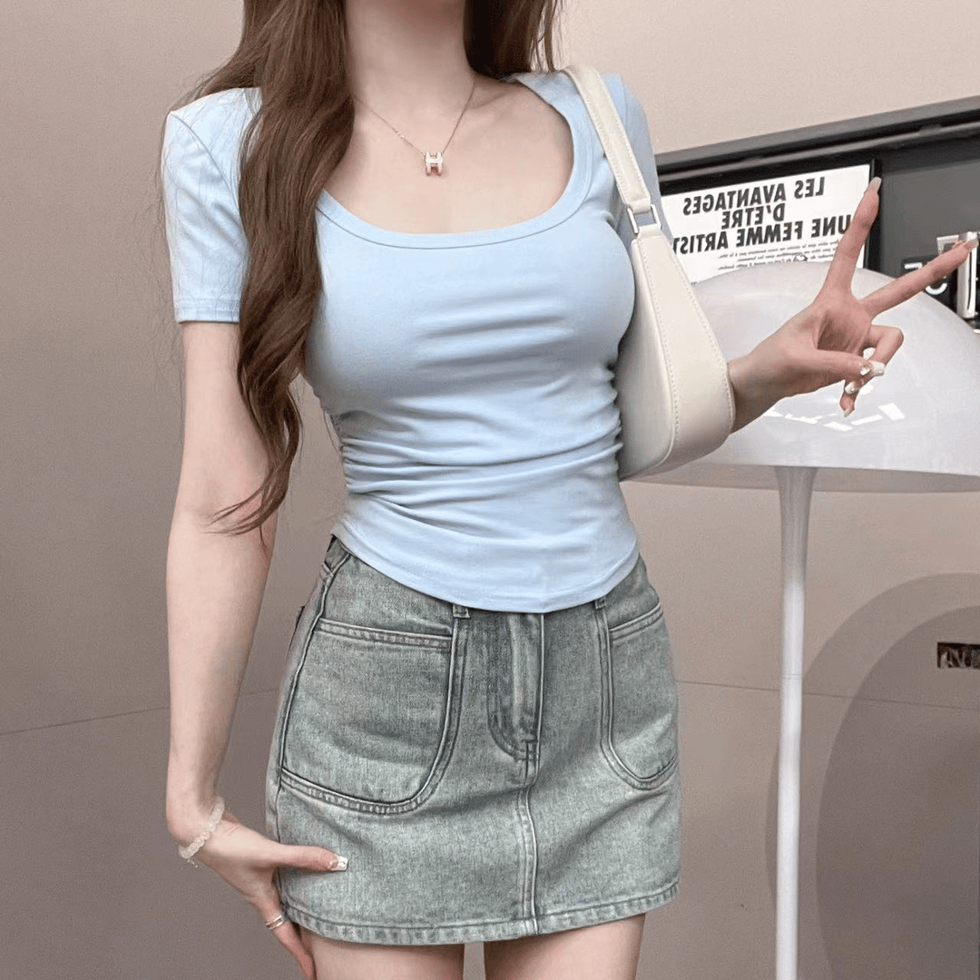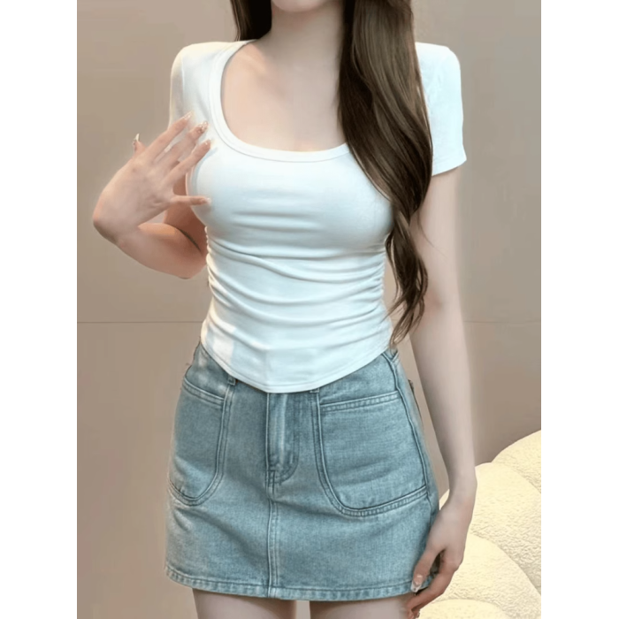 夏季純欲辣妹U領短袖T恤女褶皺設計性感收腰顯瘦純色短款內搭上衣