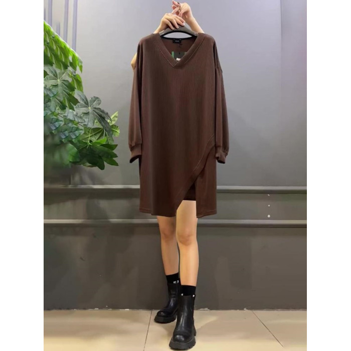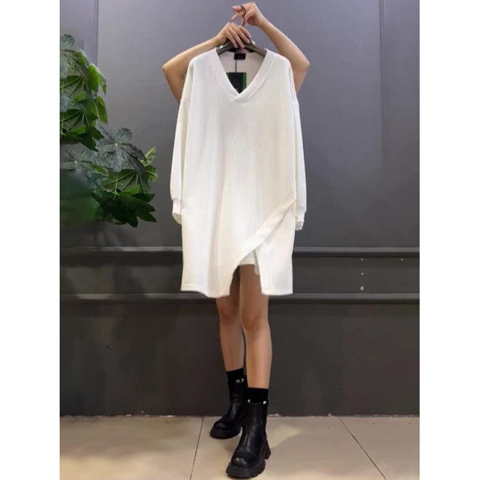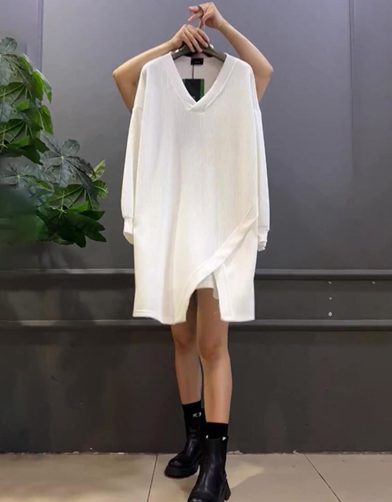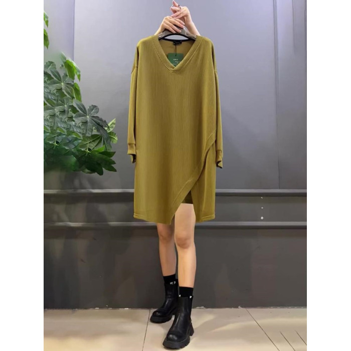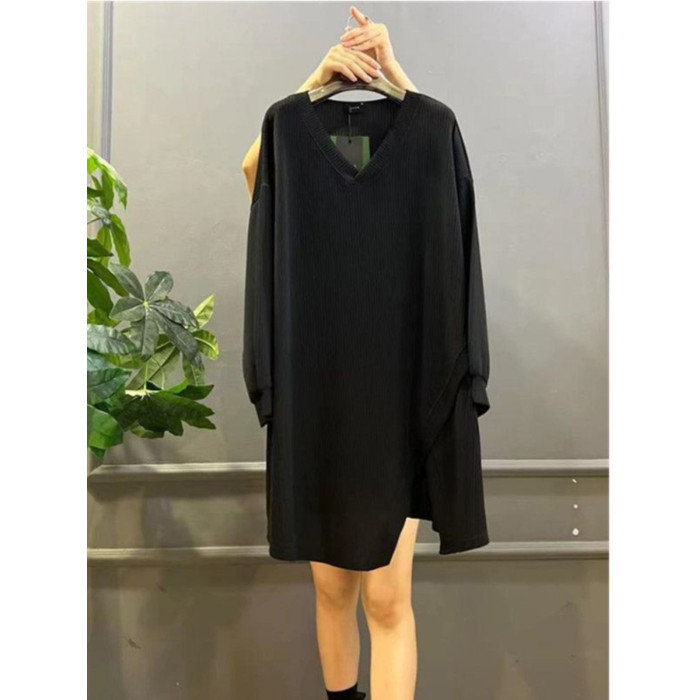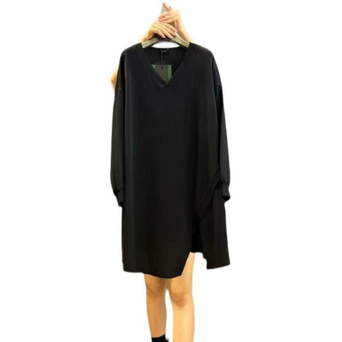 春秋新款300斤大碼胖MM寬松遮肚中長款拼接V領休閒打底長袖上衣女