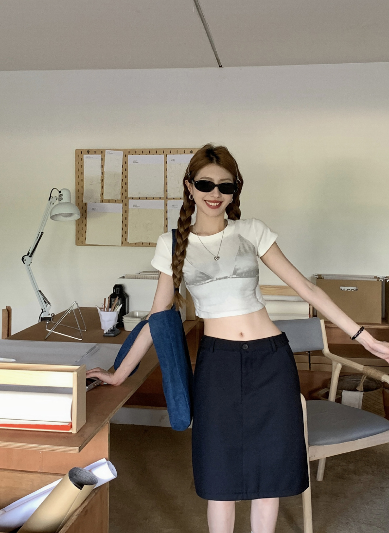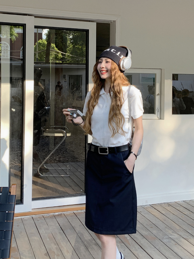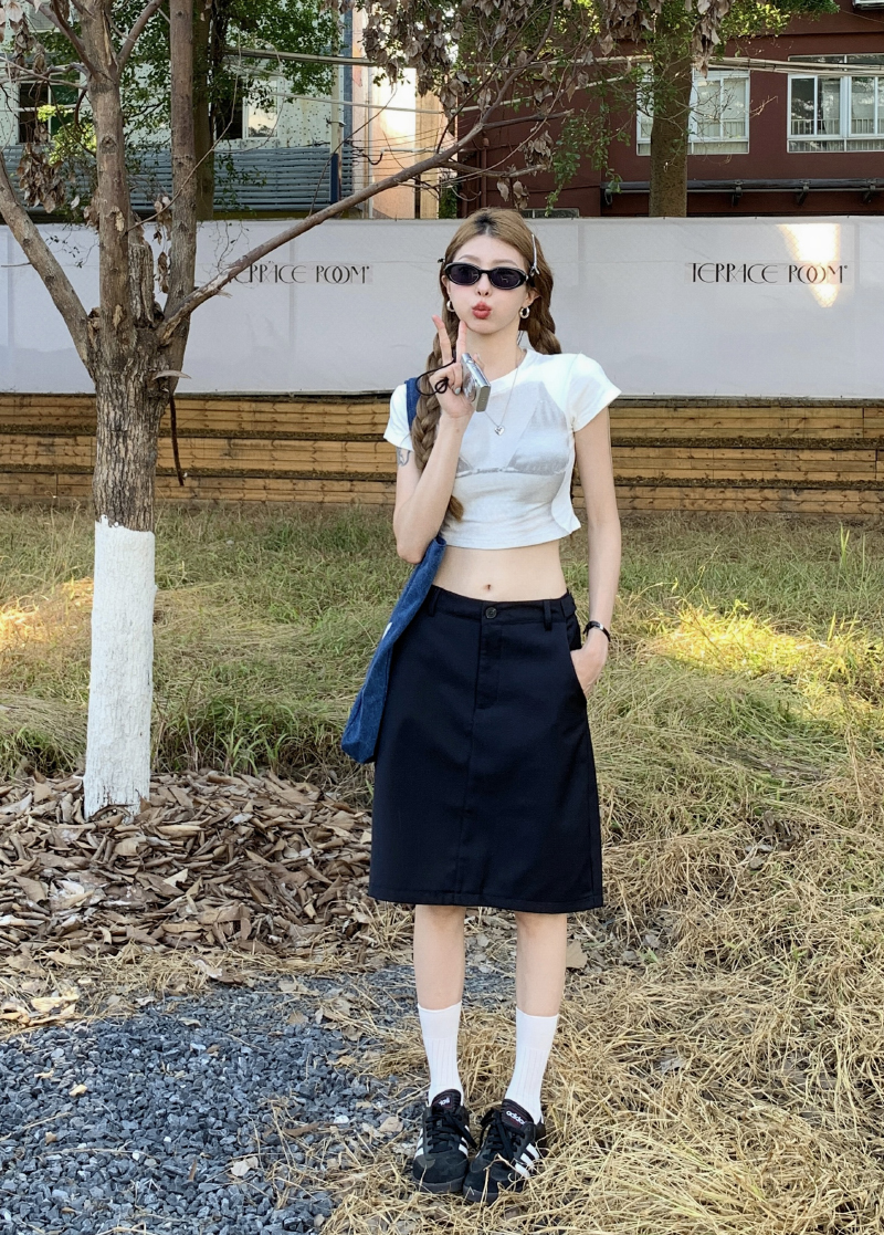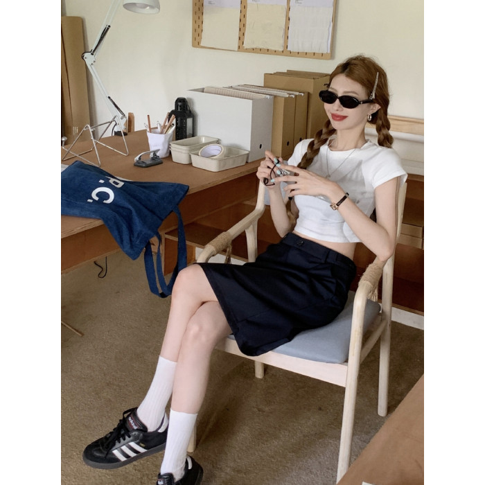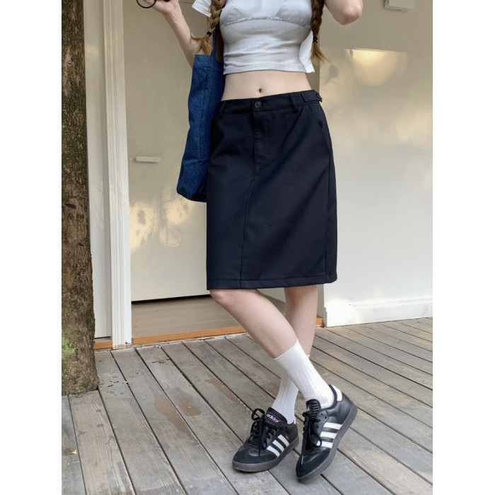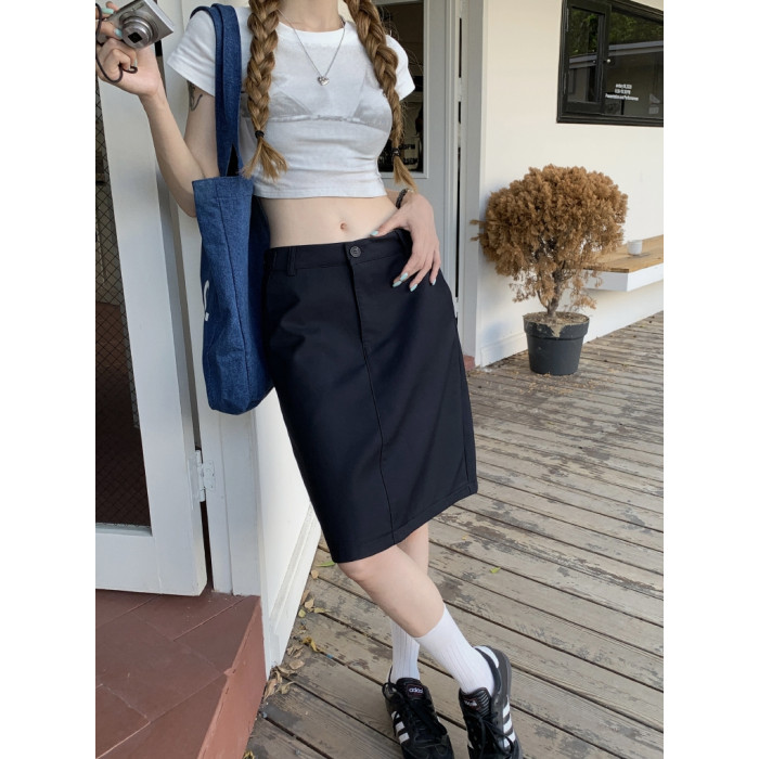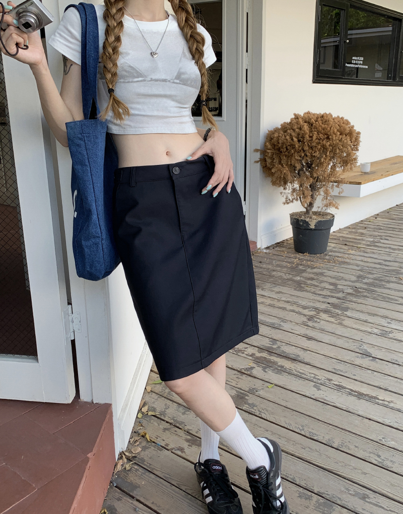 純色半身裙女秋季顯瘦西裝面料胖mm過膝中裙a字裙韓版直筒短裙子