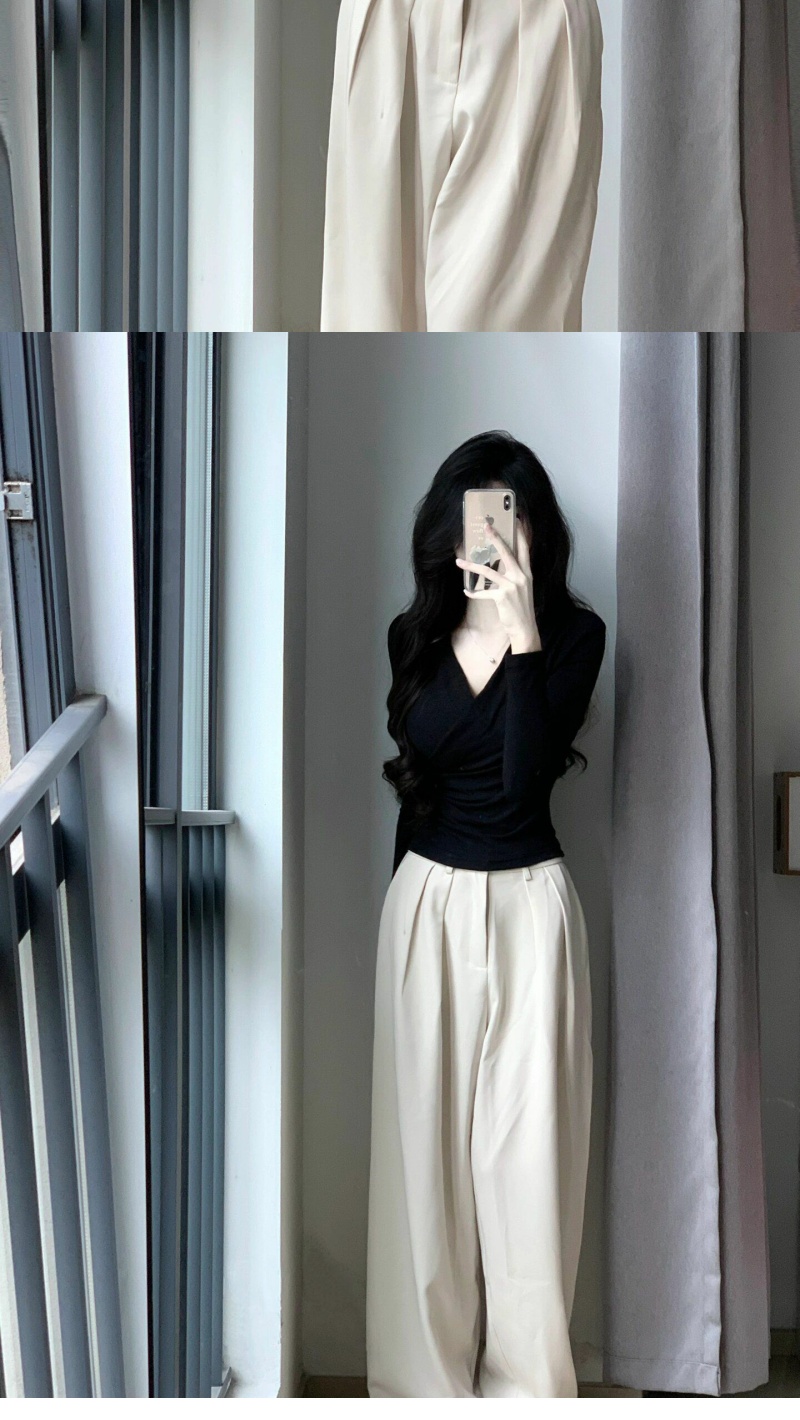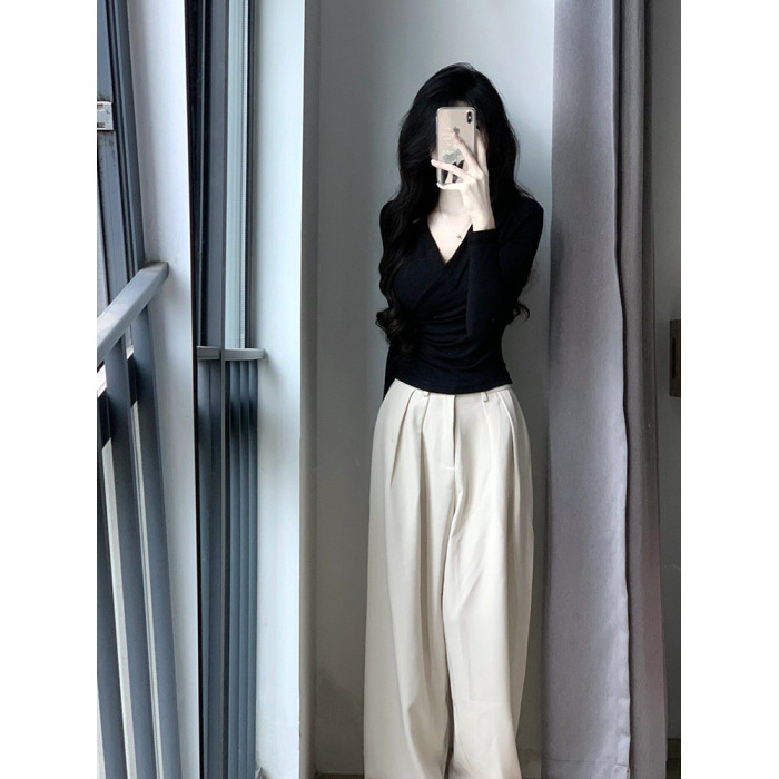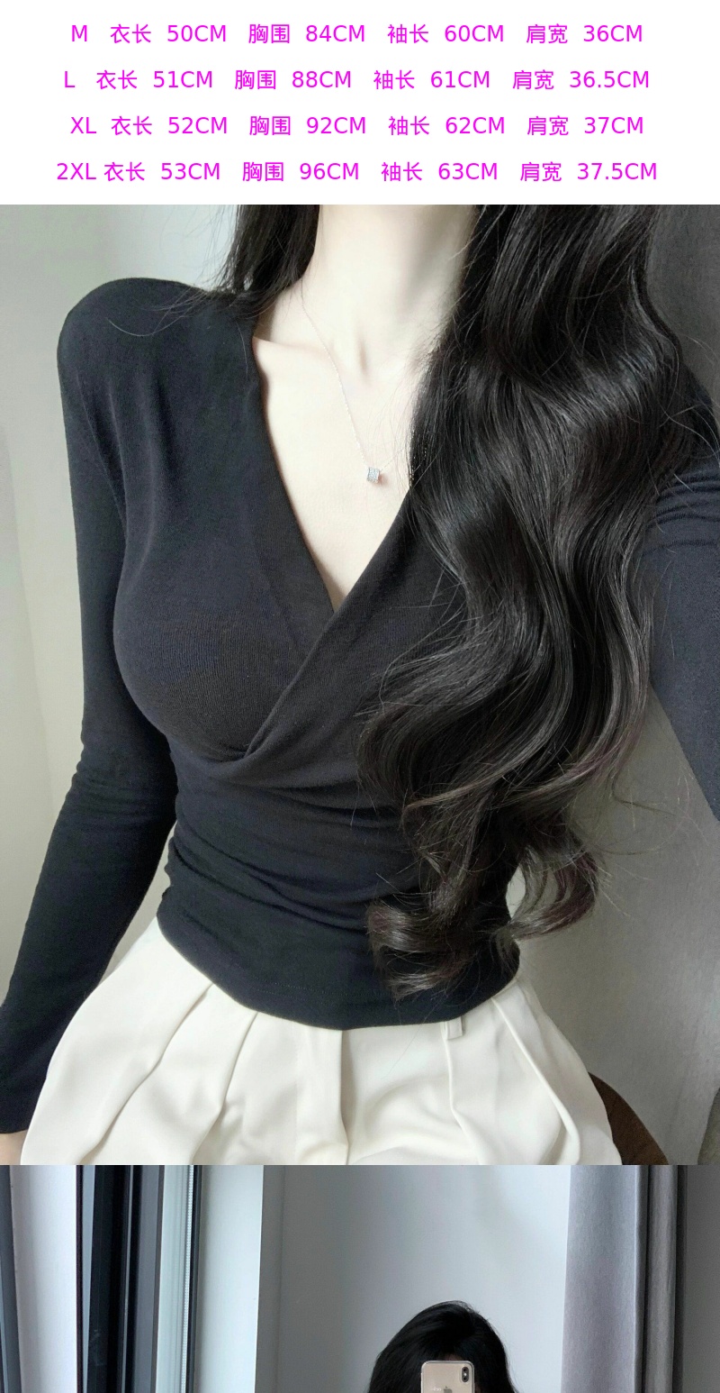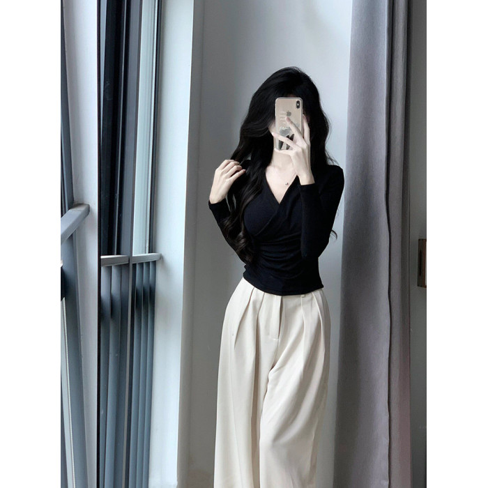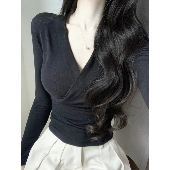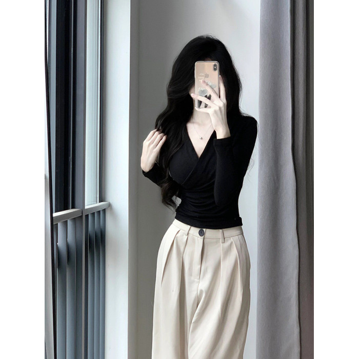 設計感掐腰V領交叉長袖T恤女春秋修身內搭薄款打底衫辣妹純欲上衣