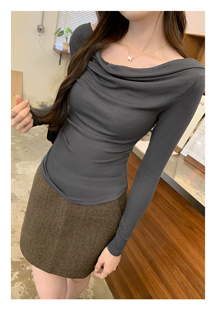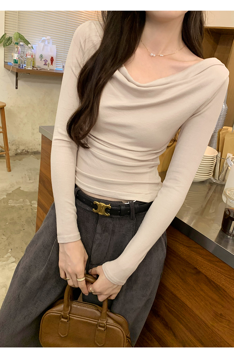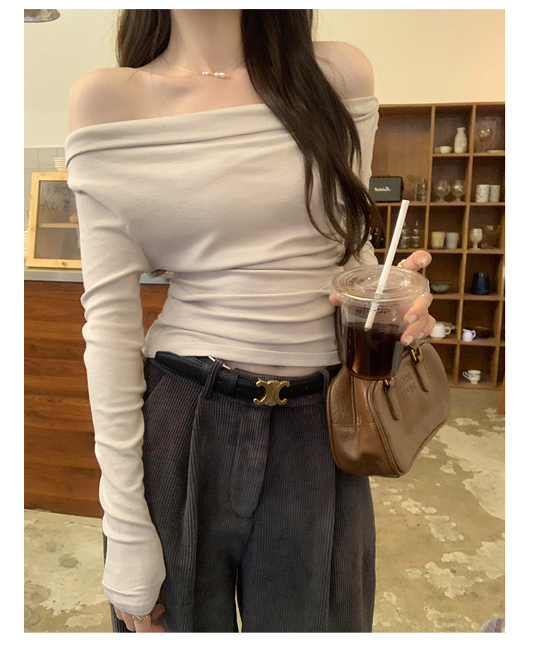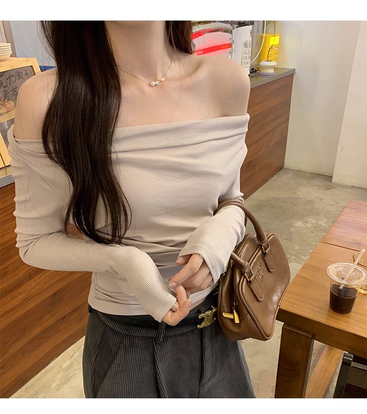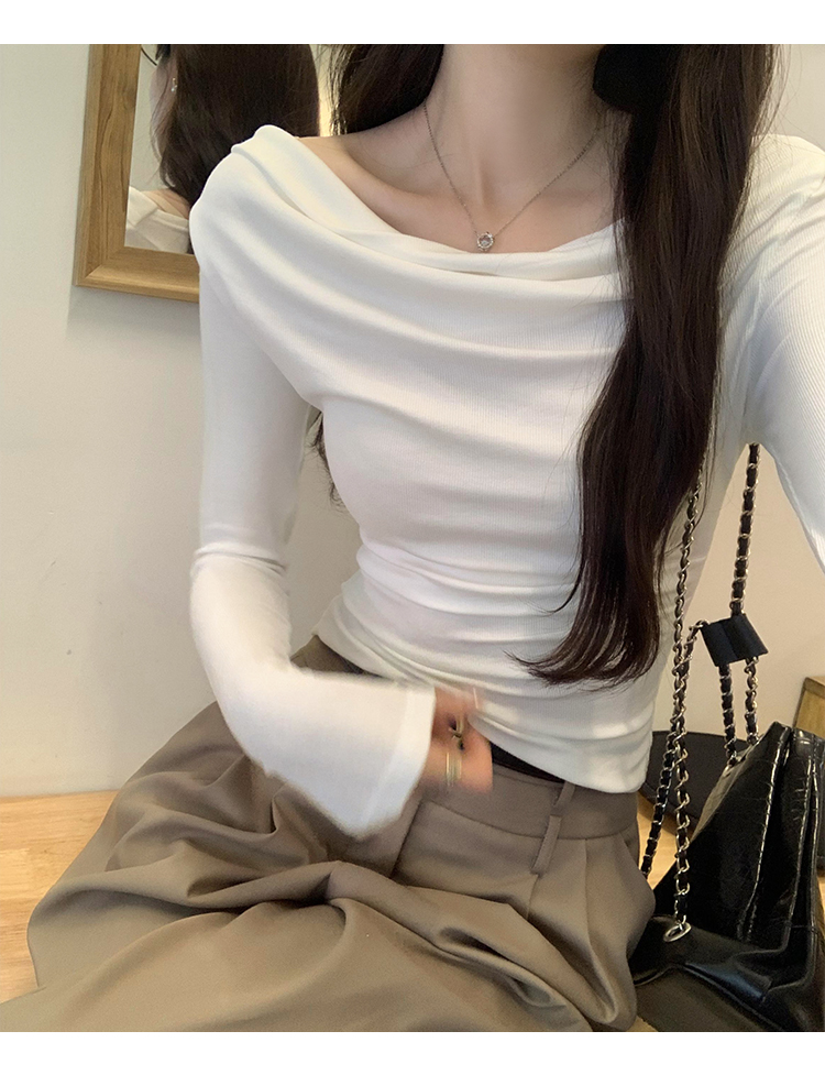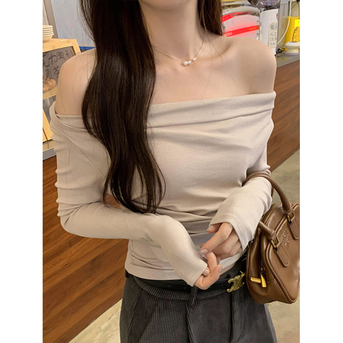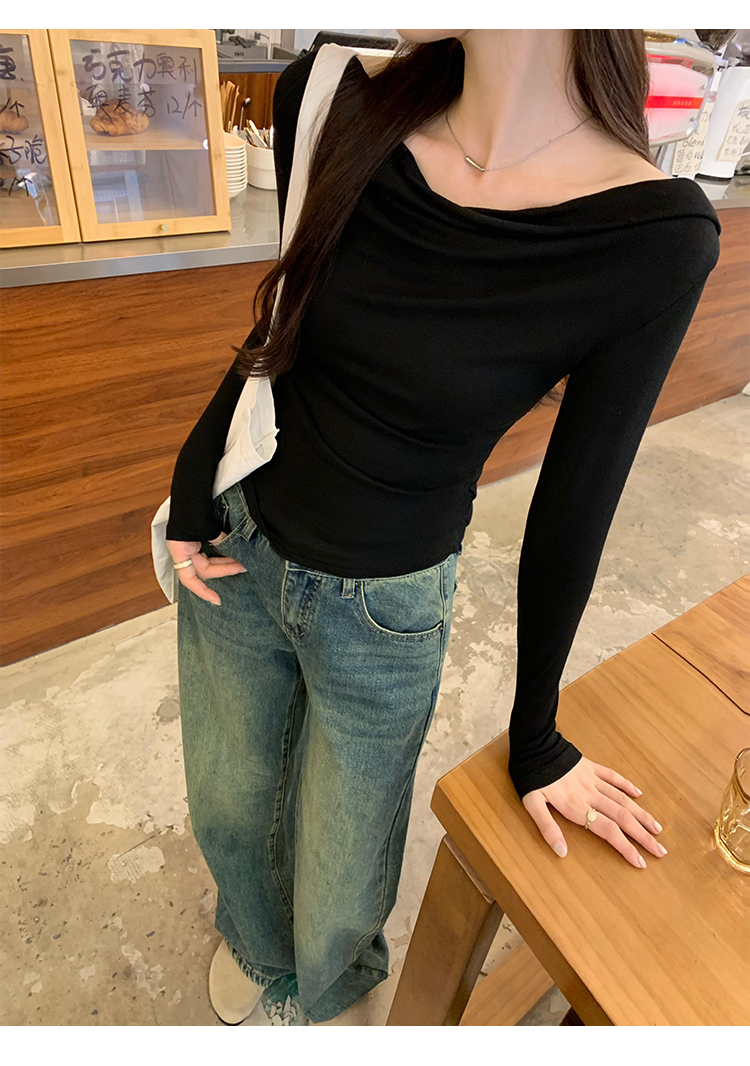 一字肩黑色蕩領露肩修身長袖打底衫T恤女春秋2025新款氣質短上衣