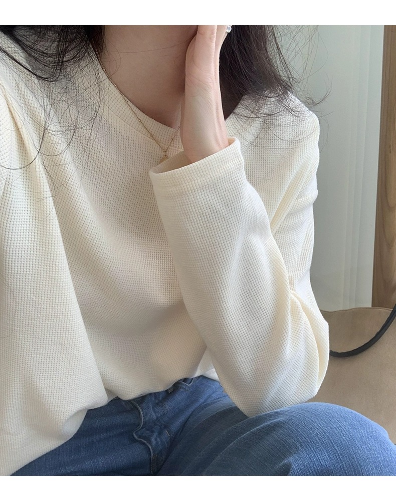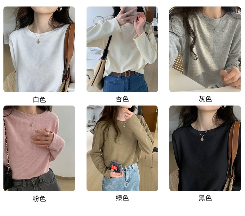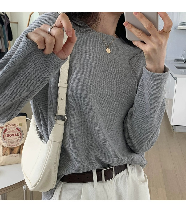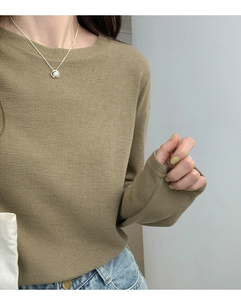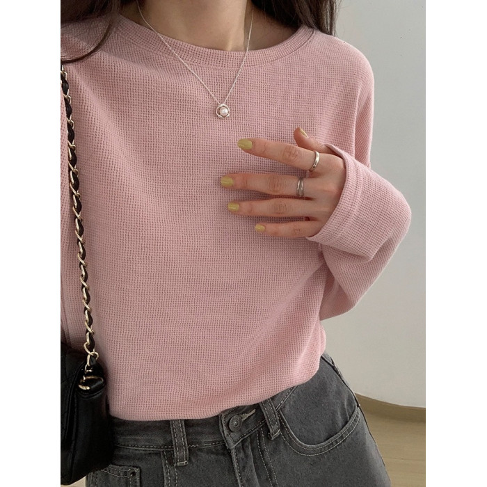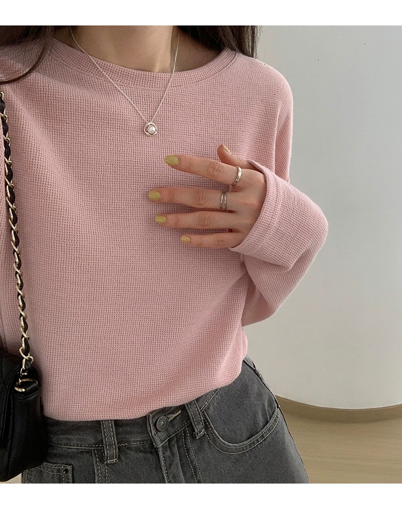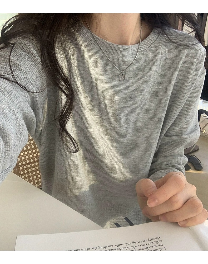 灰色華夫格寬松慵懶風寬松打底衫春季秋冬圓領長袖t恤女百搭純色