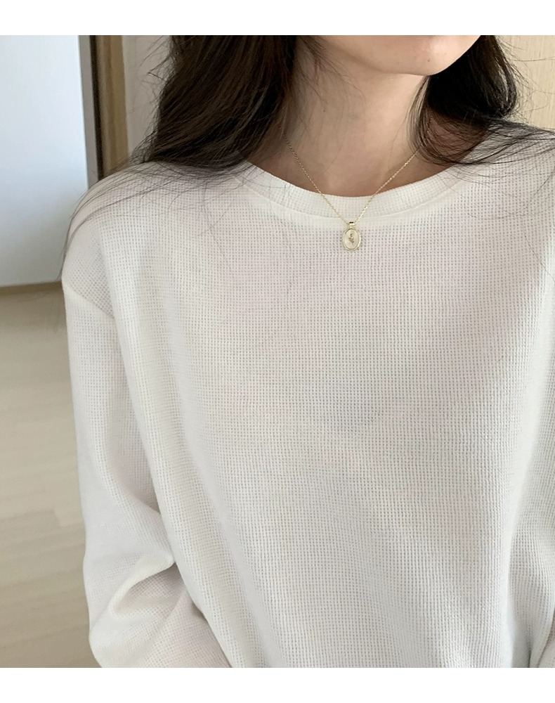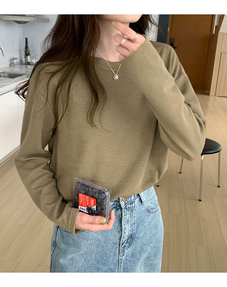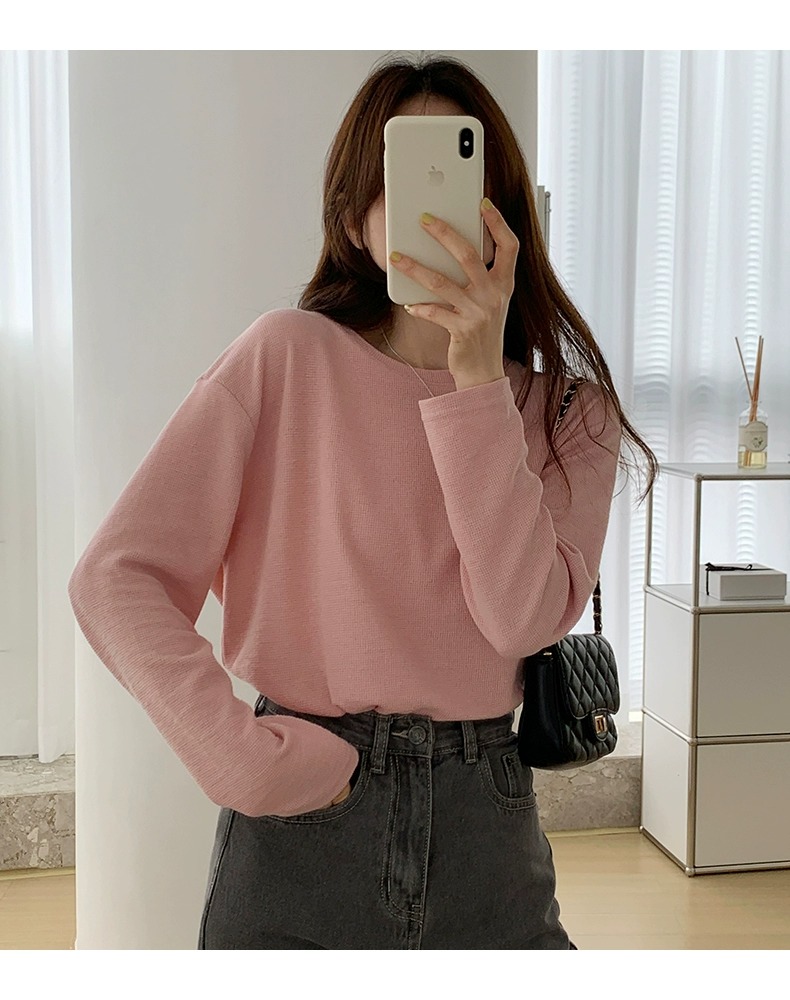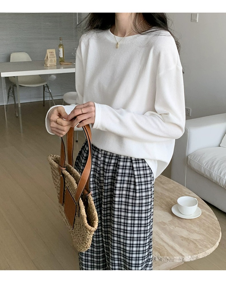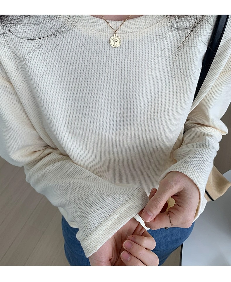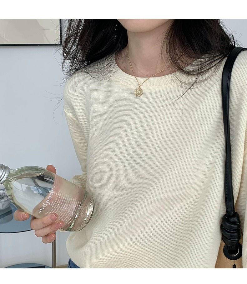 灰色華夫格寬松慵懶風寬松打底衫春季秋冬圓領長袖t恤女百搭純色