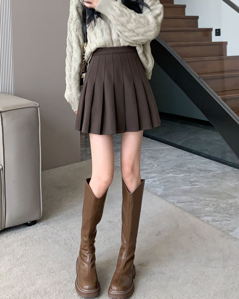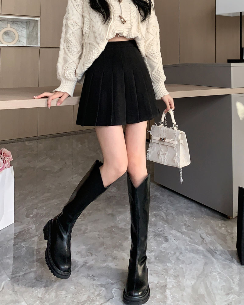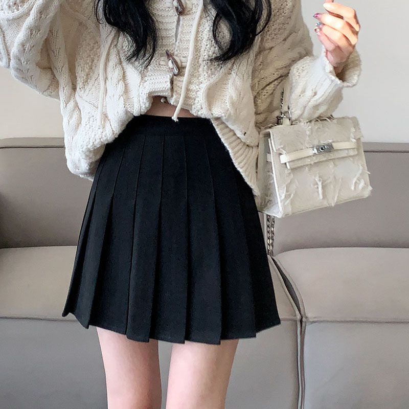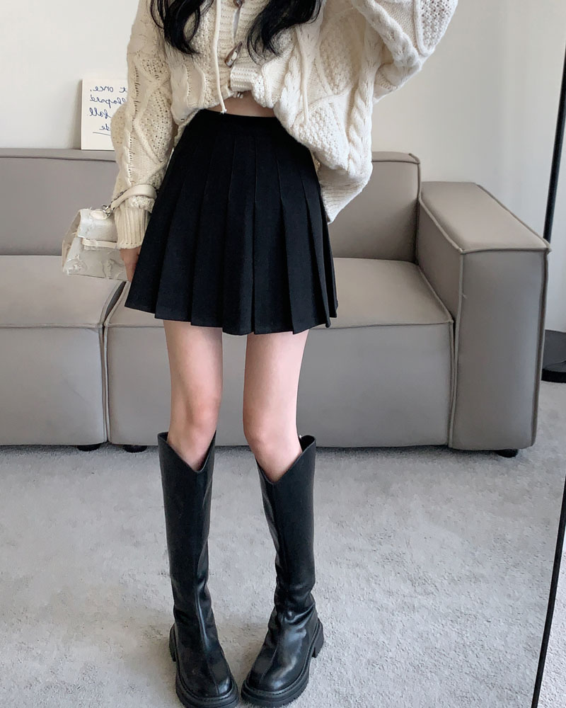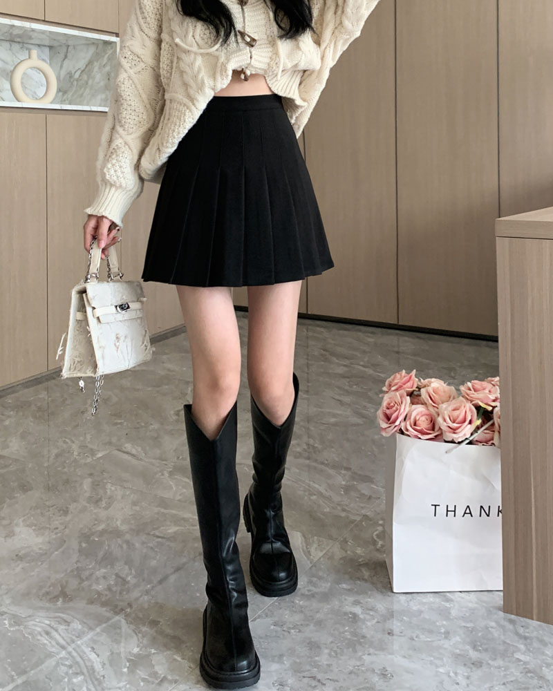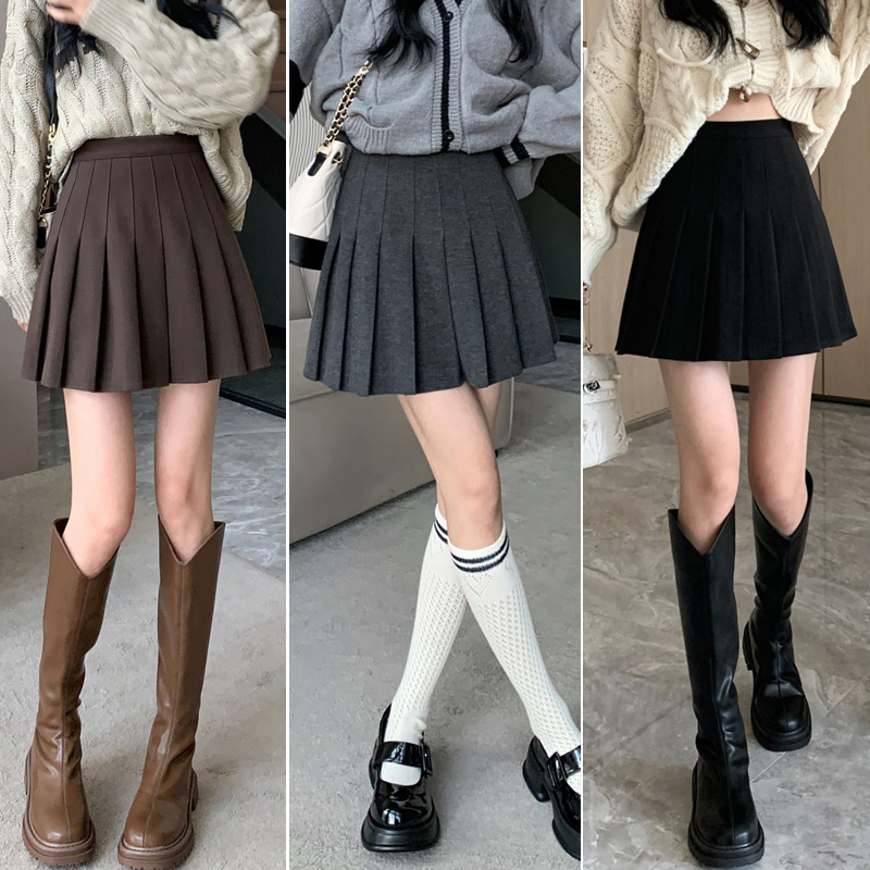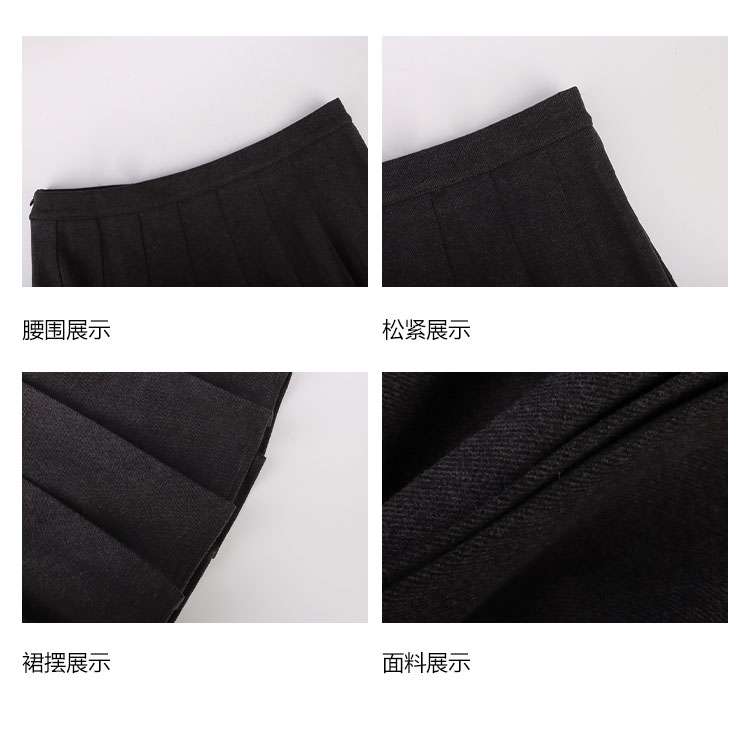 大碼黑色毛呢百褶裙女春秋新款小個子高腰顯瘦A字半身裙胖mm短裙