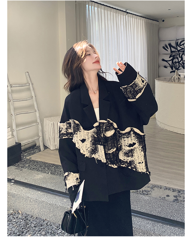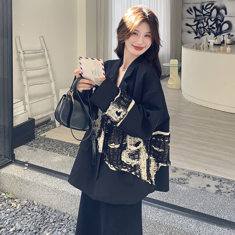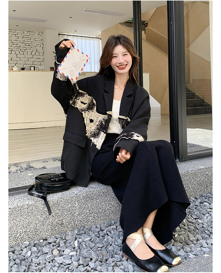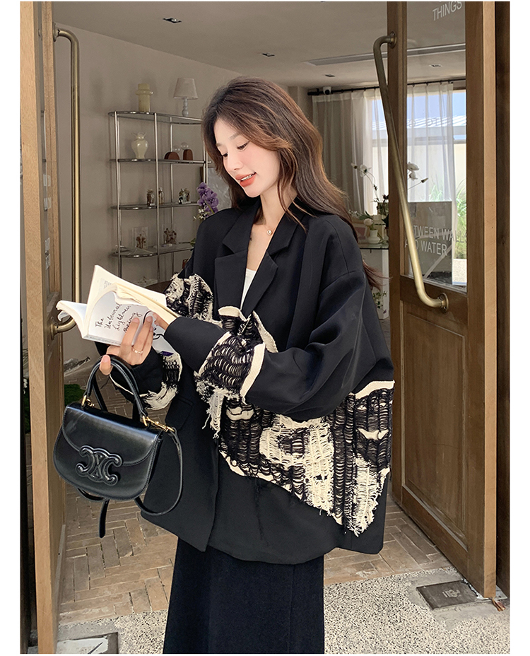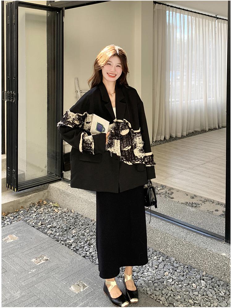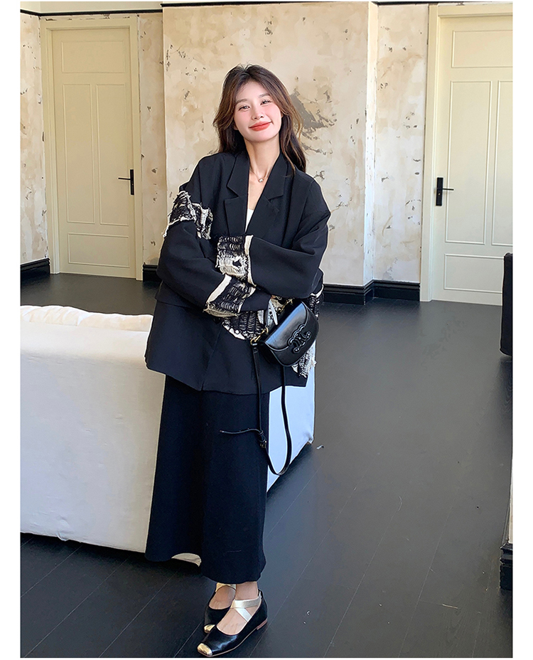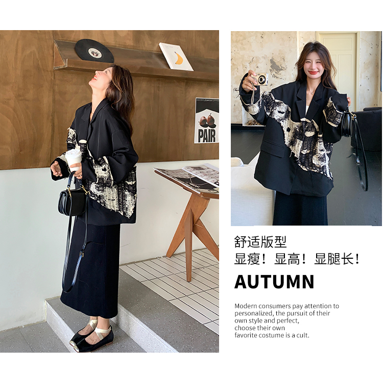 黑色拼接西裝外套女春2025超火今年流行寬松休閒獨特漂亮爆款西服