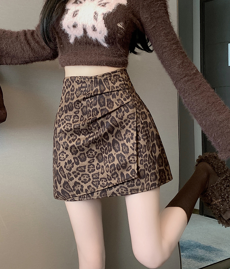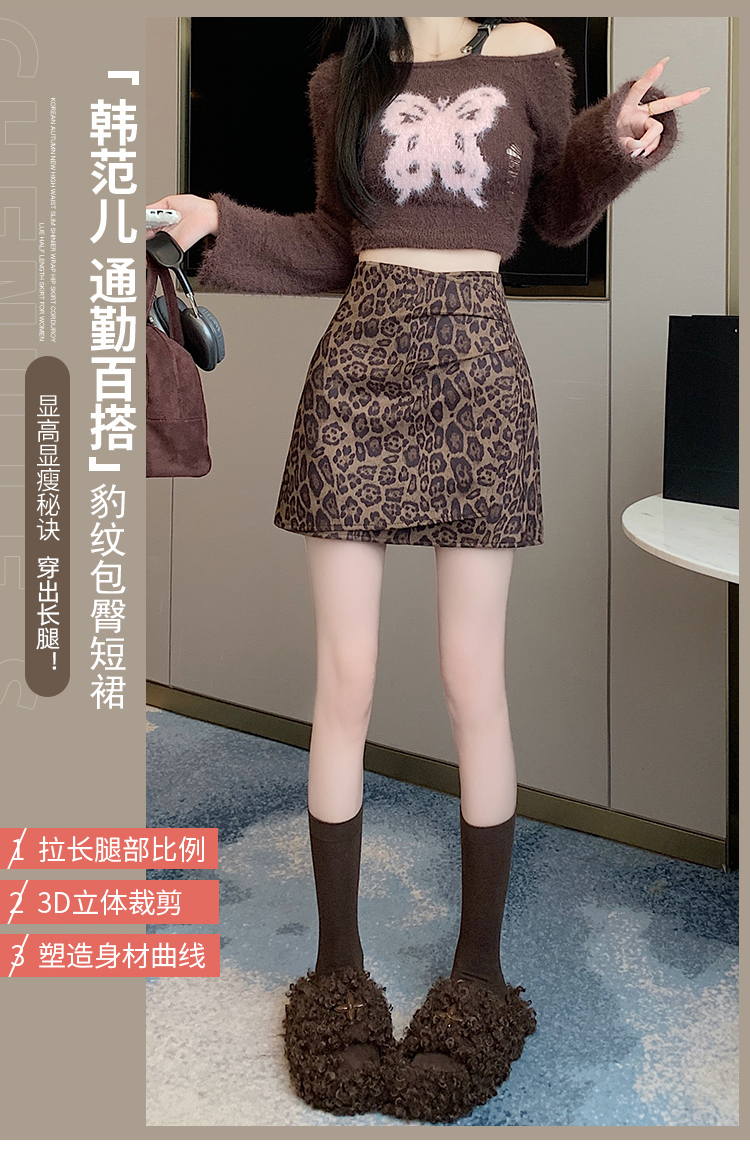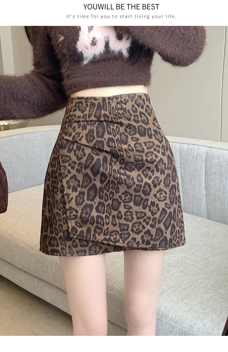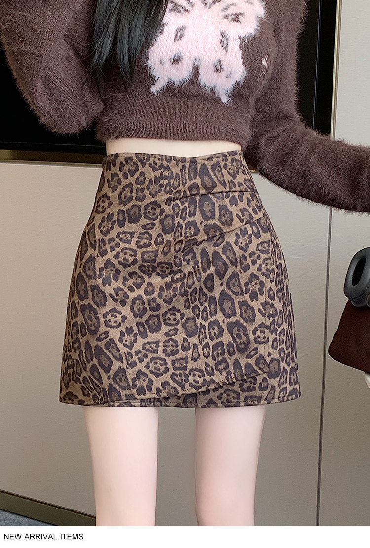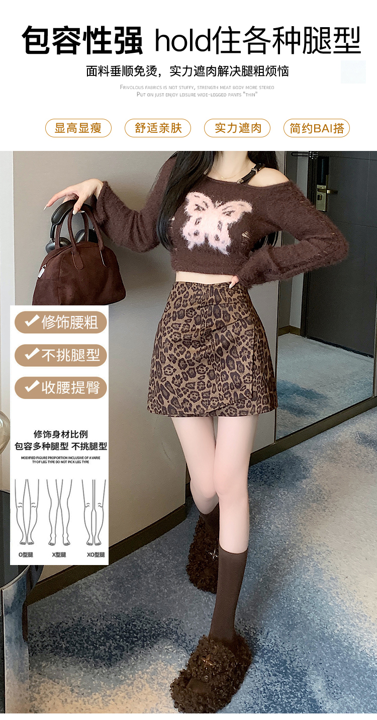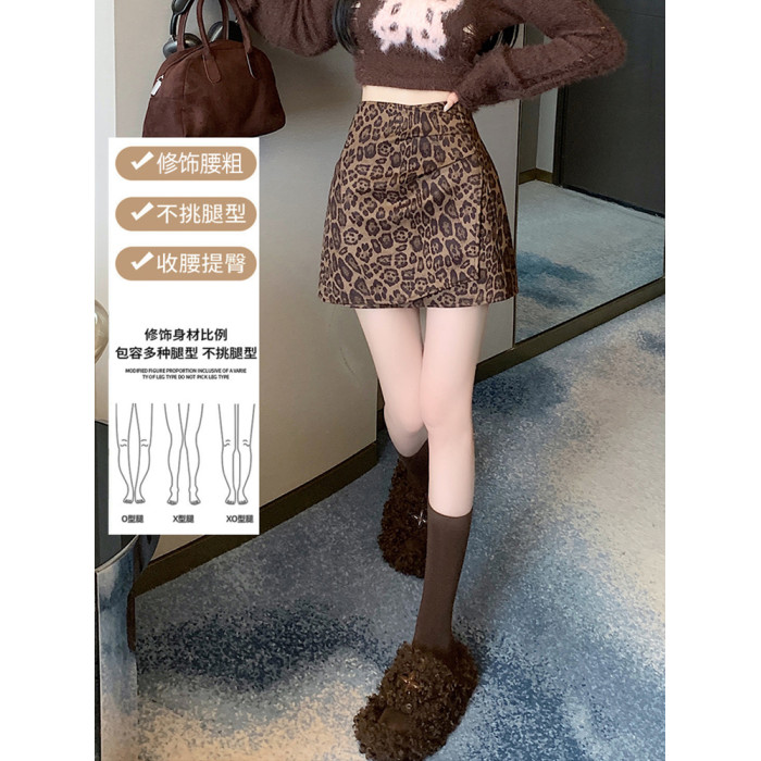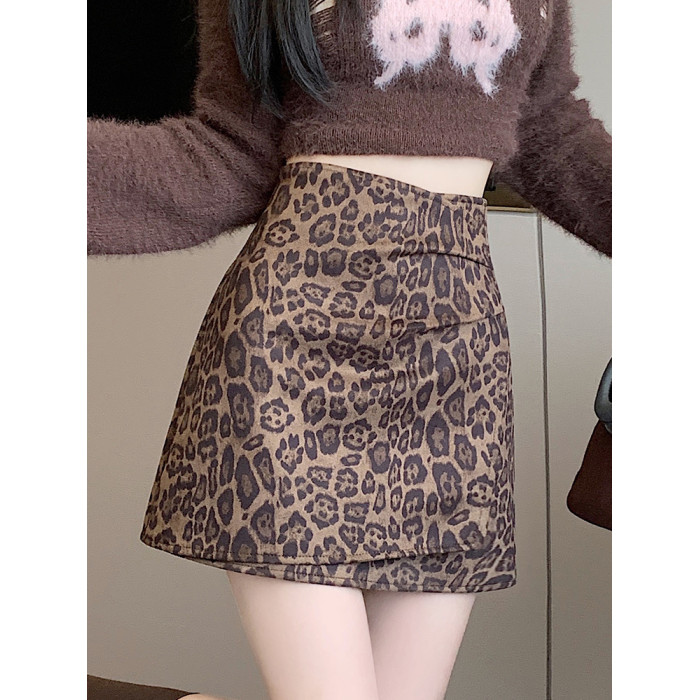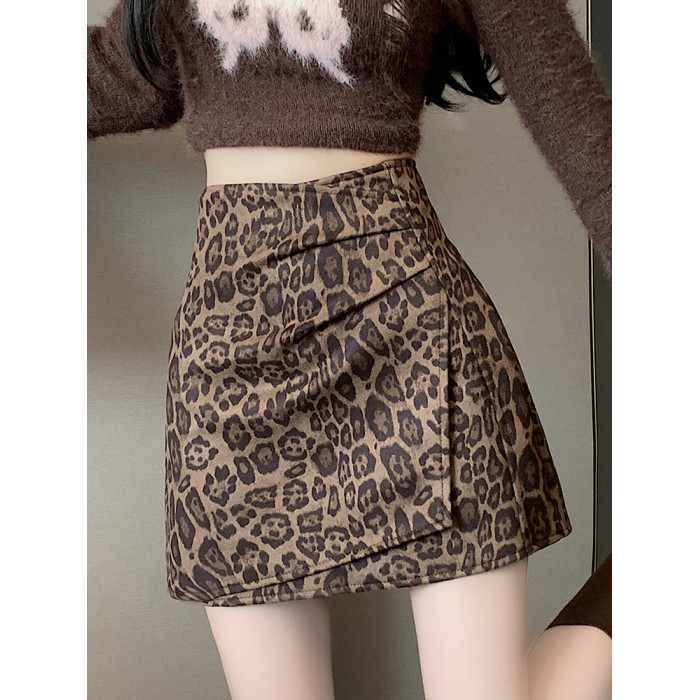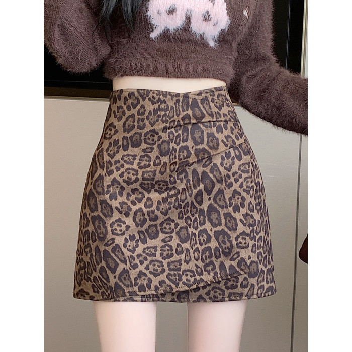 美式辣妹豹紋印花褶皺半身裙女秋冬新款交叉高腰顯瘦a字包臀短裙