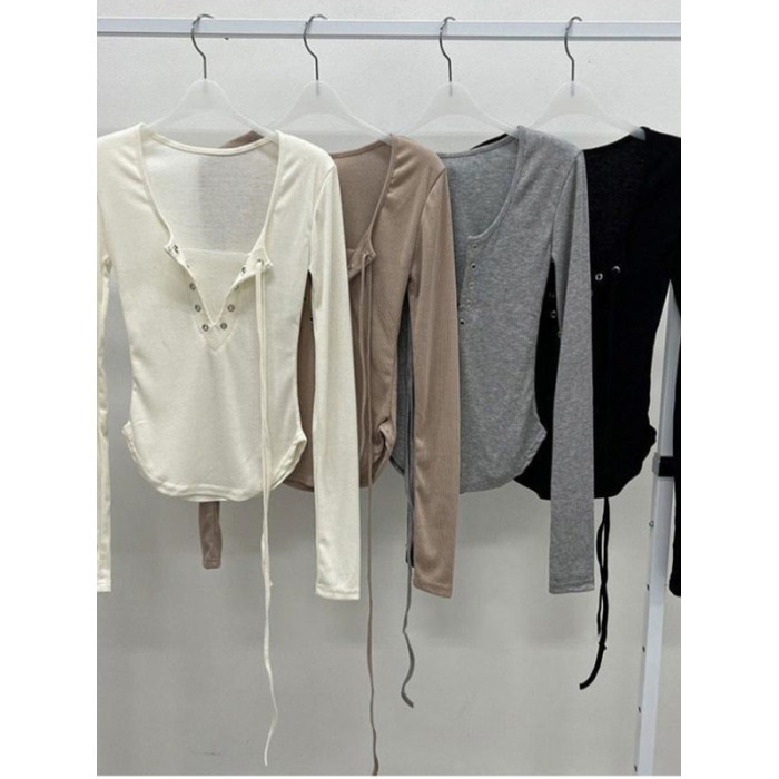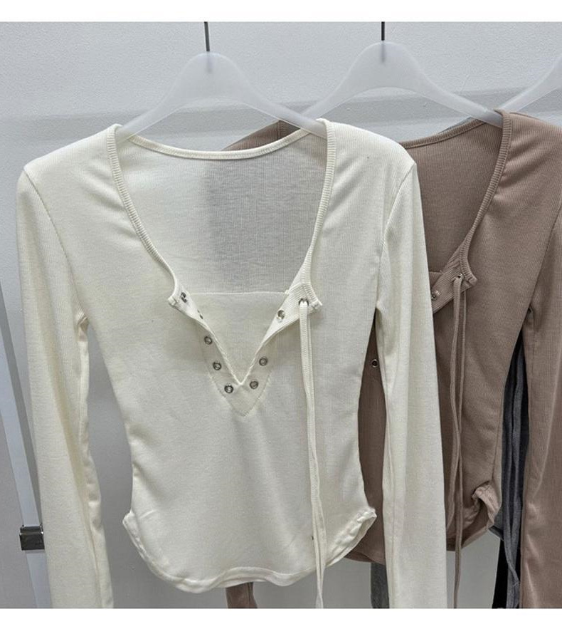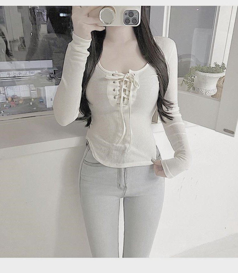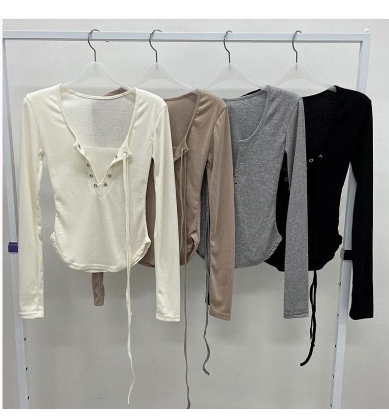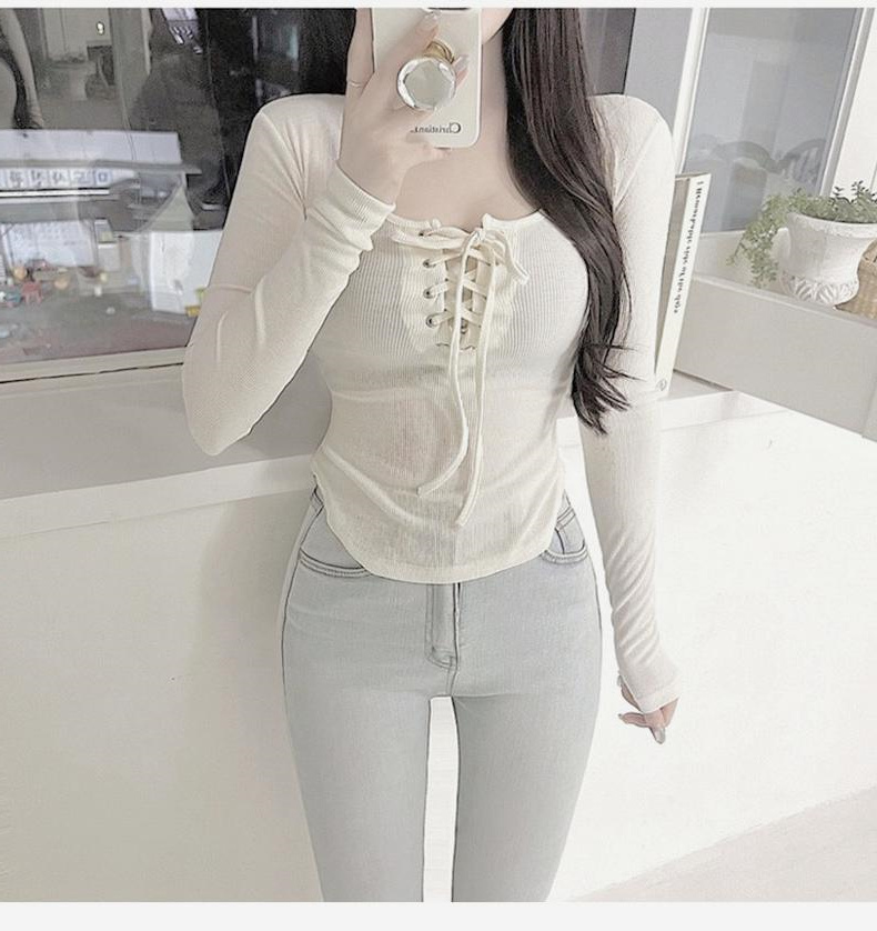 特大碼300斤胖mm純欲風U領長袖T恤女春季設計感修身魚骨打底上衣2