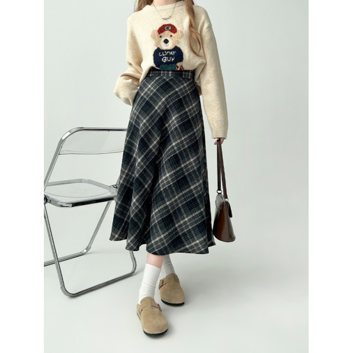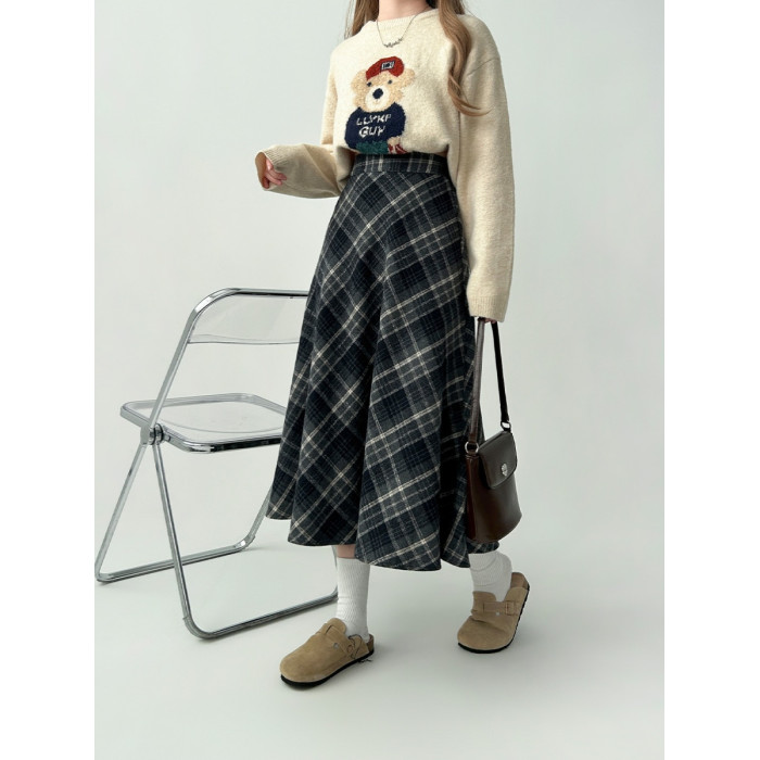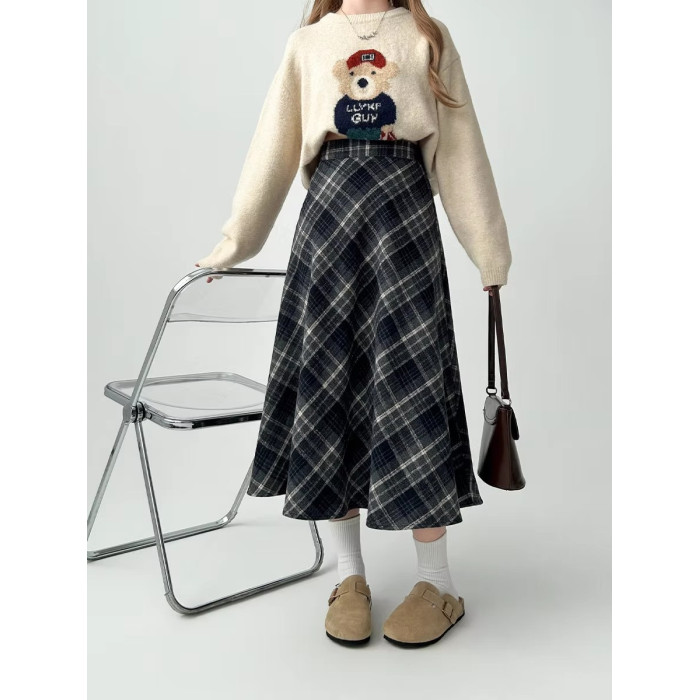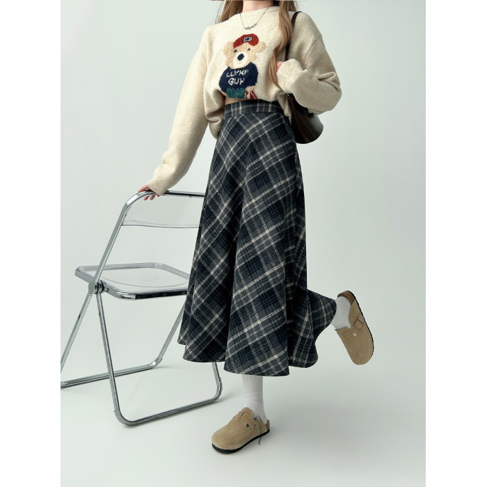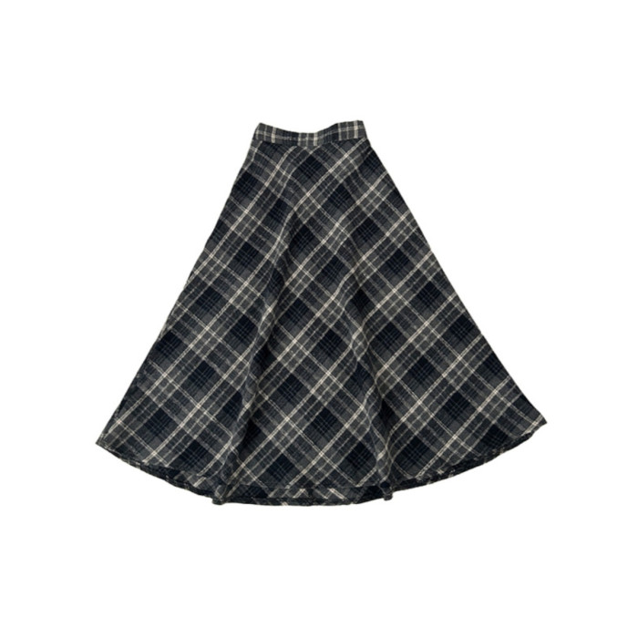 大碼微胖mm灰色毛呢格子半身裙女秋冬長裙遮胯繖裙中長款a字裙子