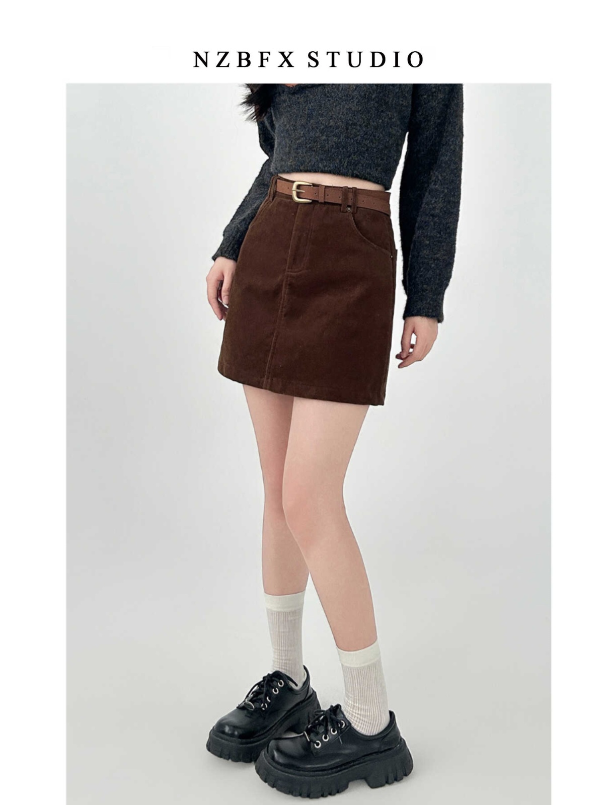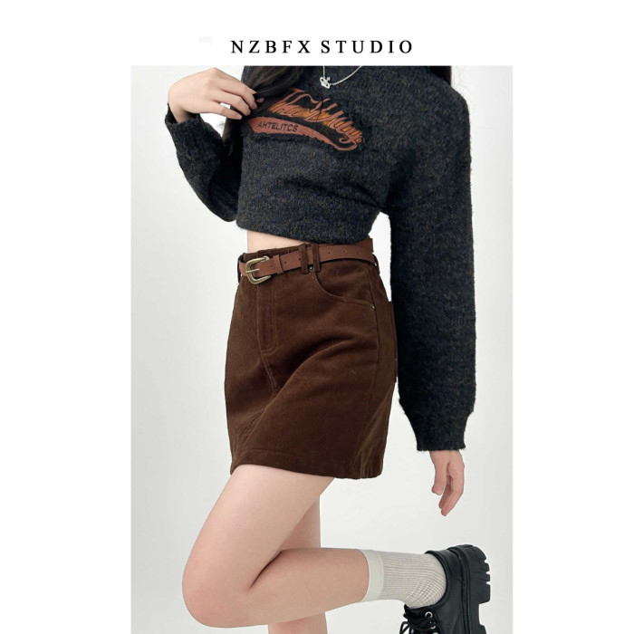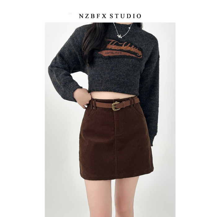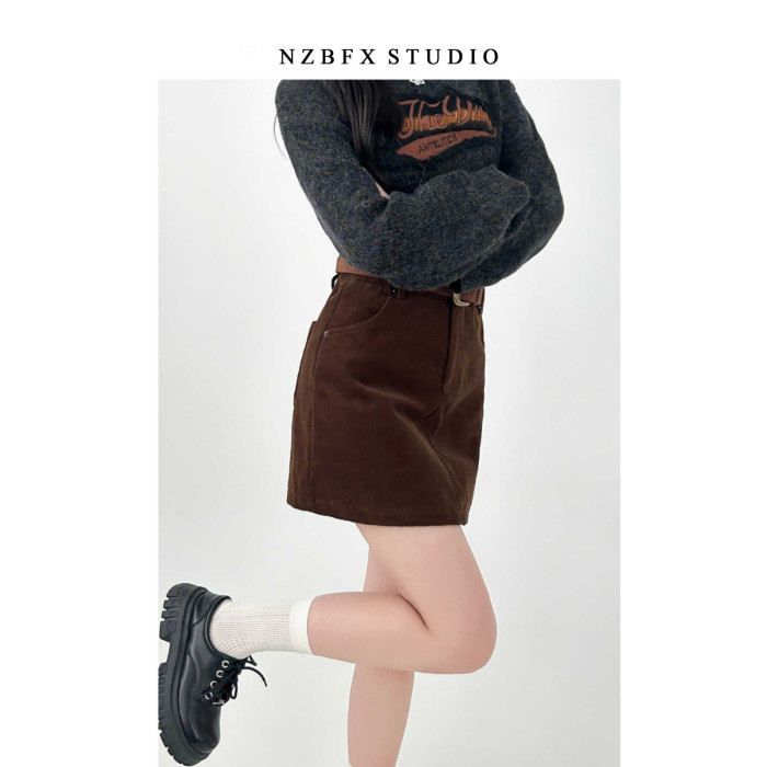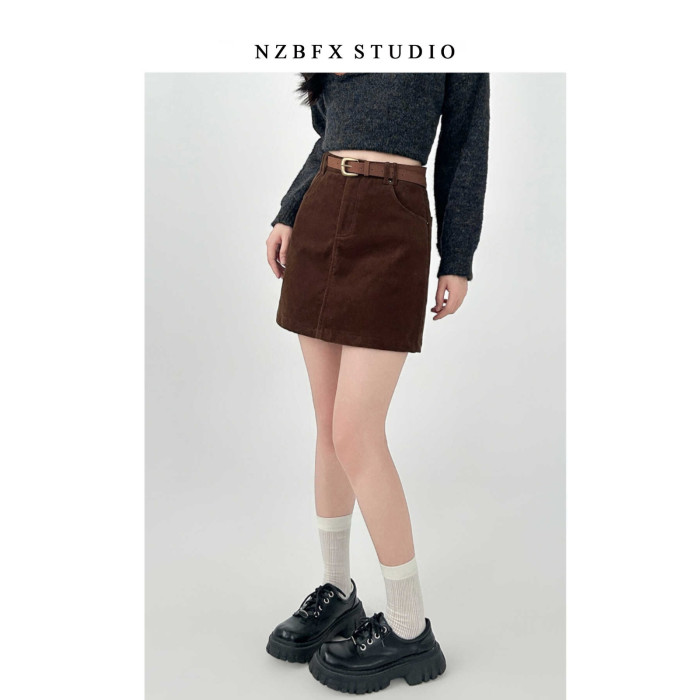 大碼胖mm半身裙女秋冬季咖色短款a字燈芯絨包臀復古裙子棕色短裙