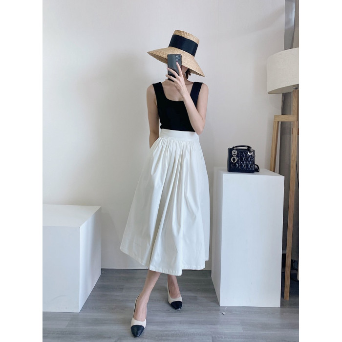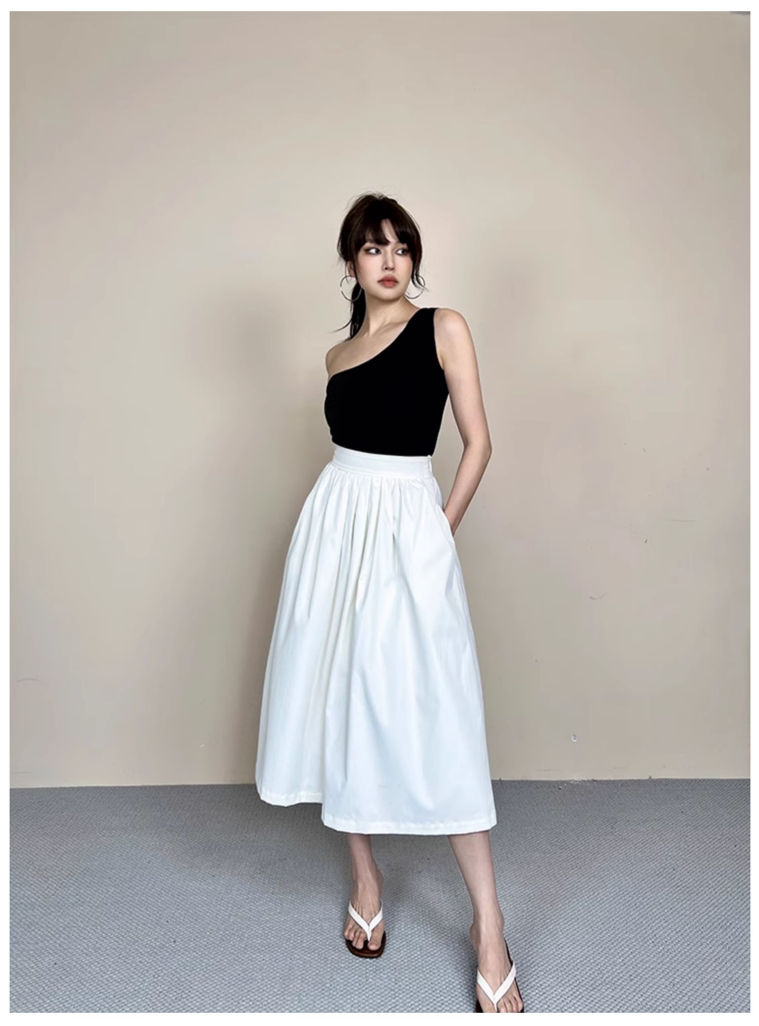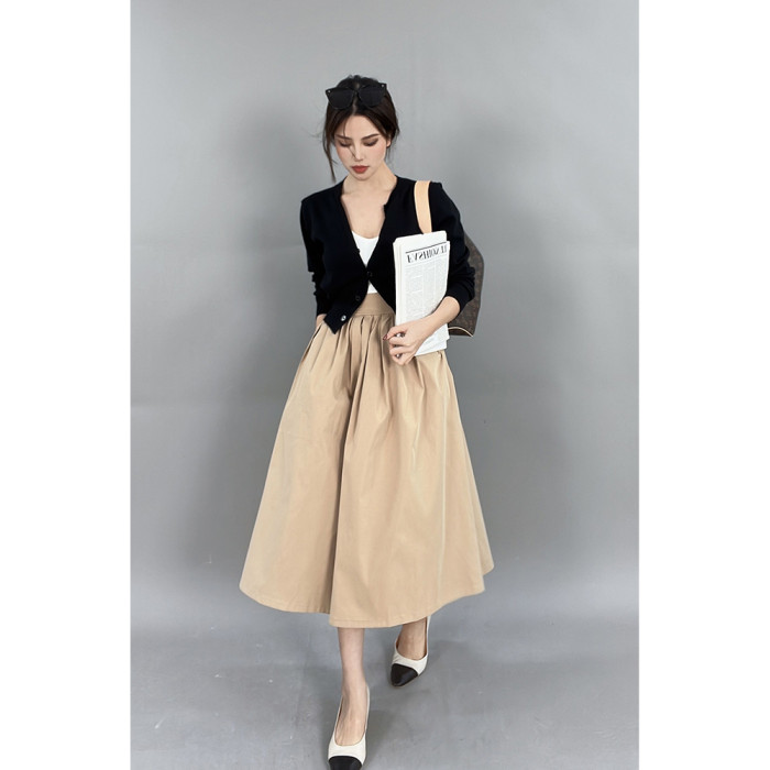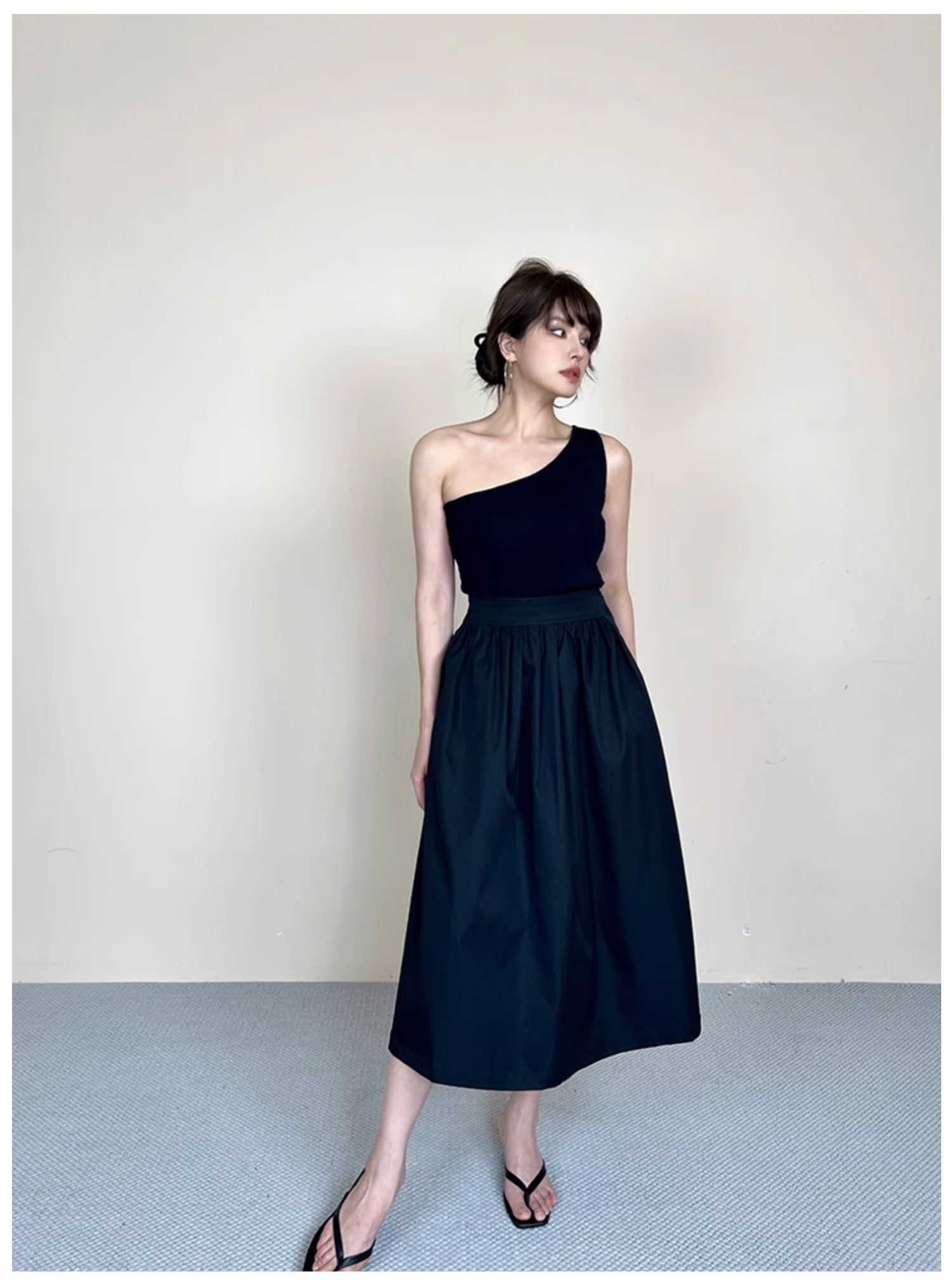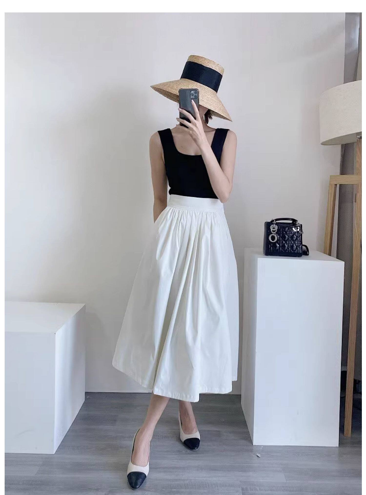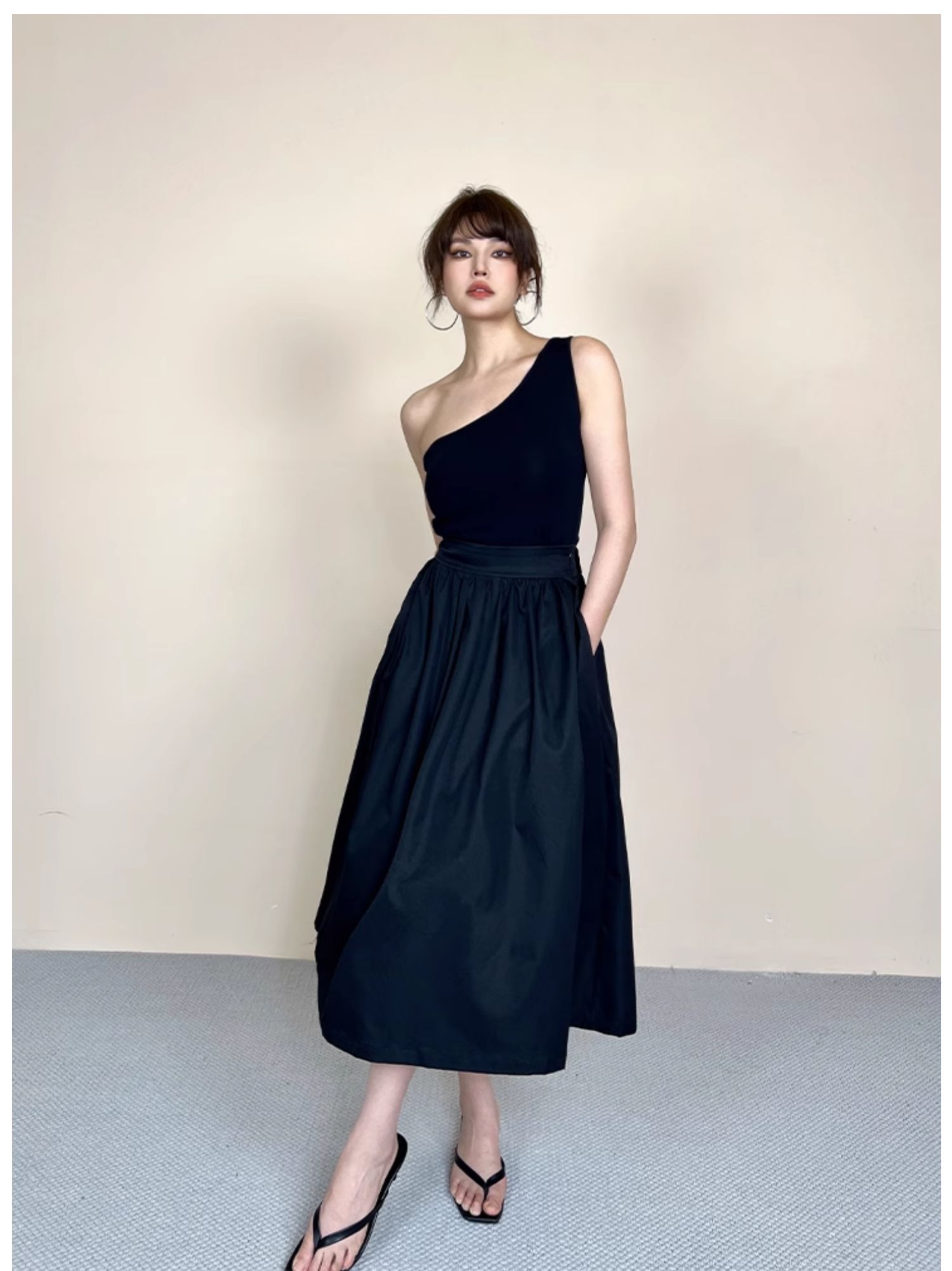 米米小姐2025夏季新品薄款中長款高腰黑色復古百褶a字半身裙顯瘦