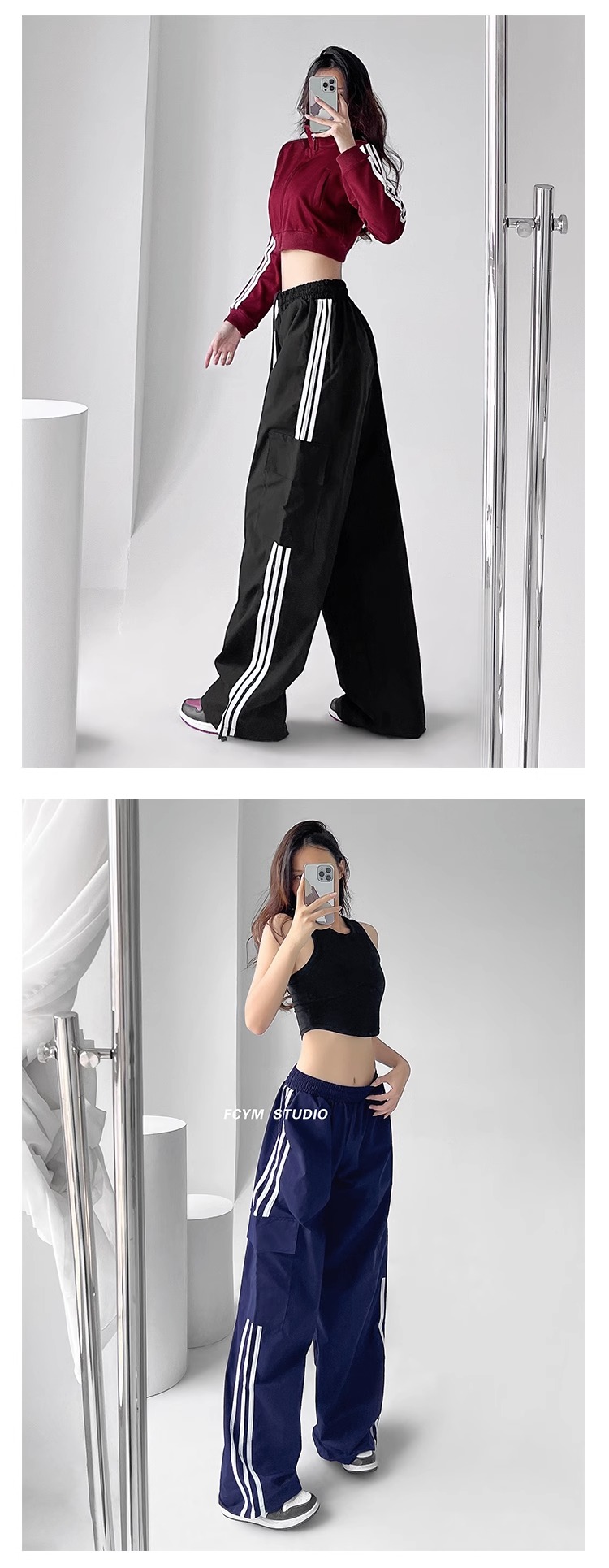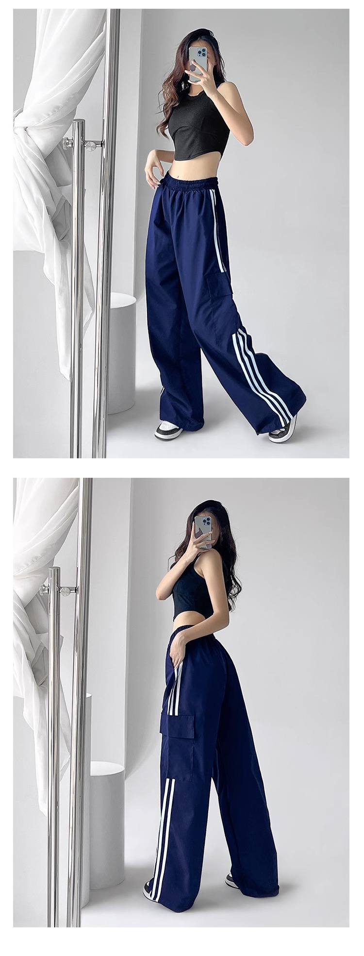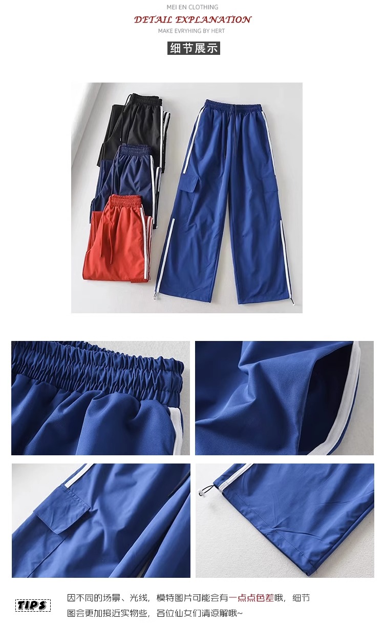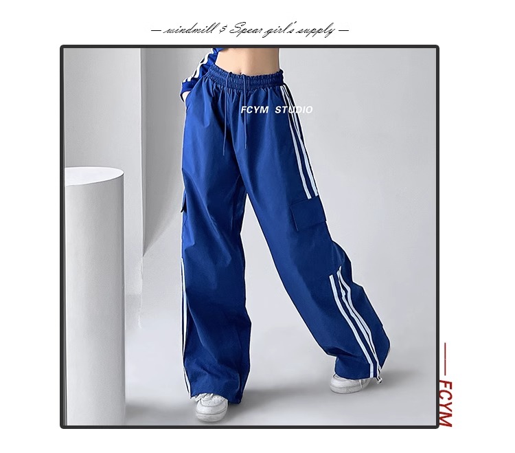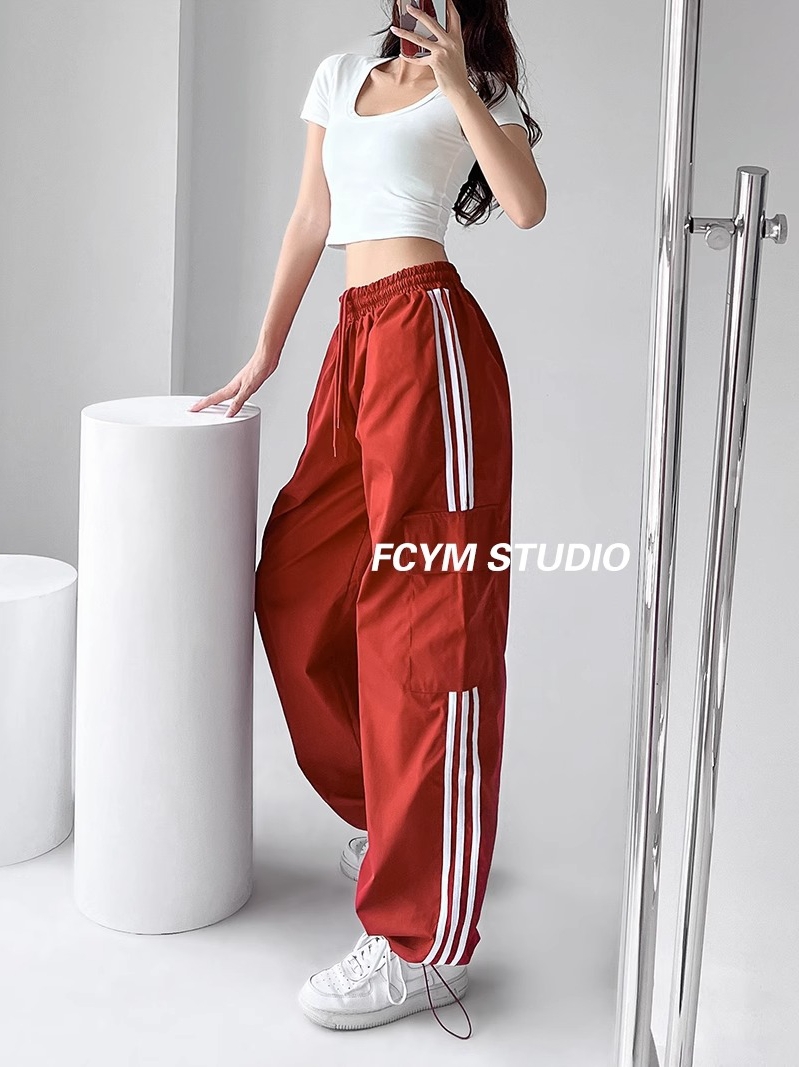 美式工裝褲女小個子jazz舞復古潮牌直筒濶腿休閒褲寬松條紋運動褲