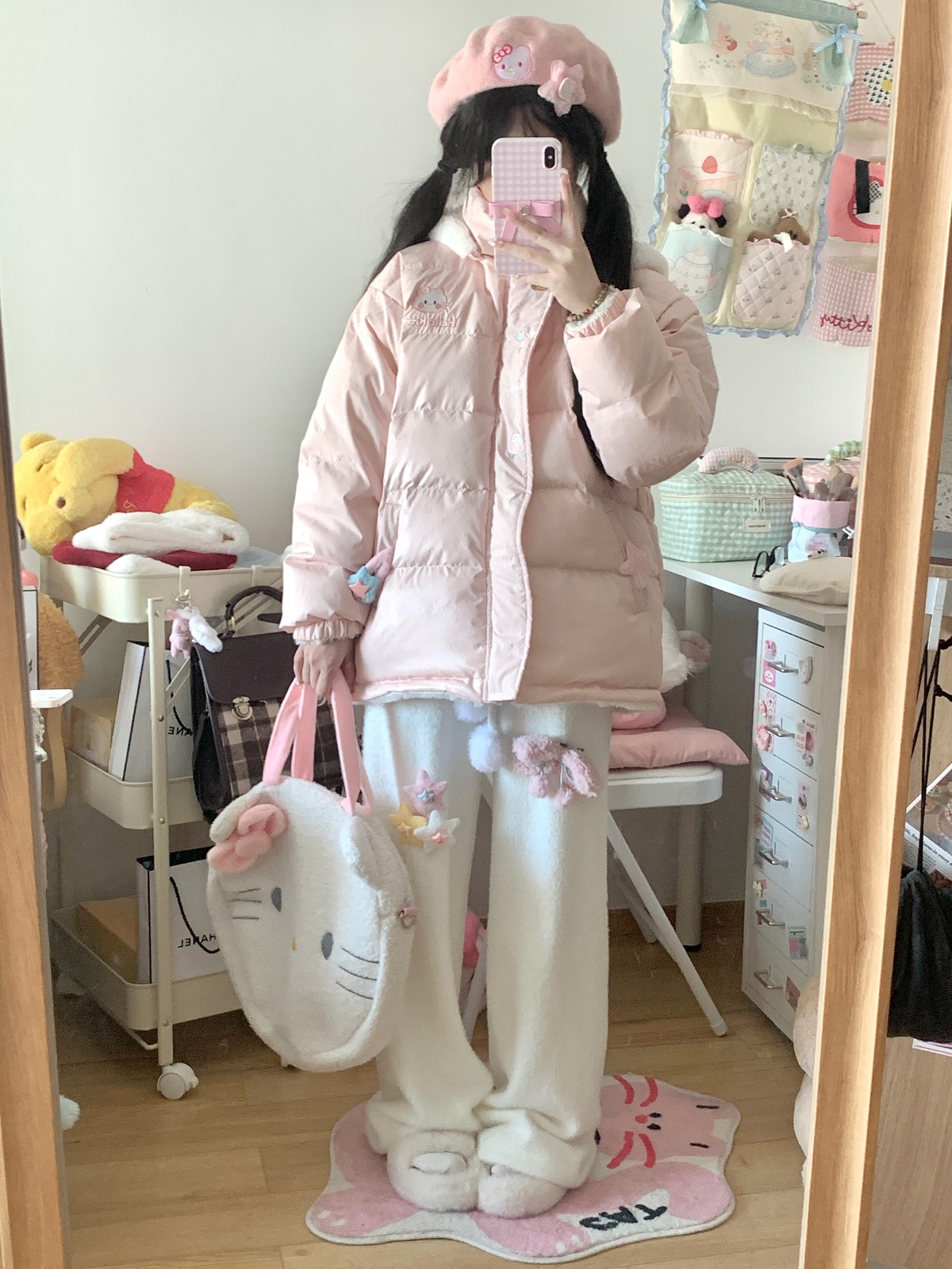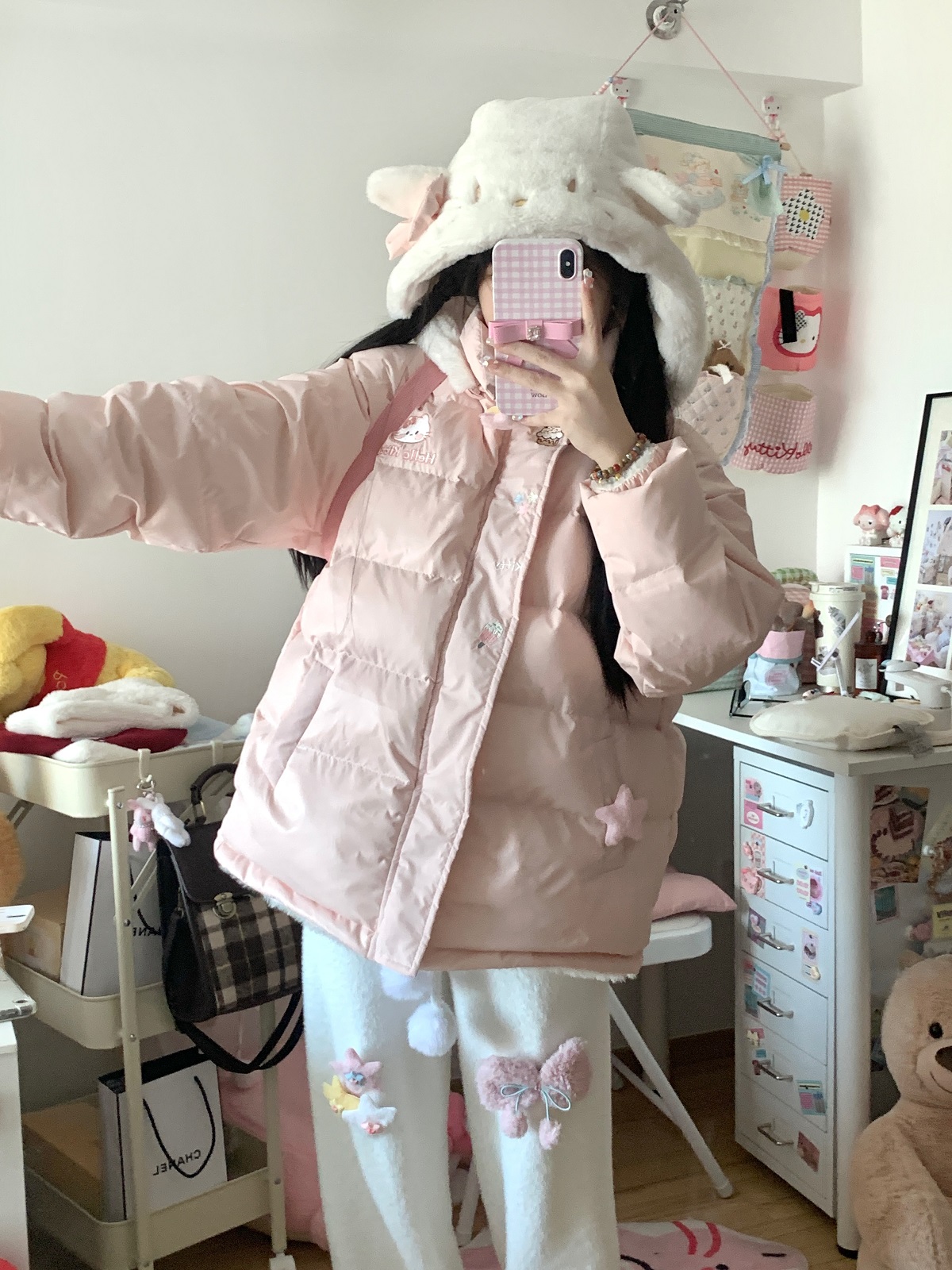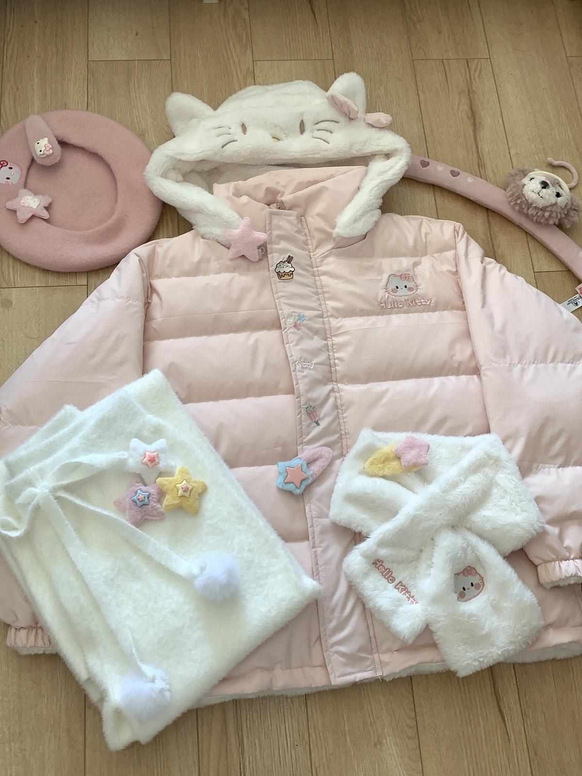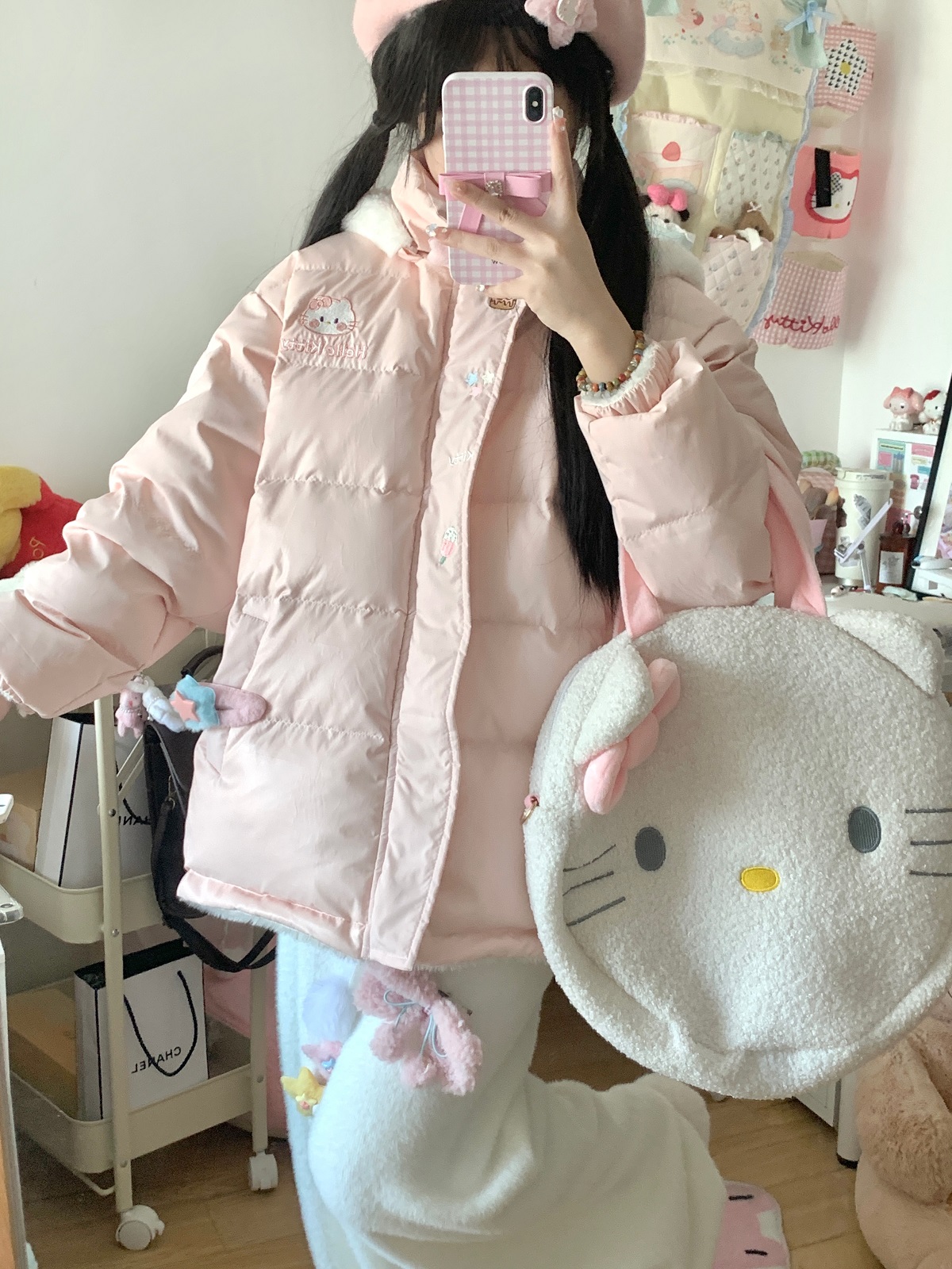 原創可愛kt貓加厚粉色外套國標白鴨絨雙面羽絨服女毛絨絨連帽開衫