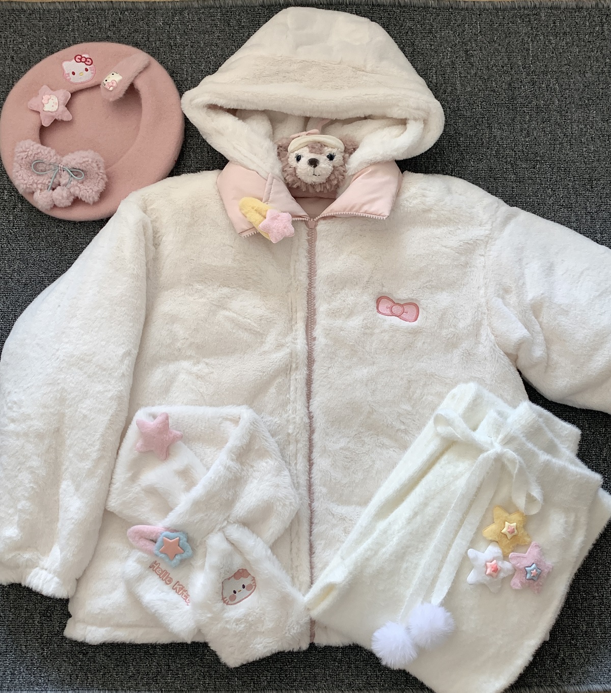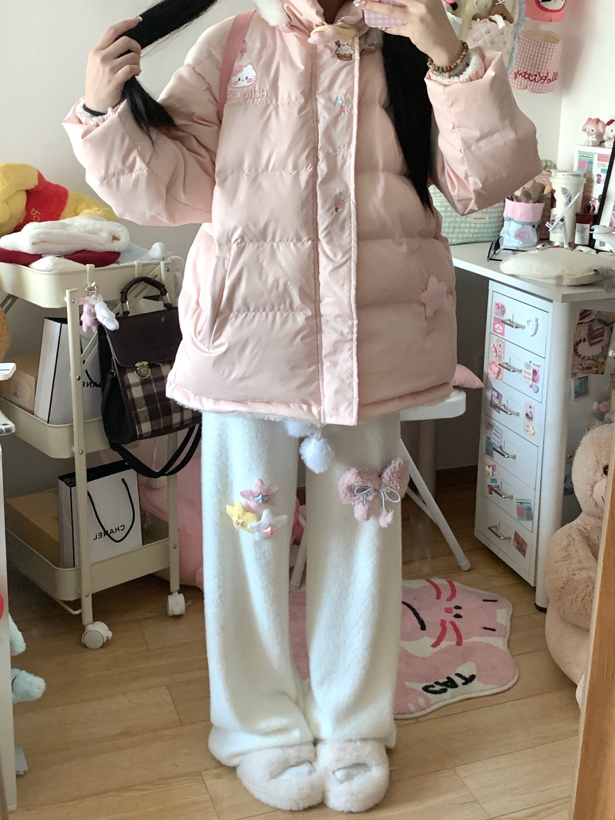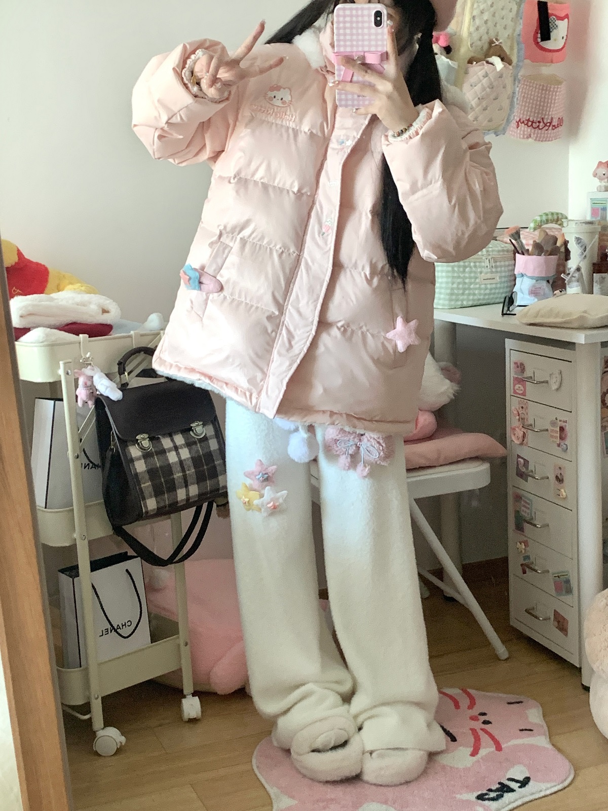 原創可愛kt貓加厚粉色外套國標白鴨絨雙面羽絨服女毛絨絨連帽開衫