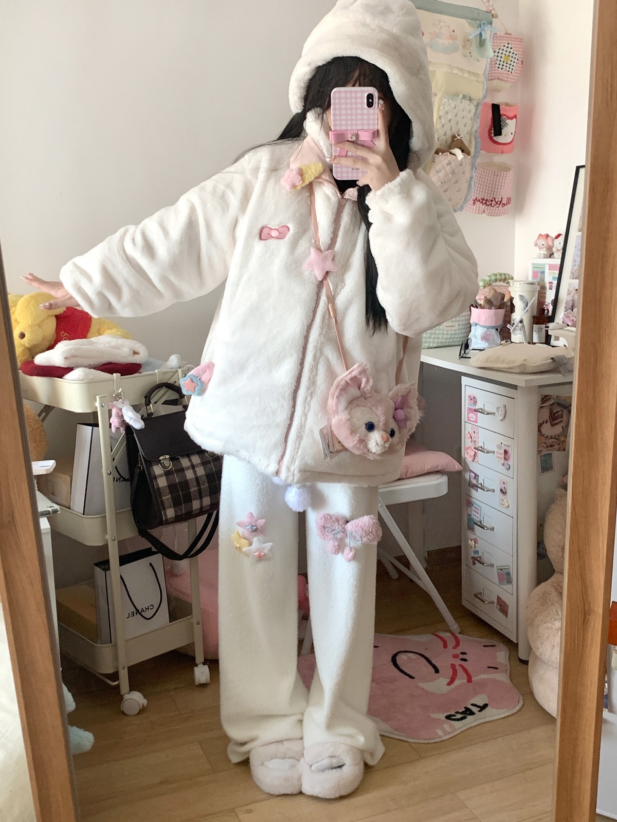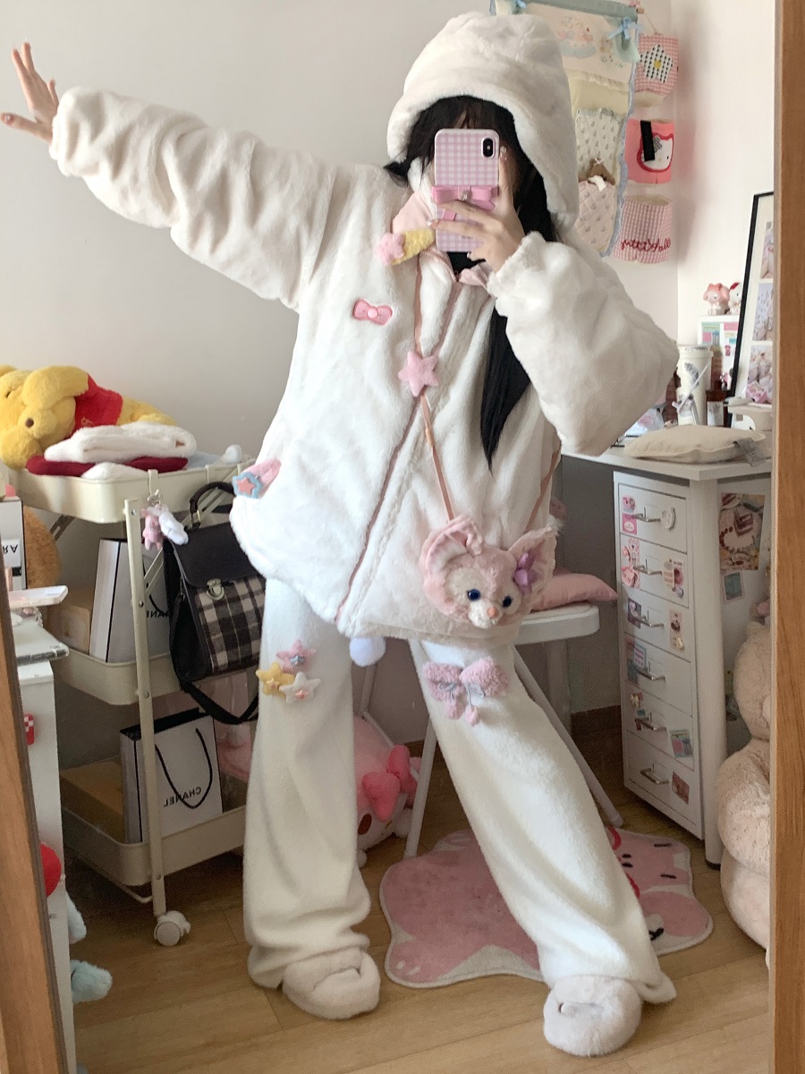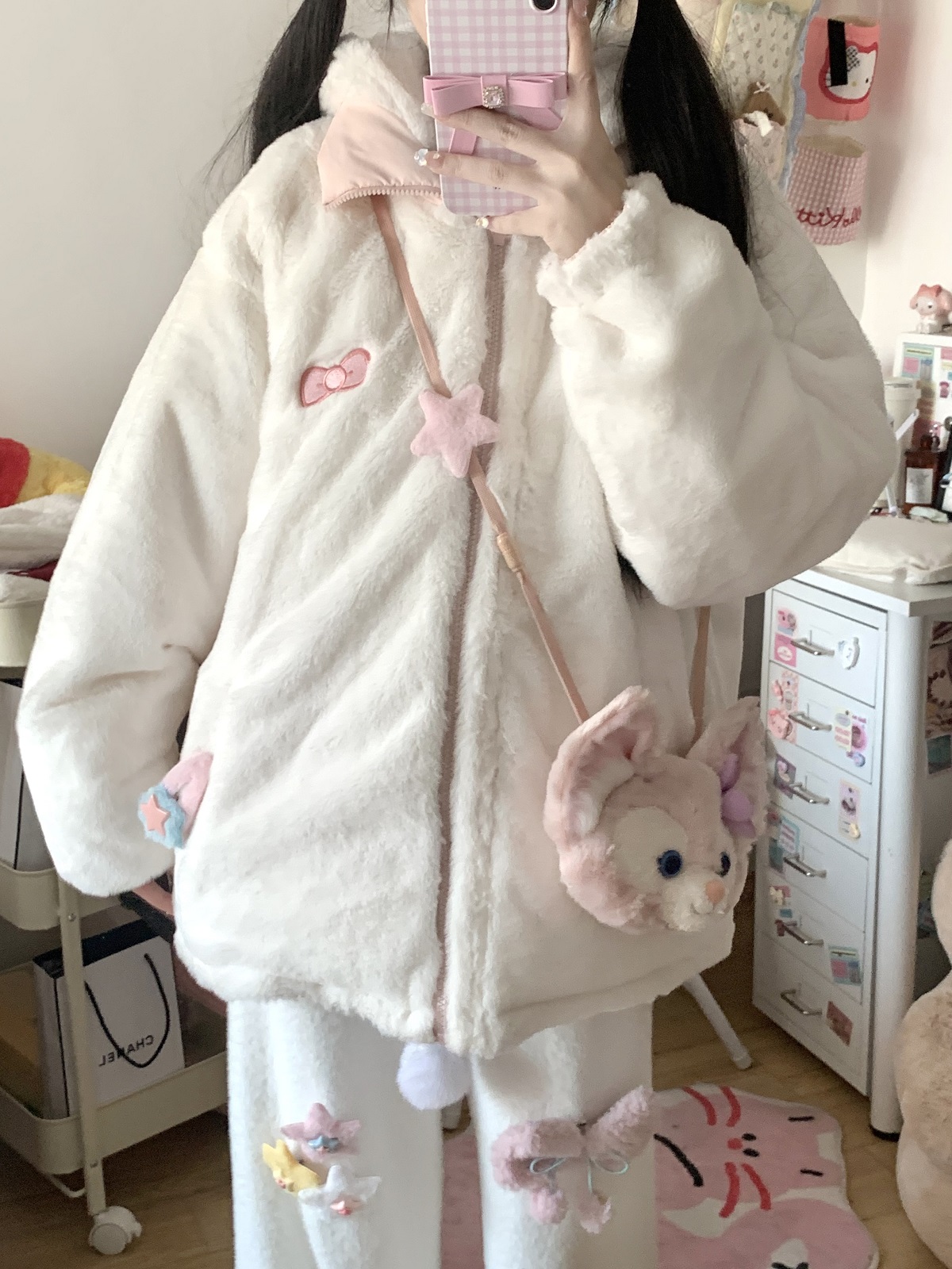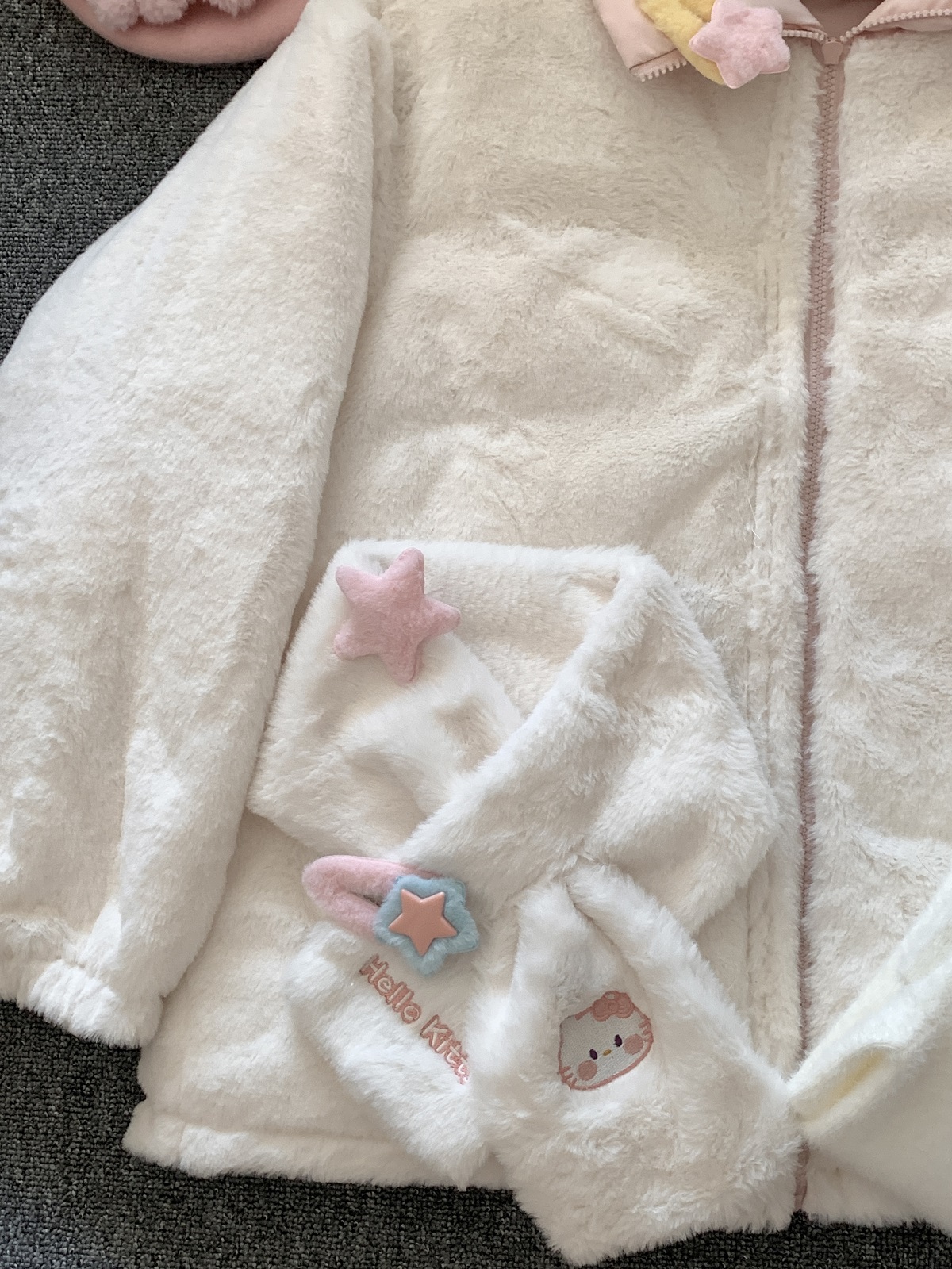 原創可愛kt貓加厚粉色外套國標白鴨絨雙面羽絨服女毛絨絨連帽開衫
