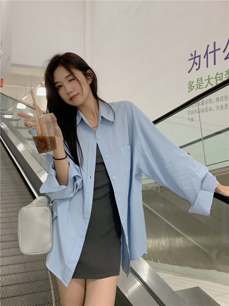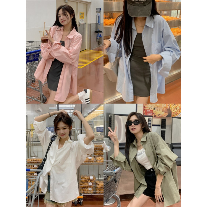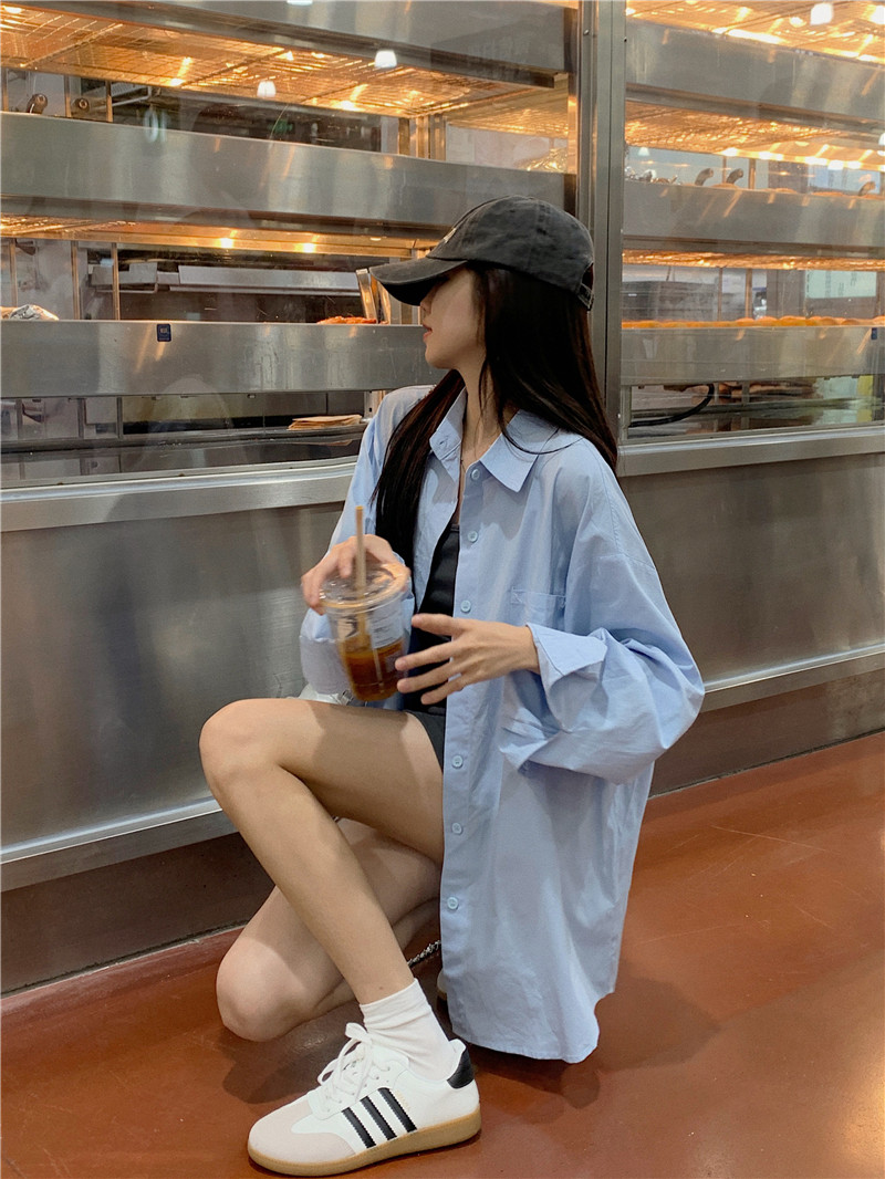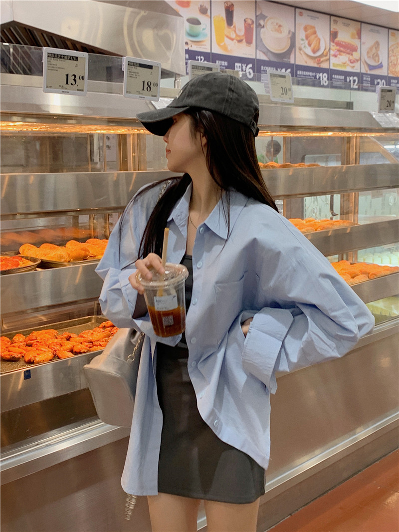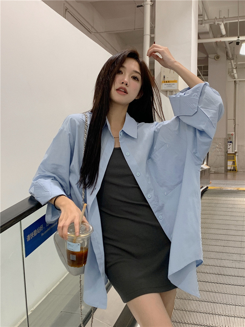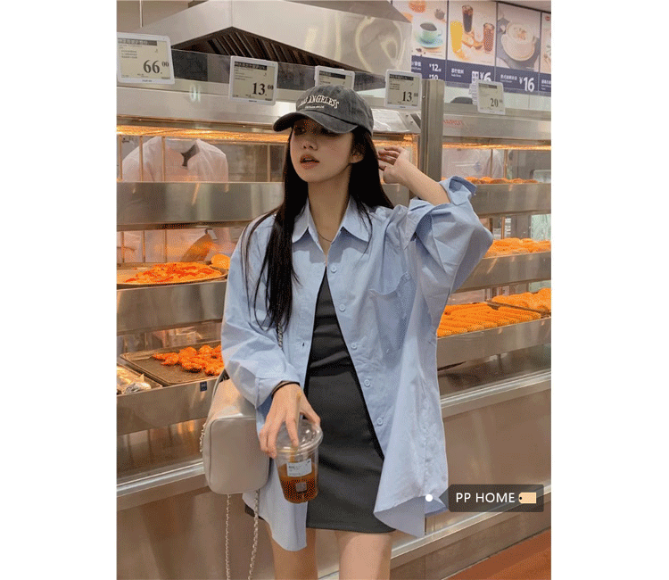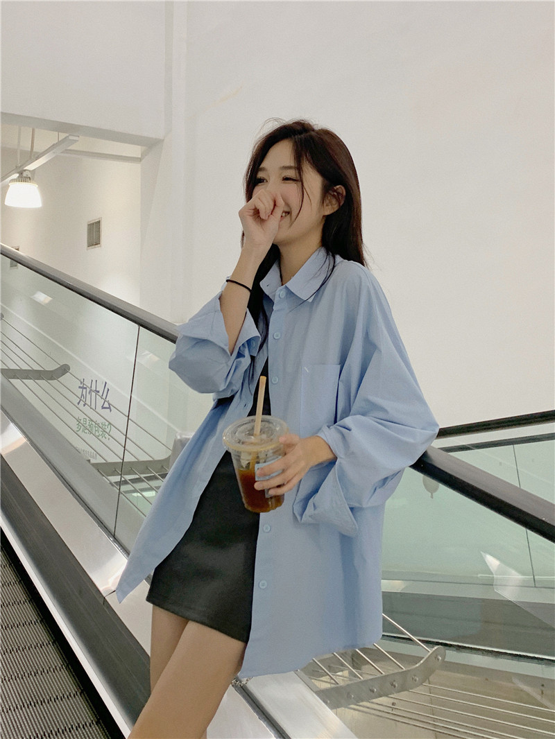 PPHOME出街乖寶~純色寬松百搭休閒夏季藍色長袖防曬襯衫襯衣外套