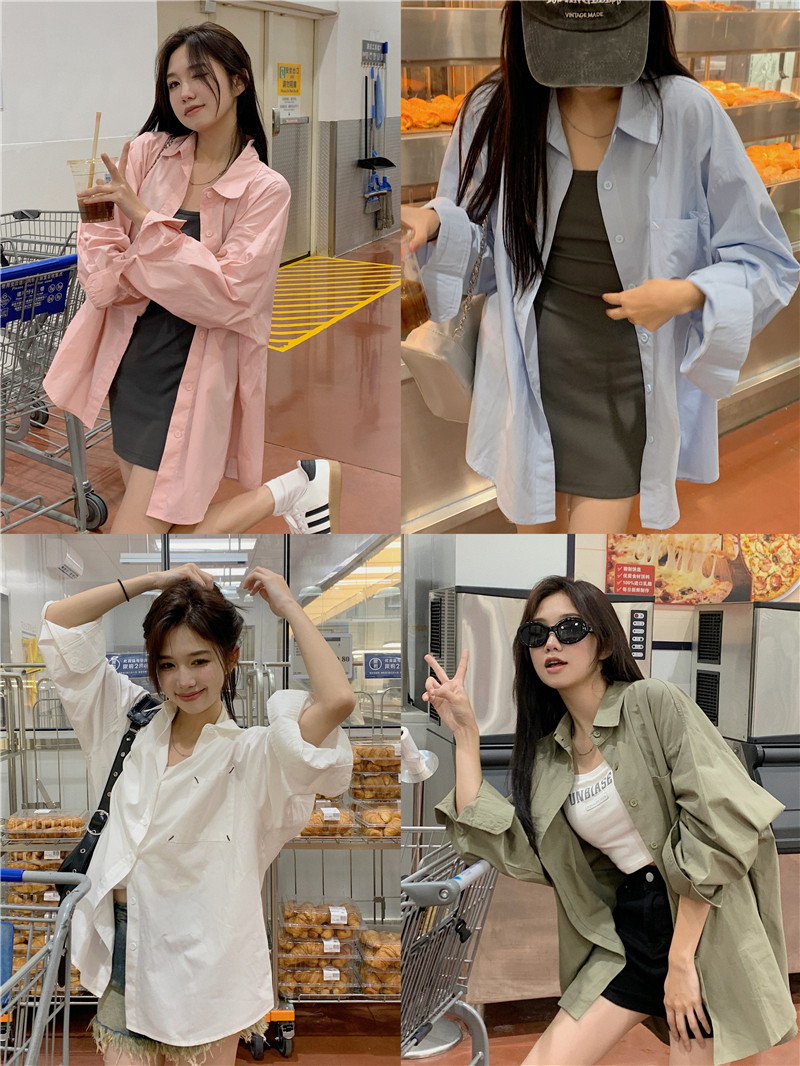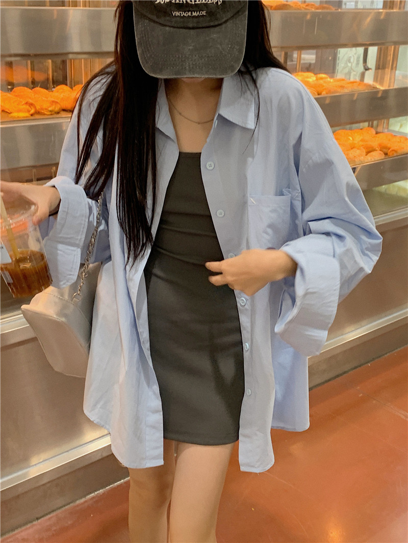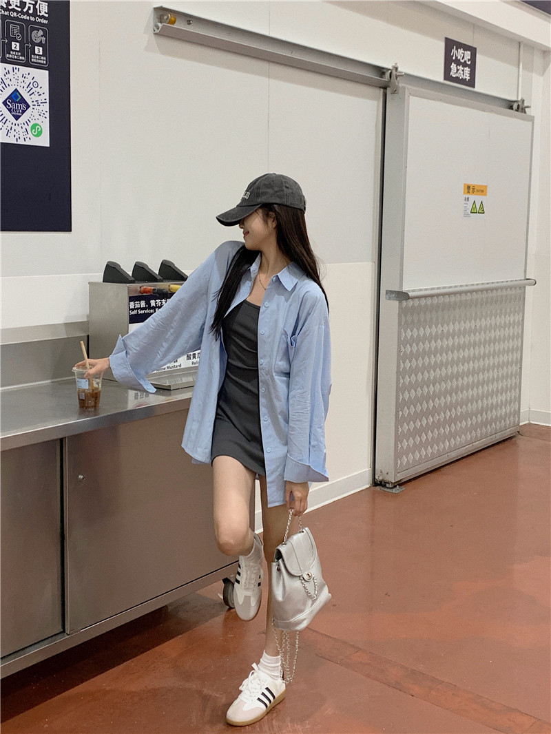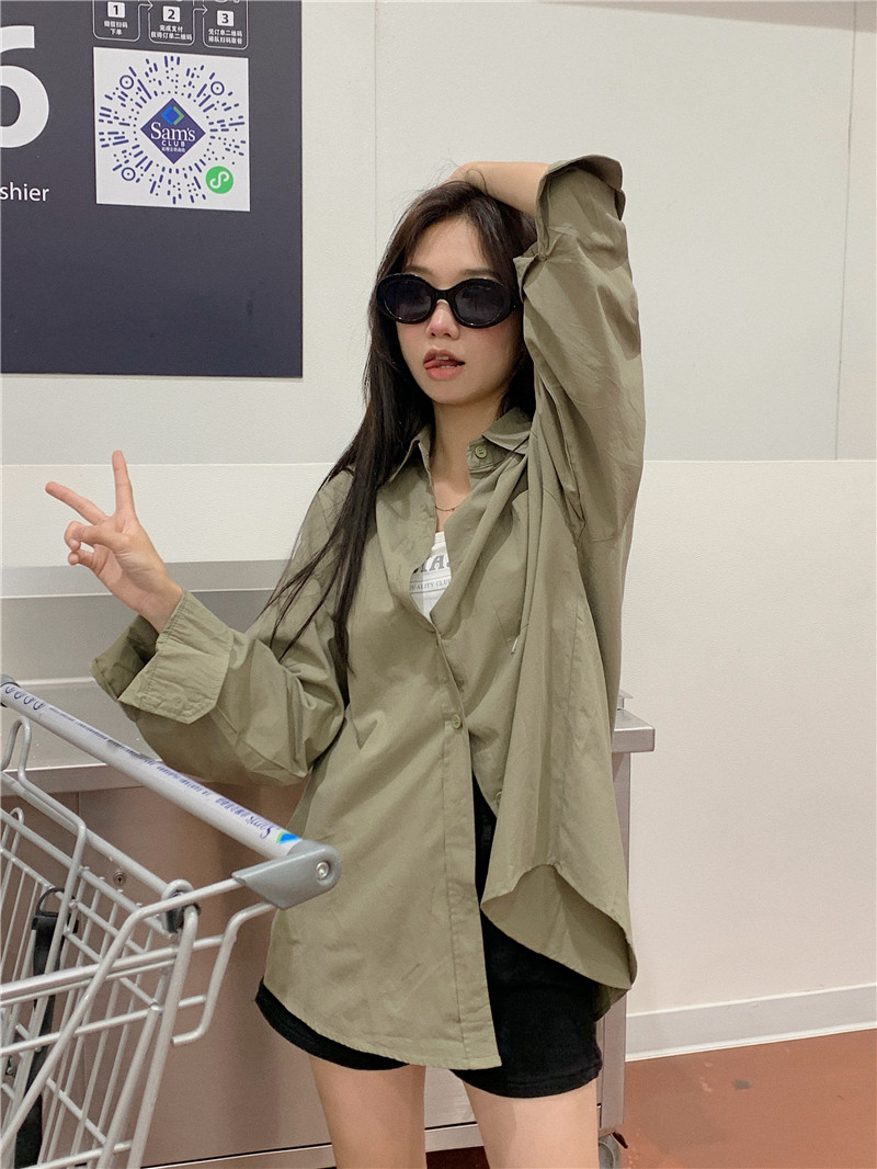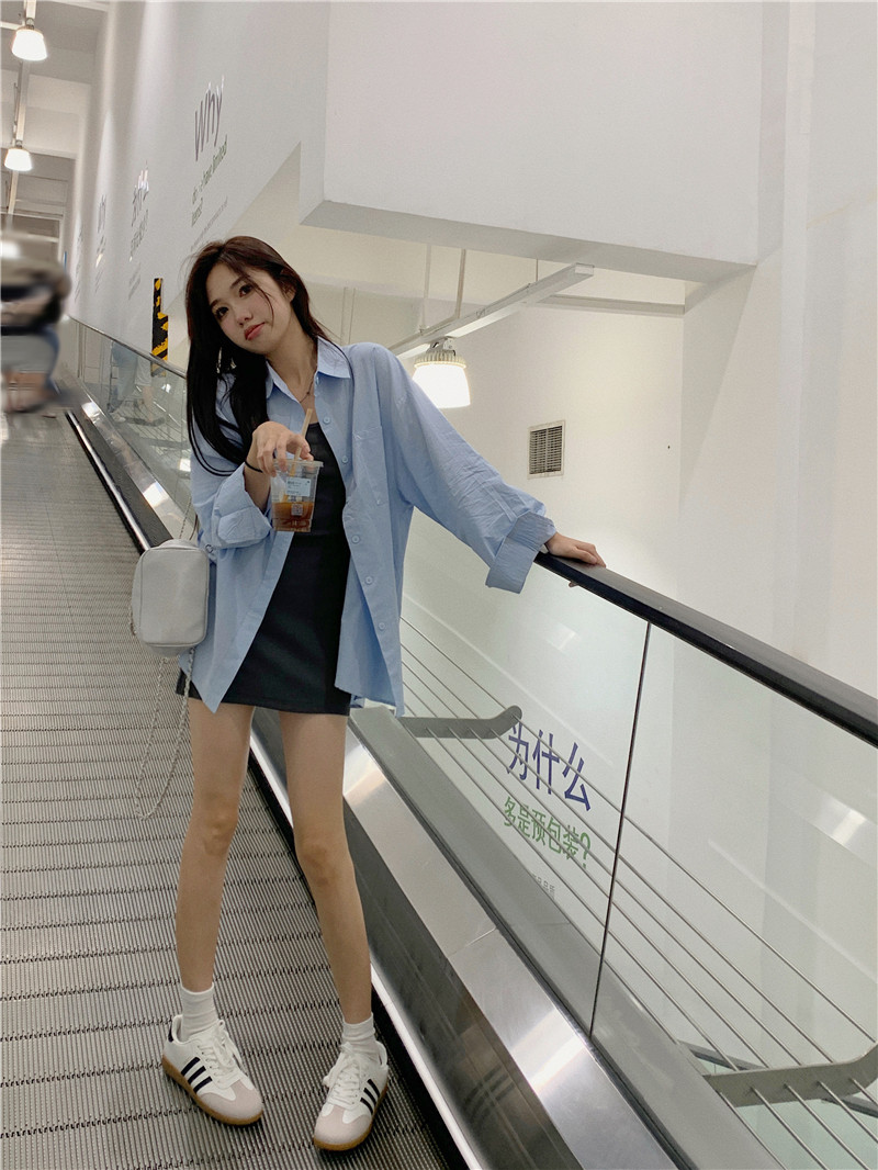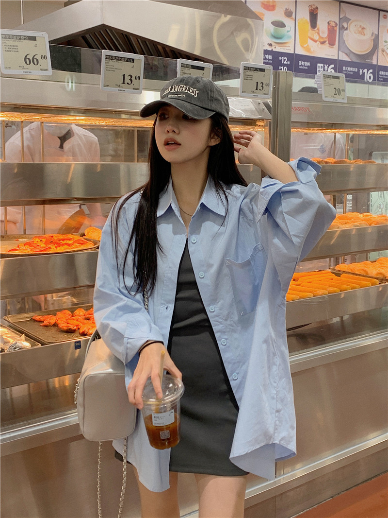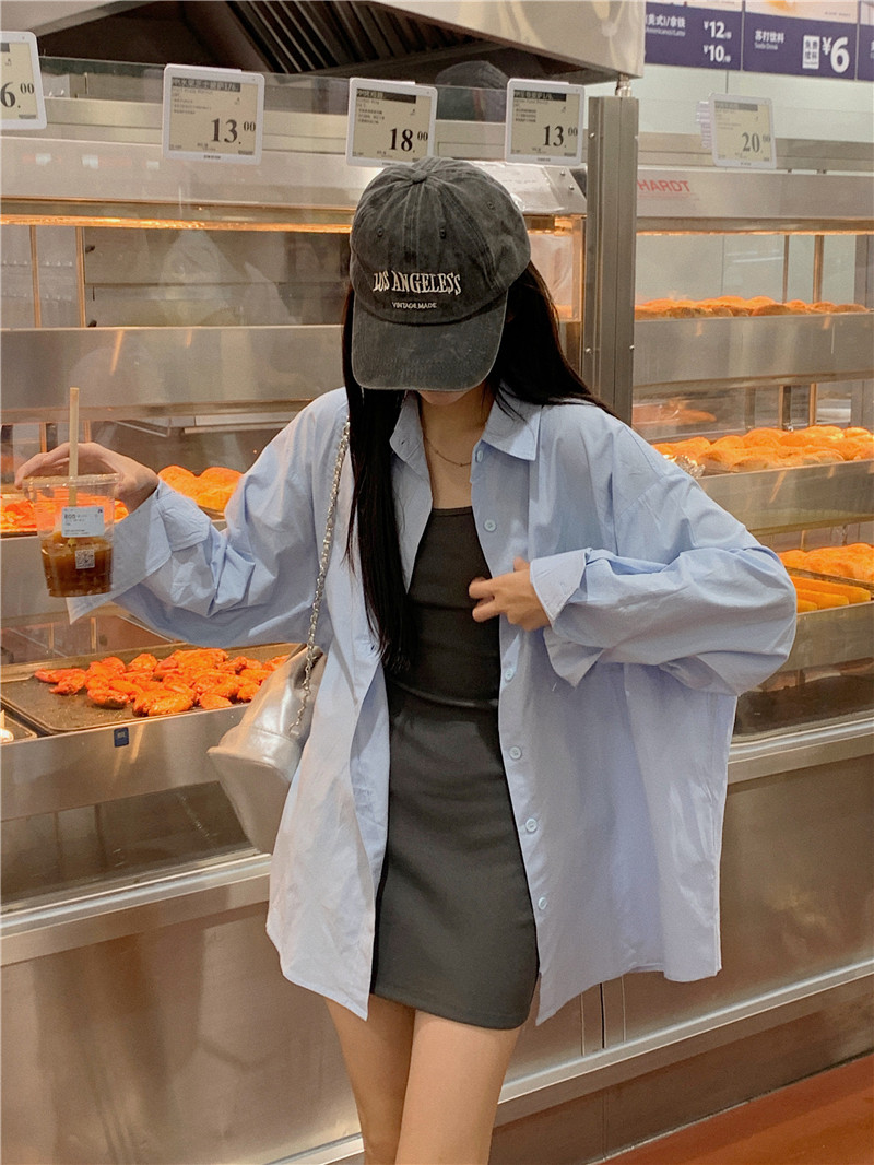 PPHOME出街乖寶~純色寬松百搭休閒夏季藍色長袖防曬襯衫襯衣外套