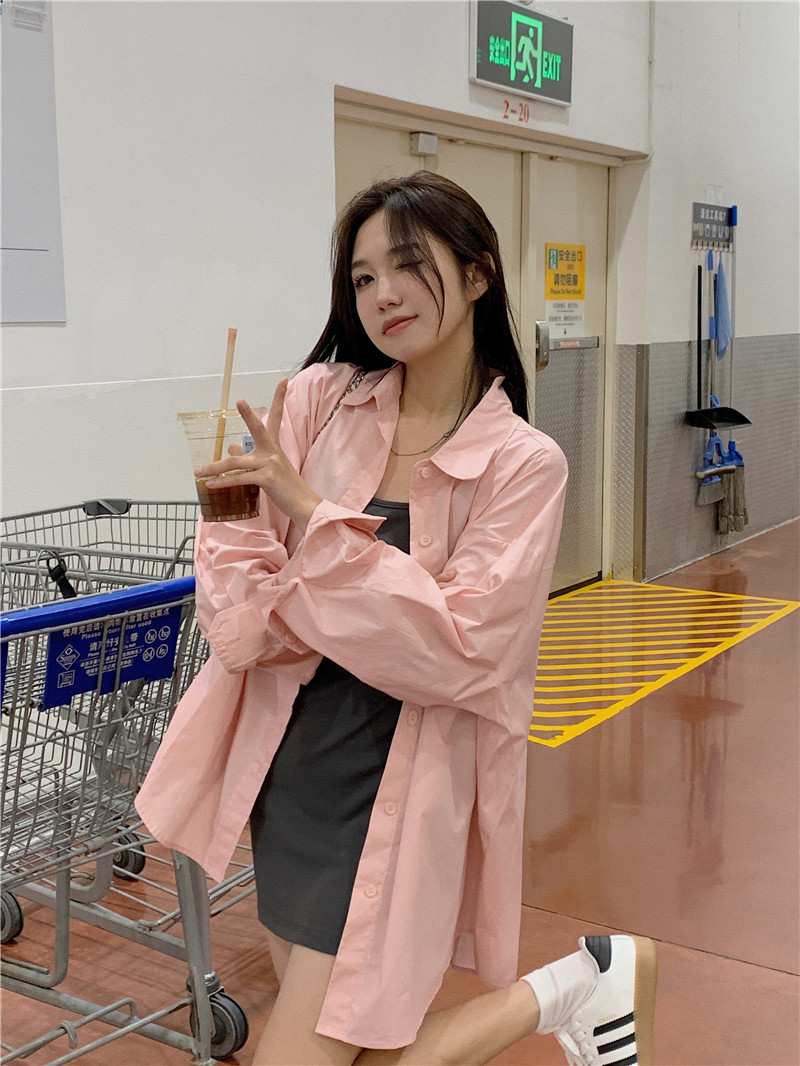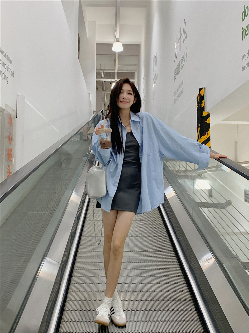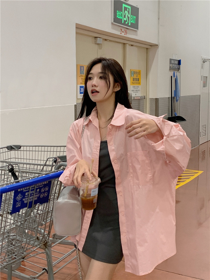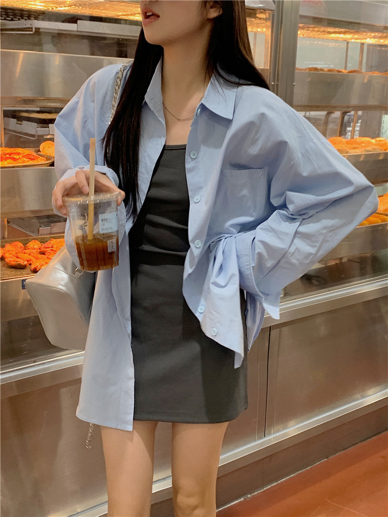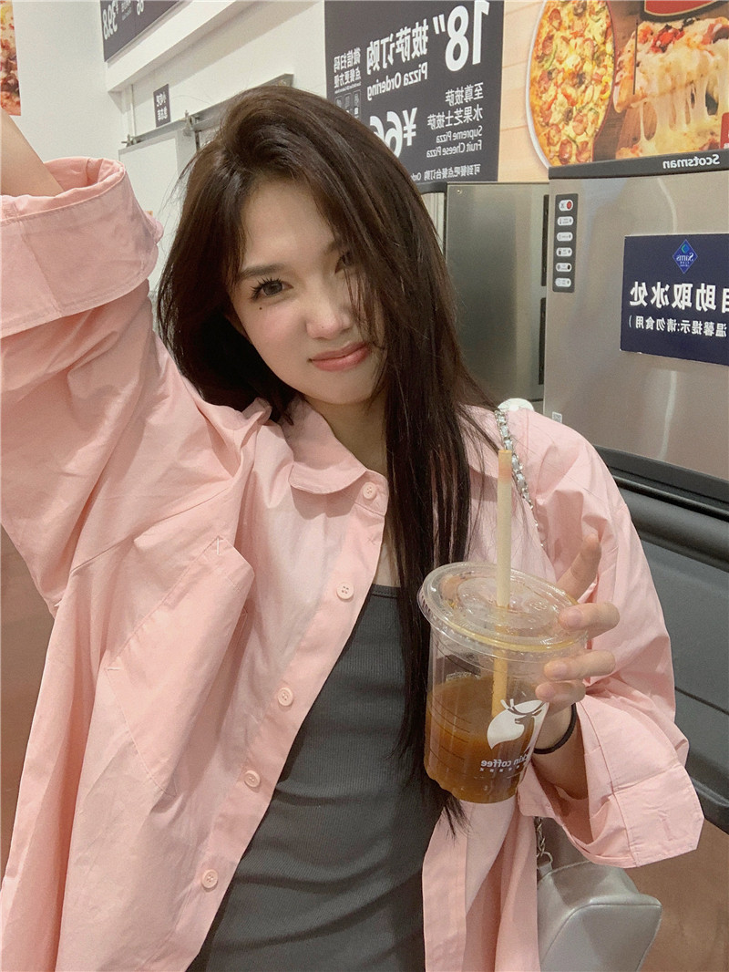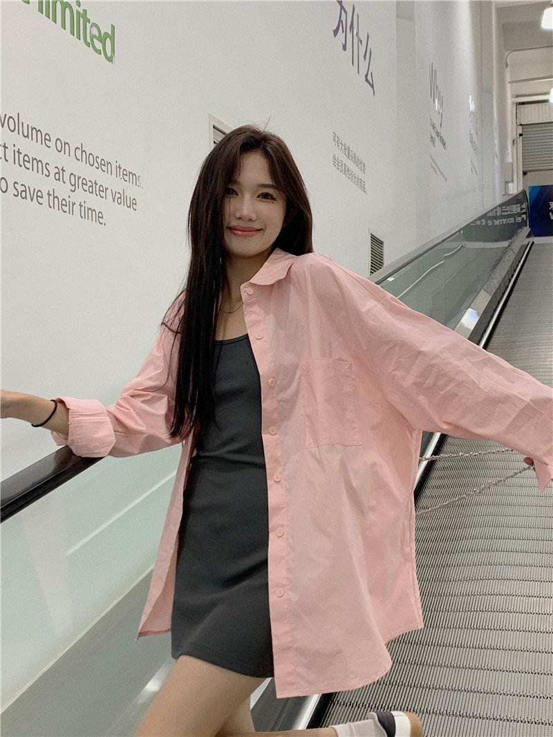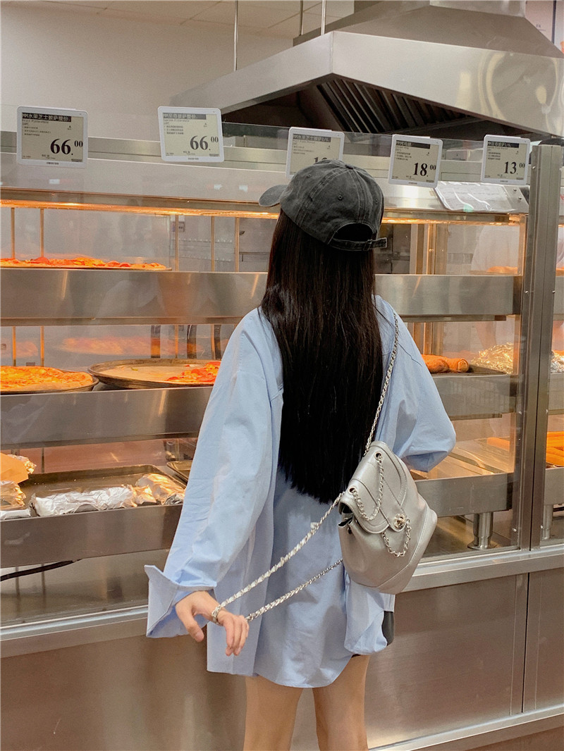 PPHOME出街乖寶~純色寬松百搭休閒夏季藍色長袖防曬襯衫襯衣外套