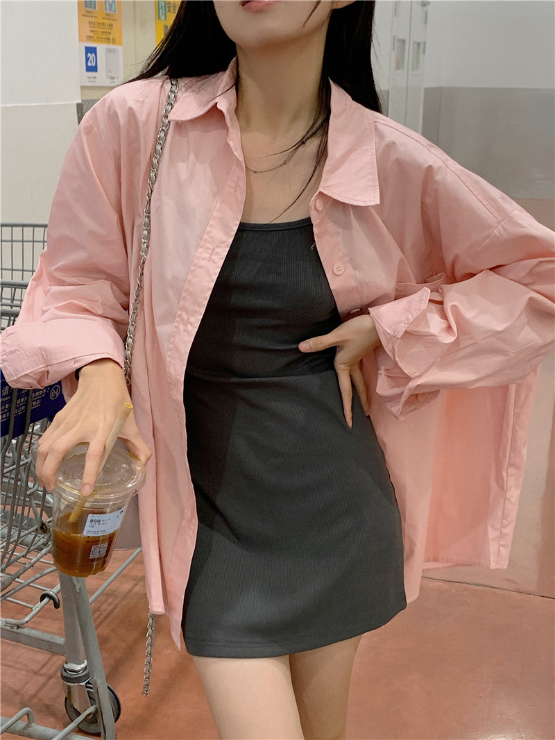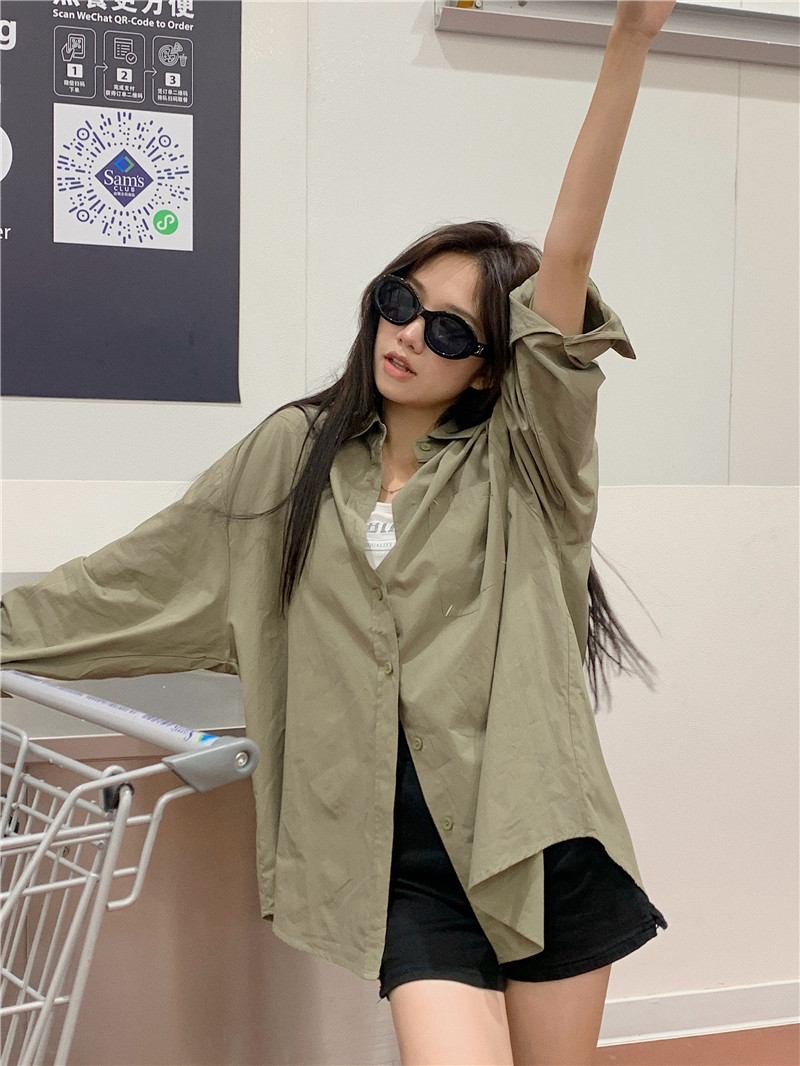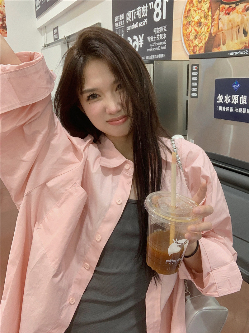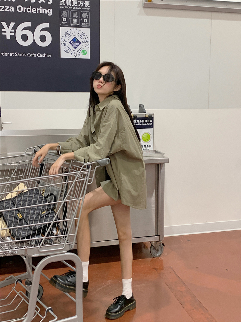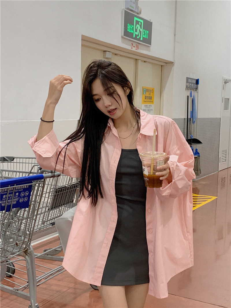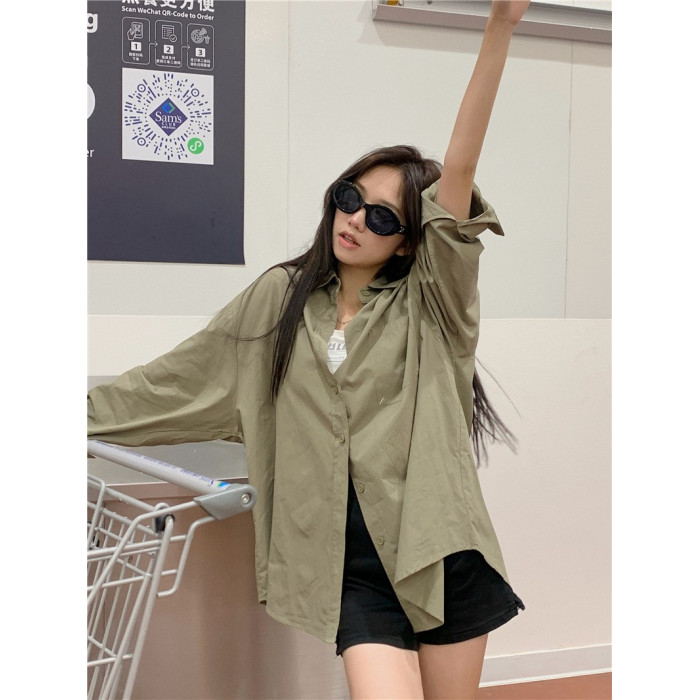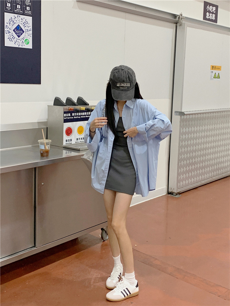 PPHOME出街乖寶~純色寬松百搭休閒夏季藍色長袖防曬襯衫襯衣外套