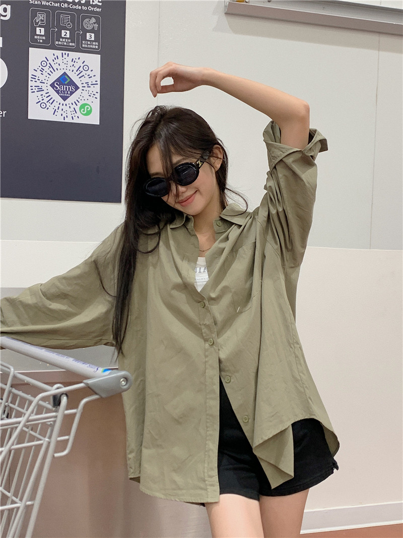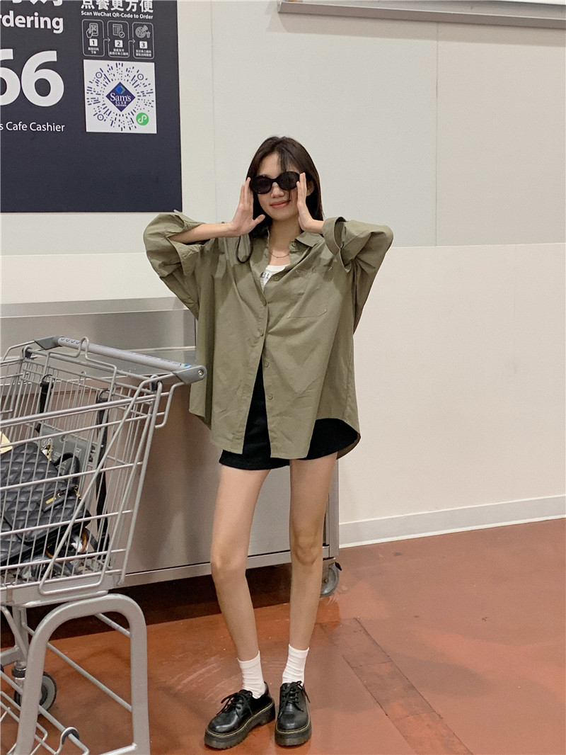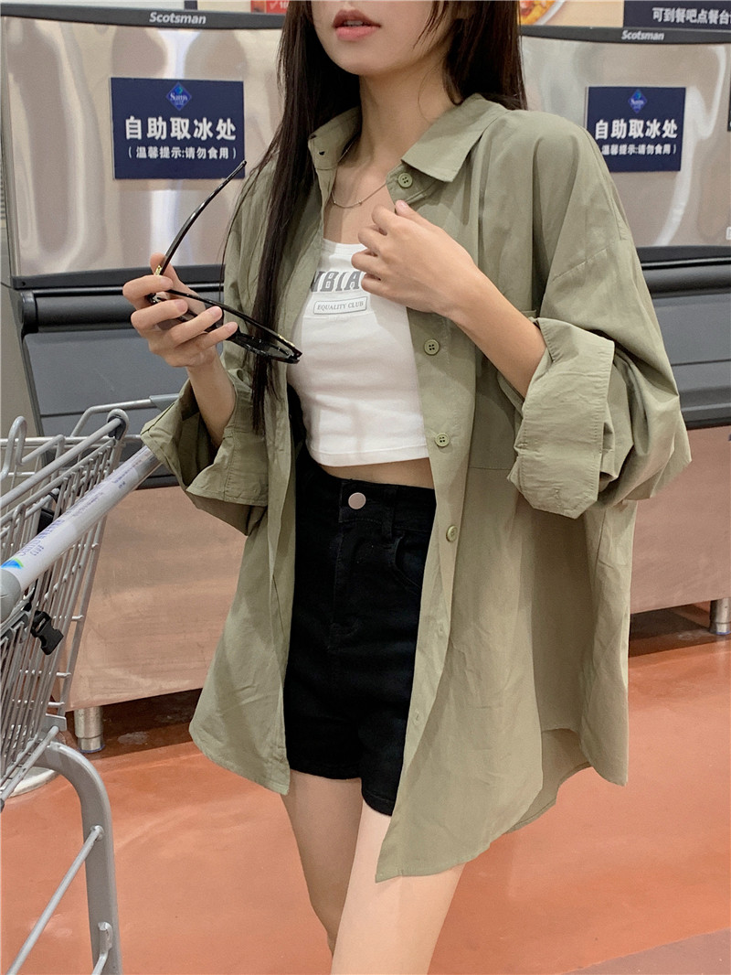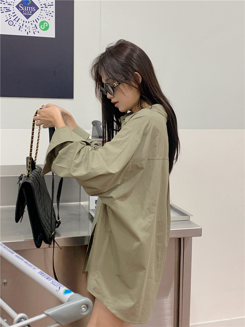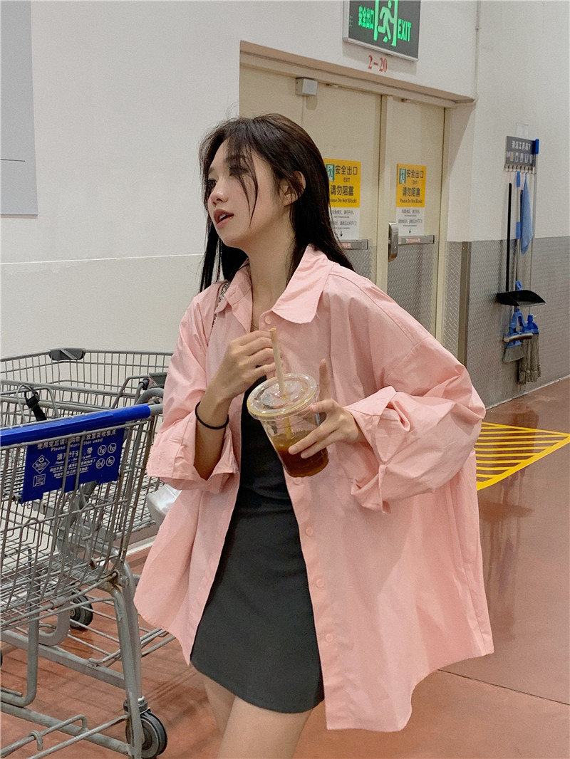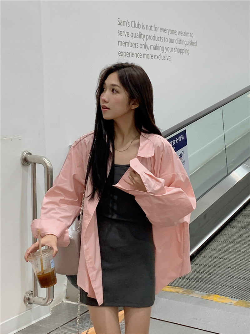 PPHOME出街乖寶~純色寬松百搭休閒夏季藍色長袖防曬襯衫襯衣外套