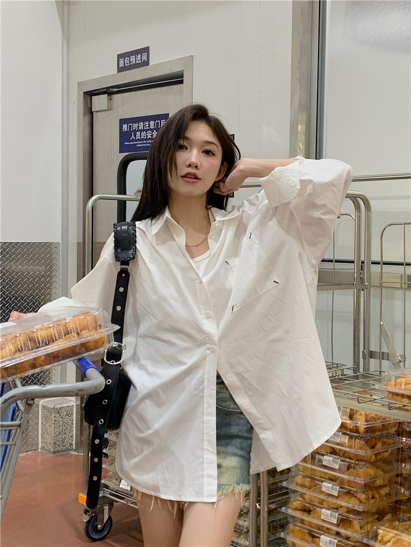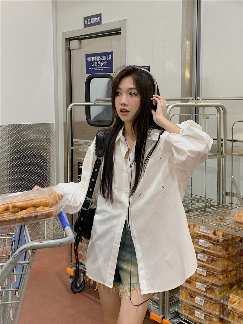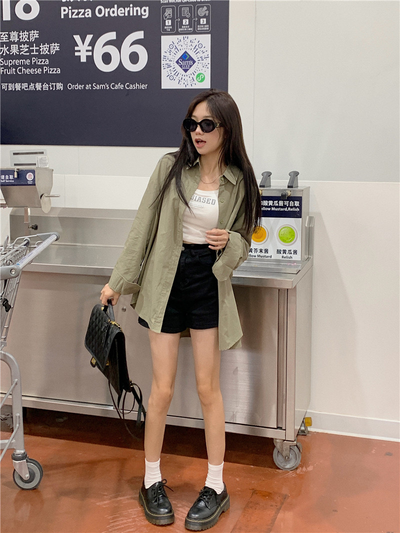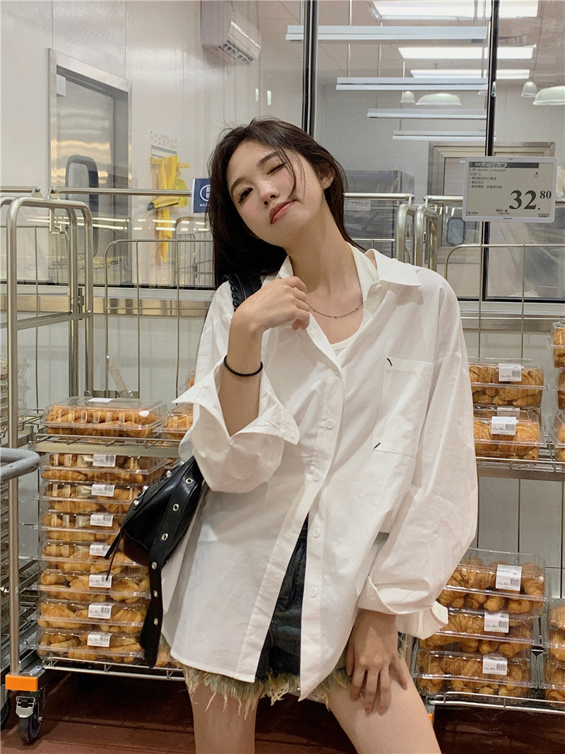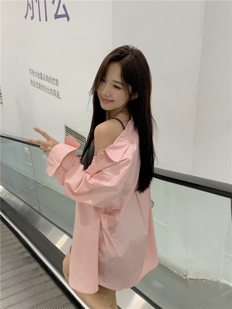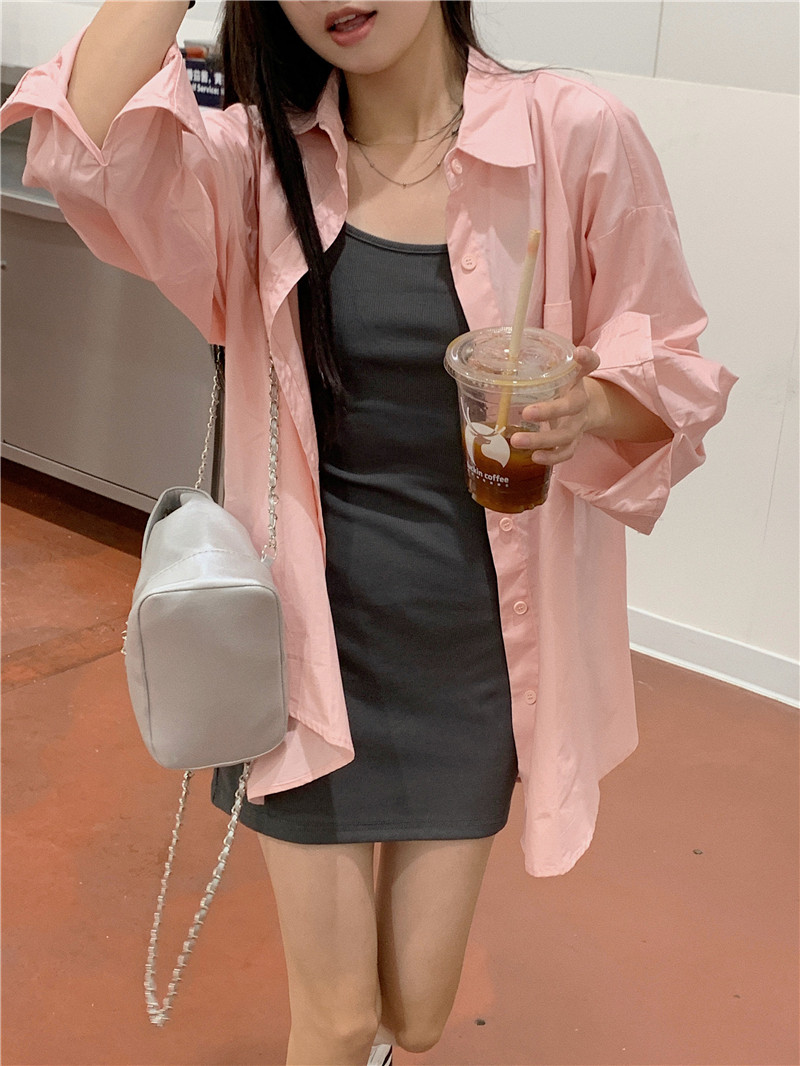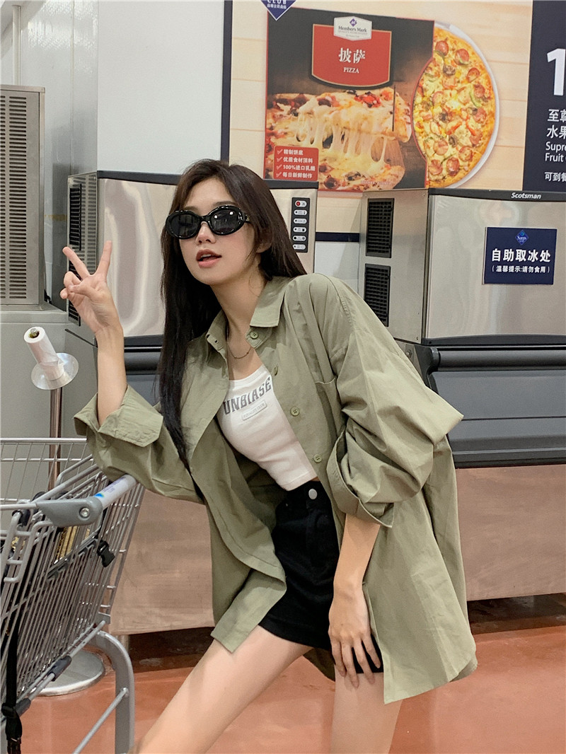 PPHOME出街乖寶~純色寬松百搭休閒夏季藍色長袖防曬襯衫襯衣外套