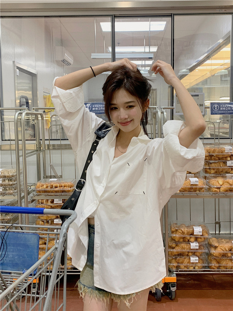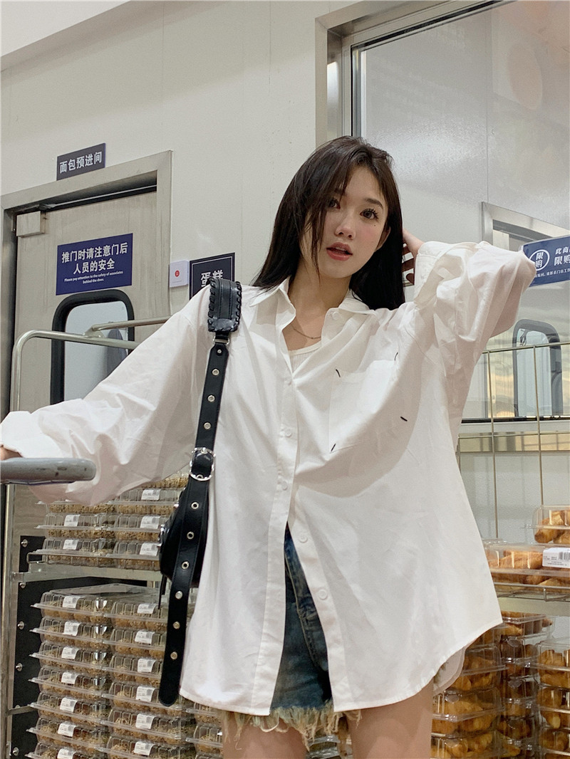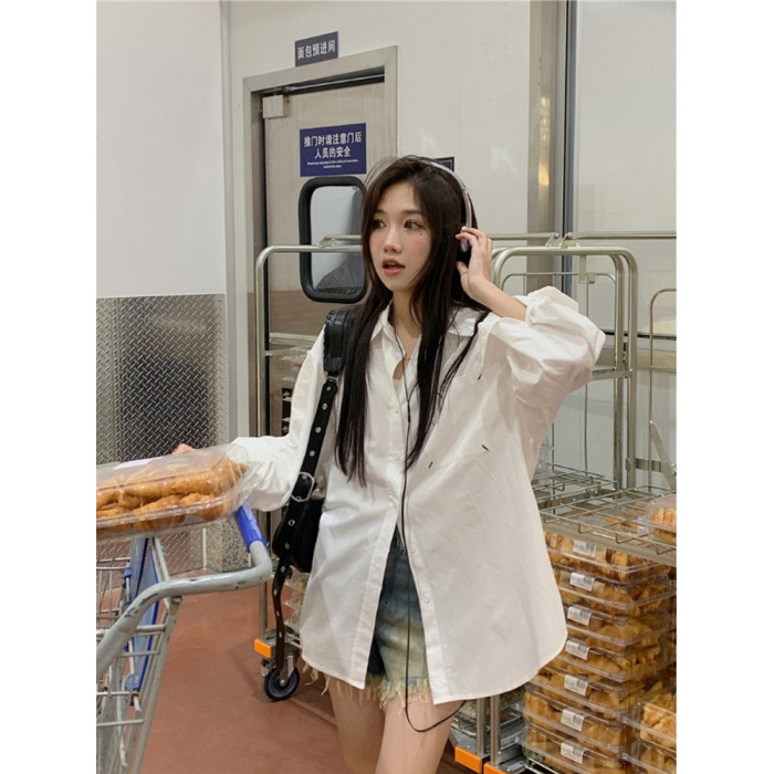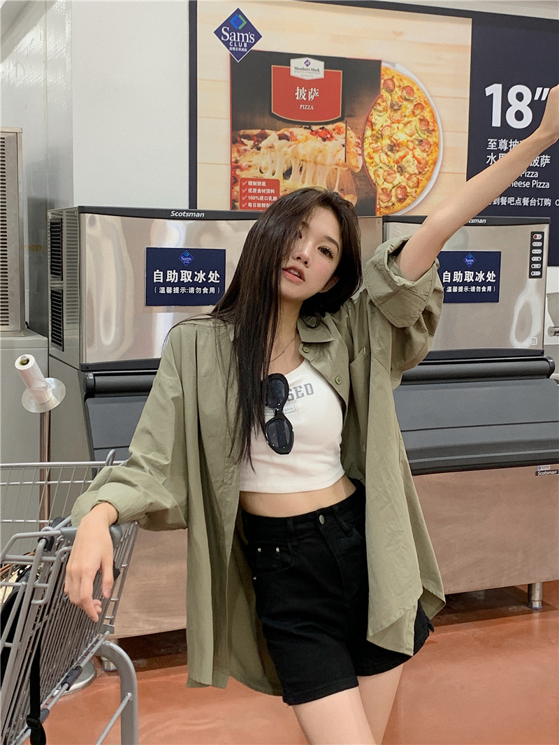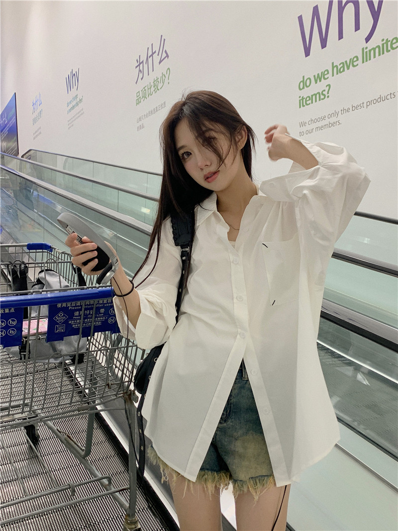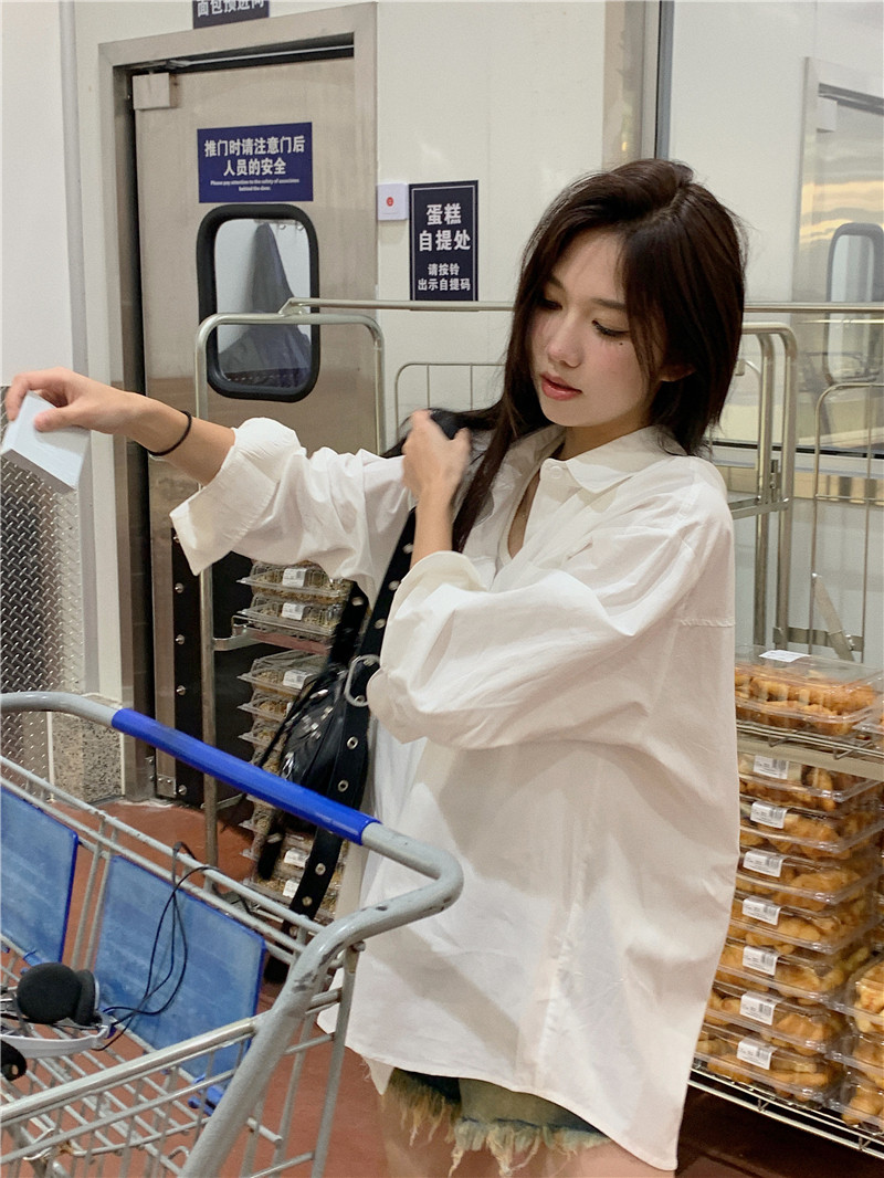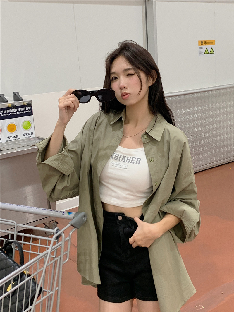 PPHOME出街乖寶~純色寬松百搭休閒夏季藍色長袖防曬襯衫襯衣外套