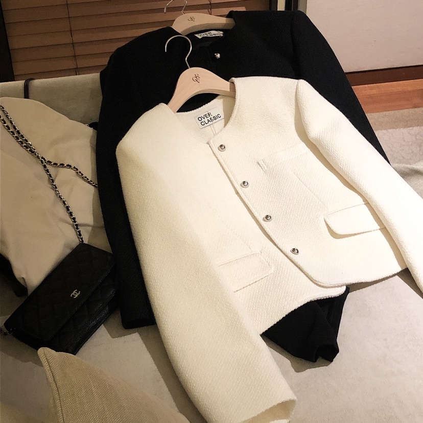 秋冬季女裝新款黑色小香風西裝米白色短款毛呢料外套小個子上衣春