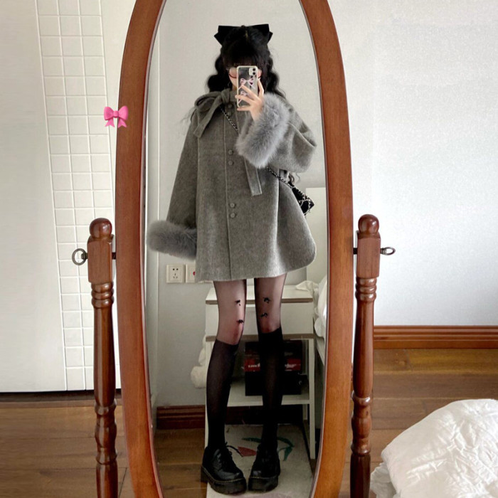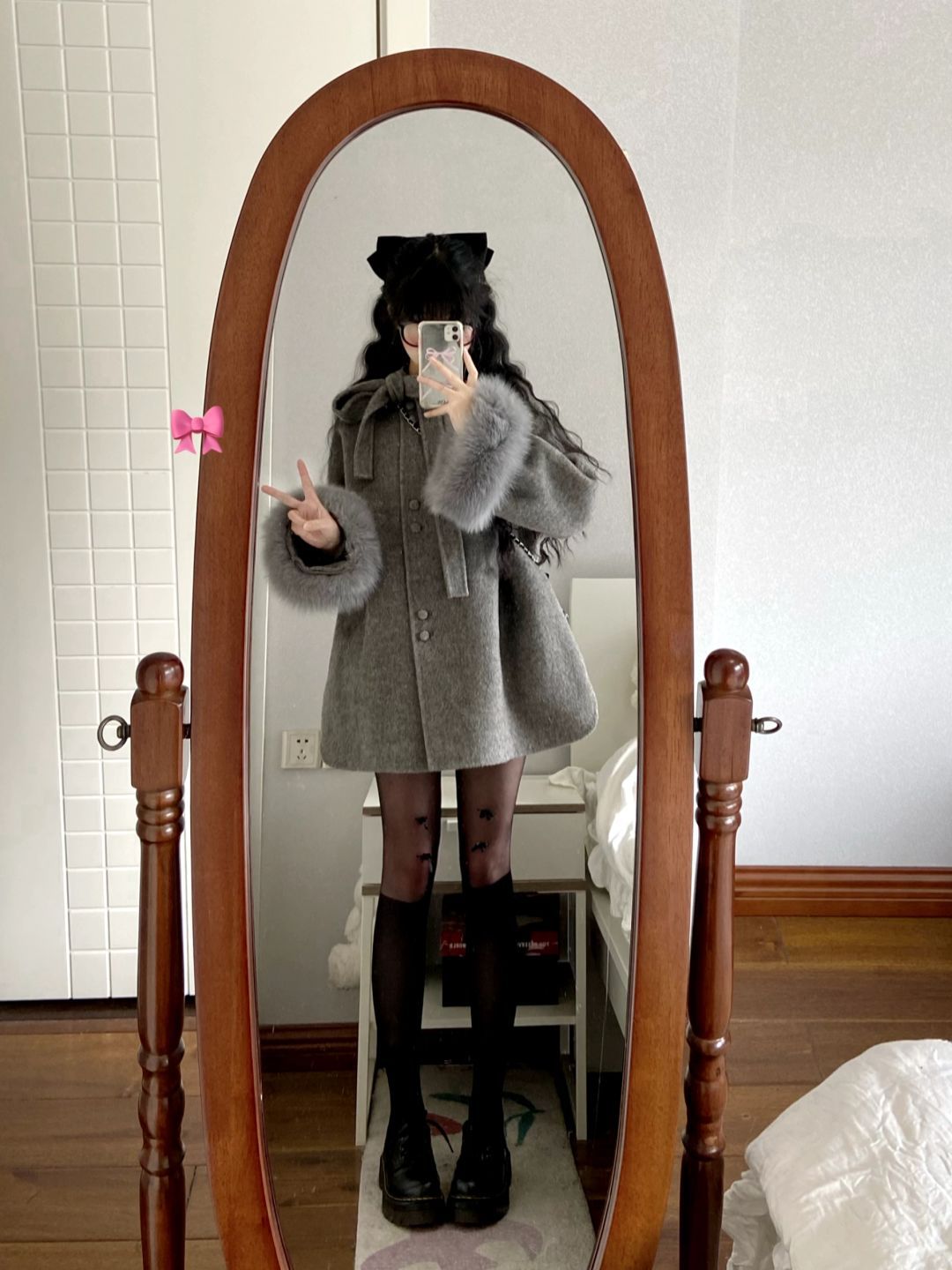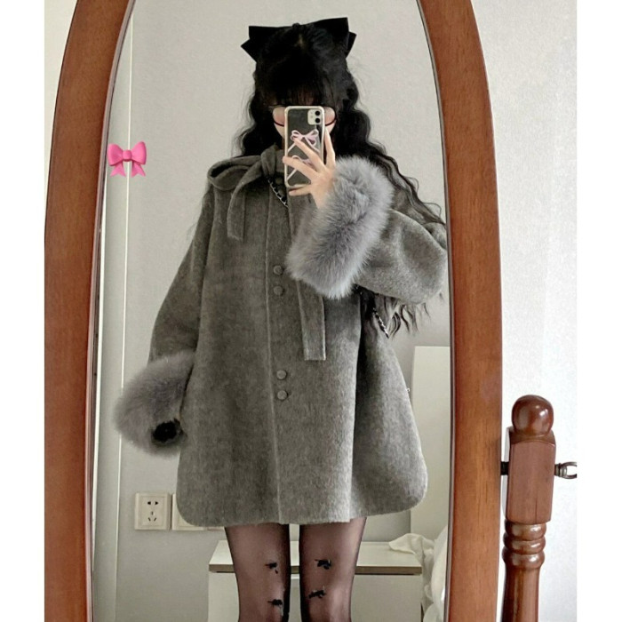 畱洋千金風雙面呢子鬭篷灰色大衣女初秋狐狸毛袖氣質名媛毛呢外套