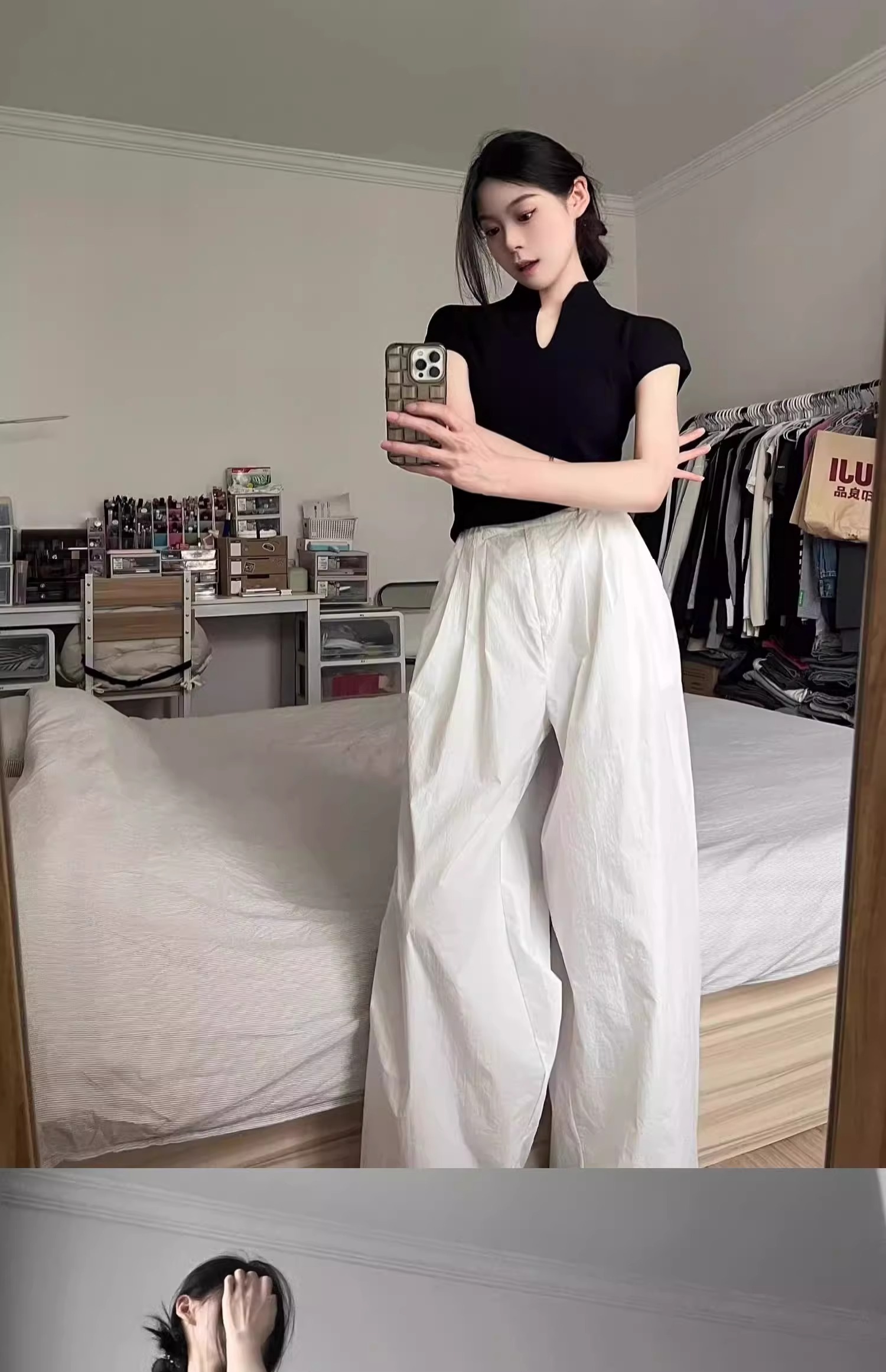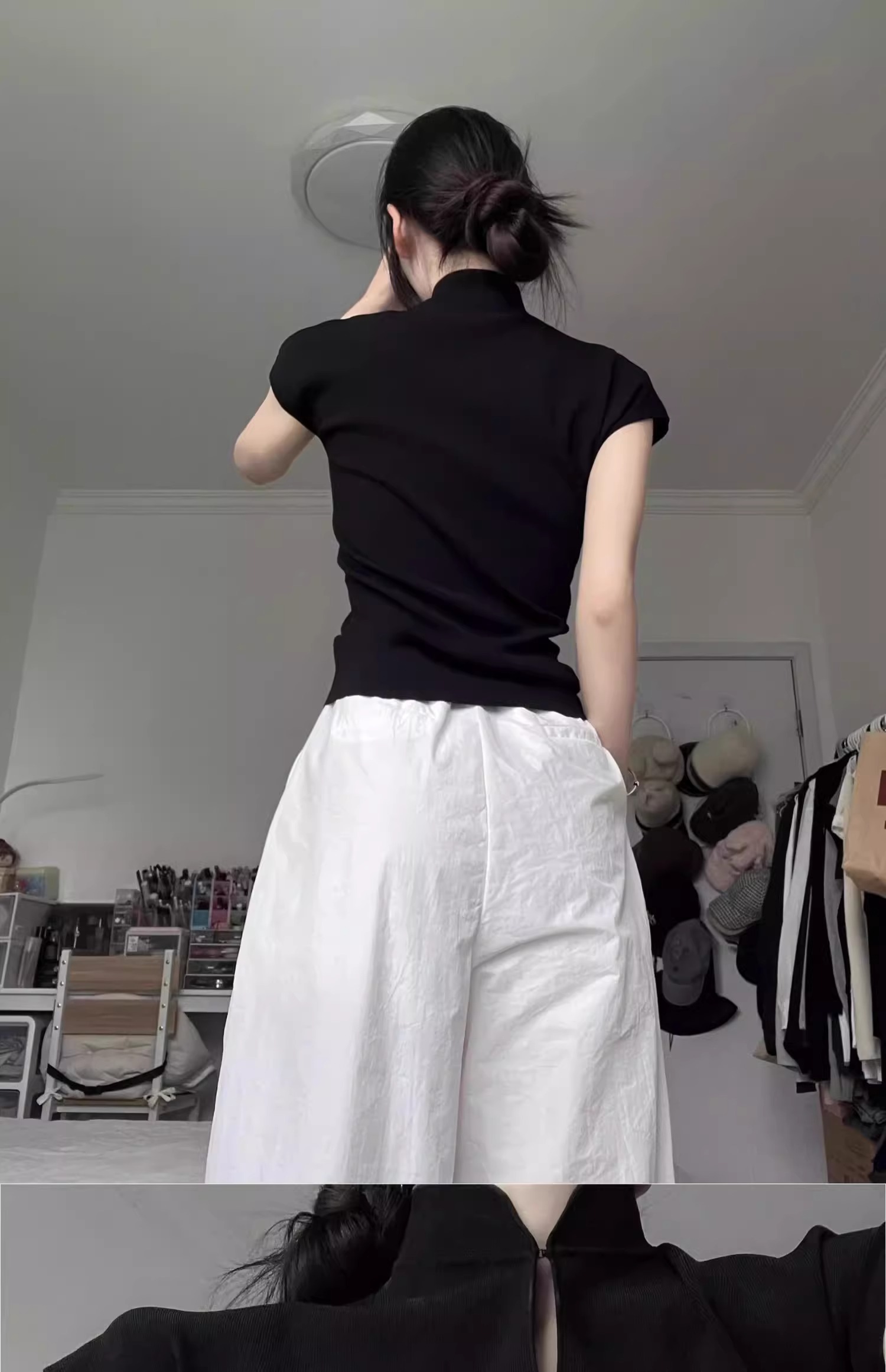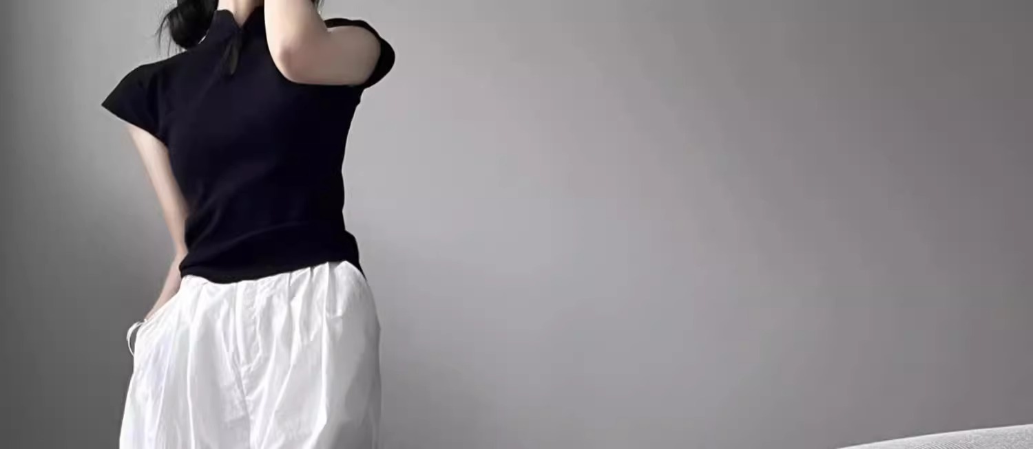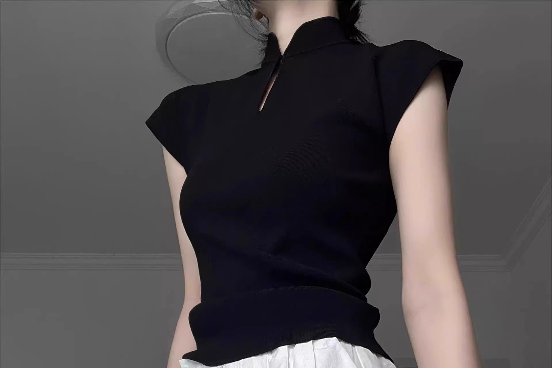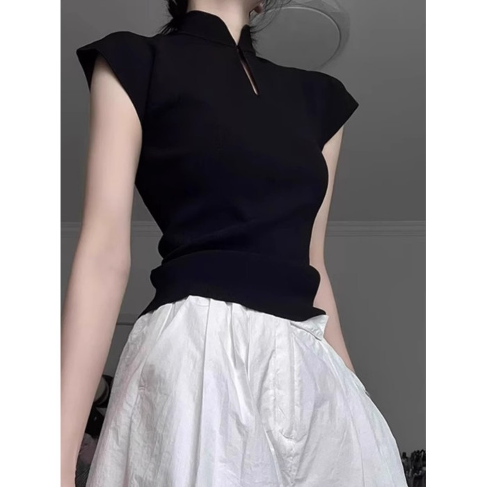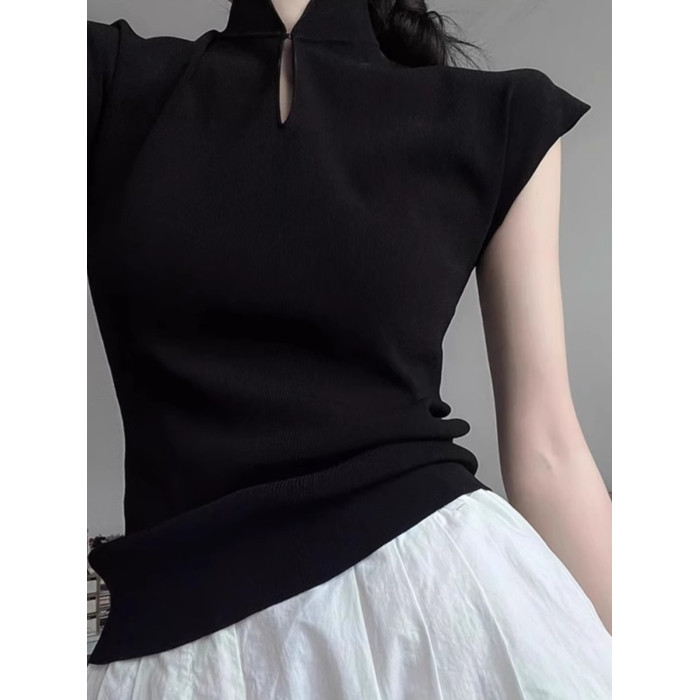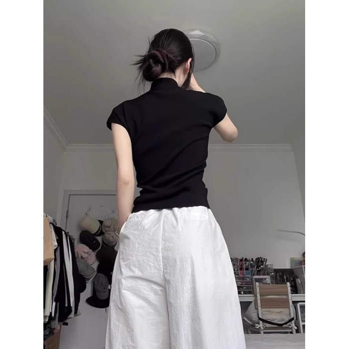 新中式輕國風盤釦短袖T恤女夏修身內搭打底衫小飛袖正肩立領上衣
