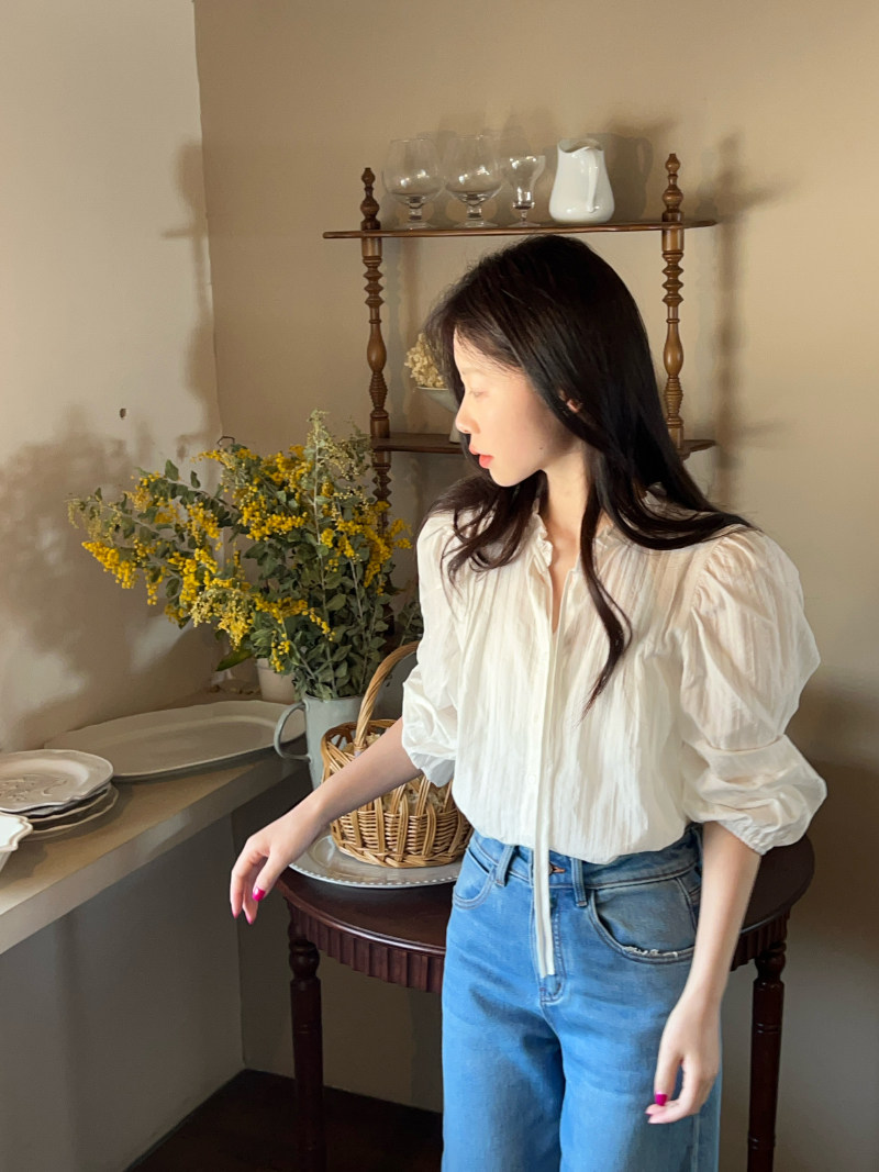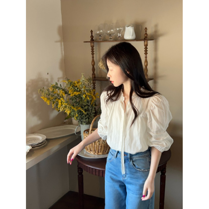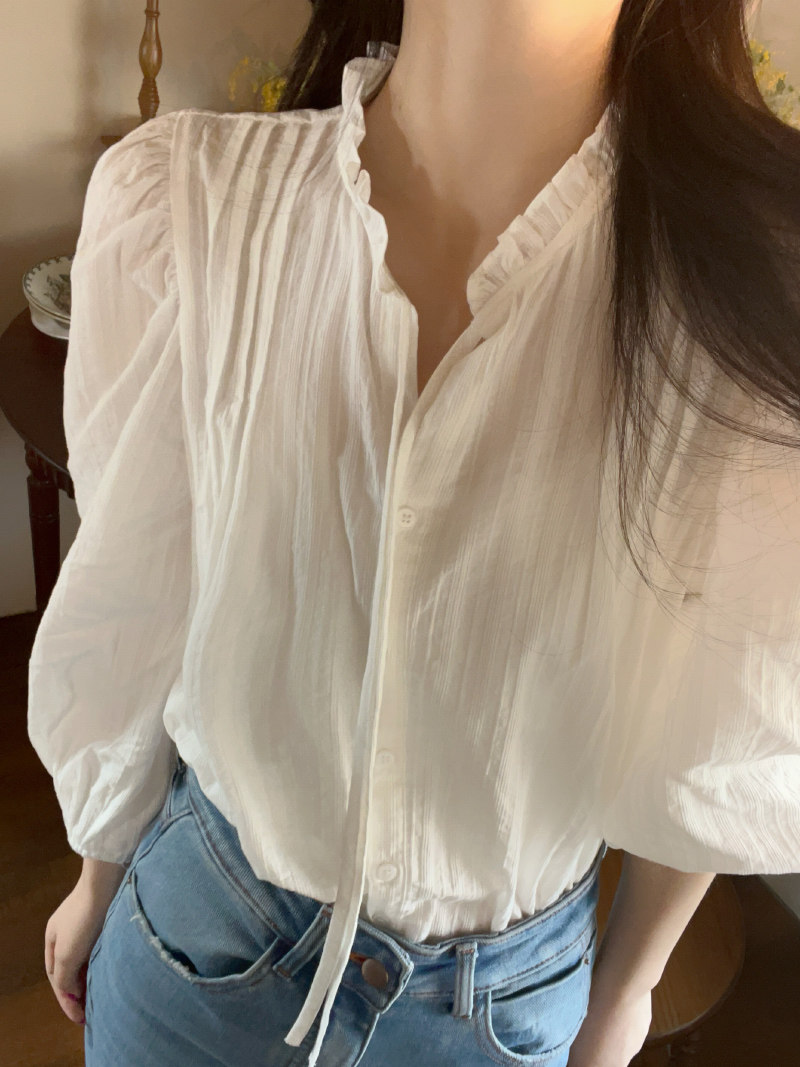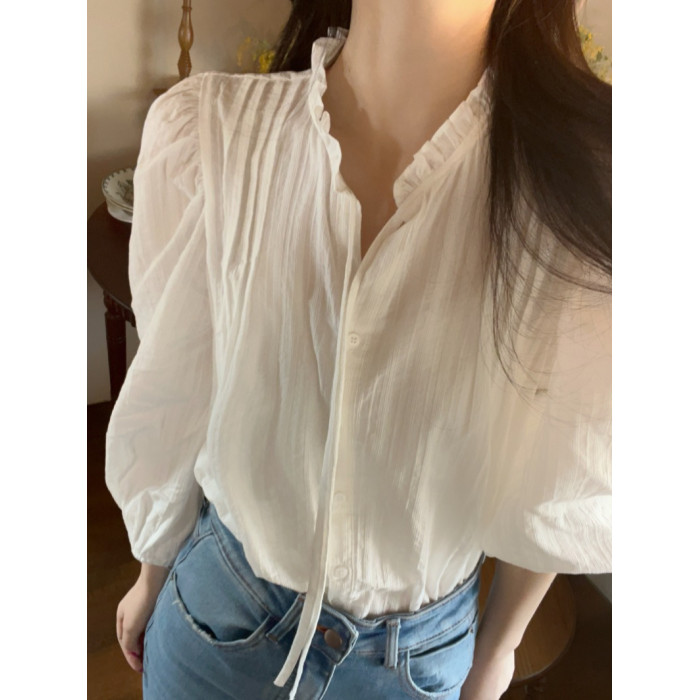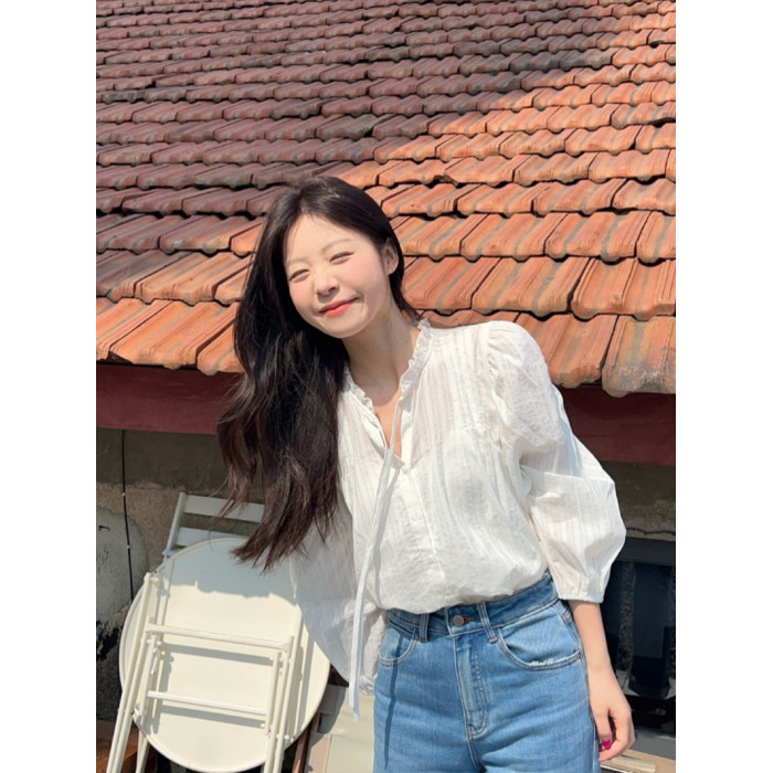 PPHOME釣系拿捏~溫柔木耳邊系帶白色襯衫女韓系簡約別致氣質上衣