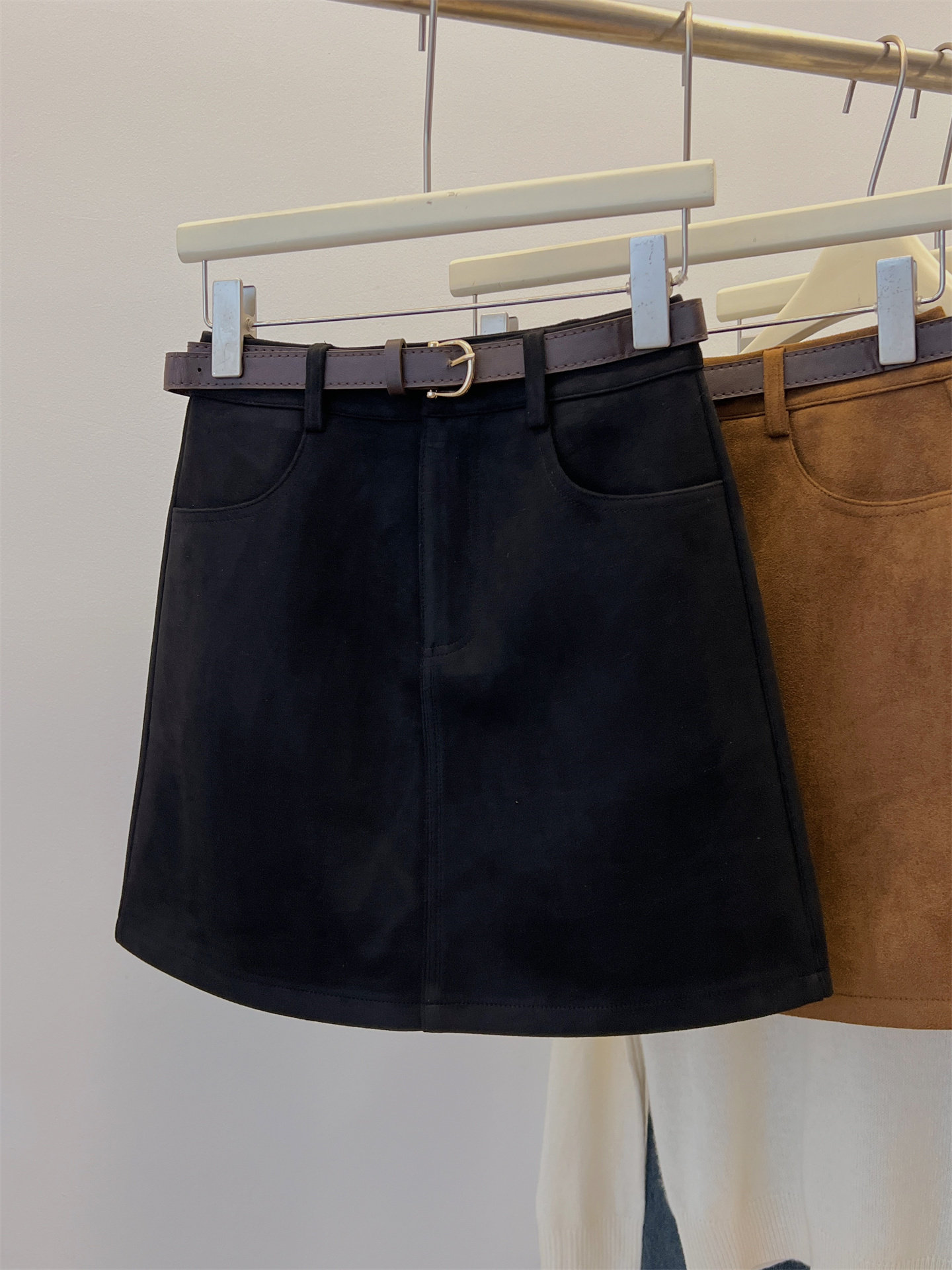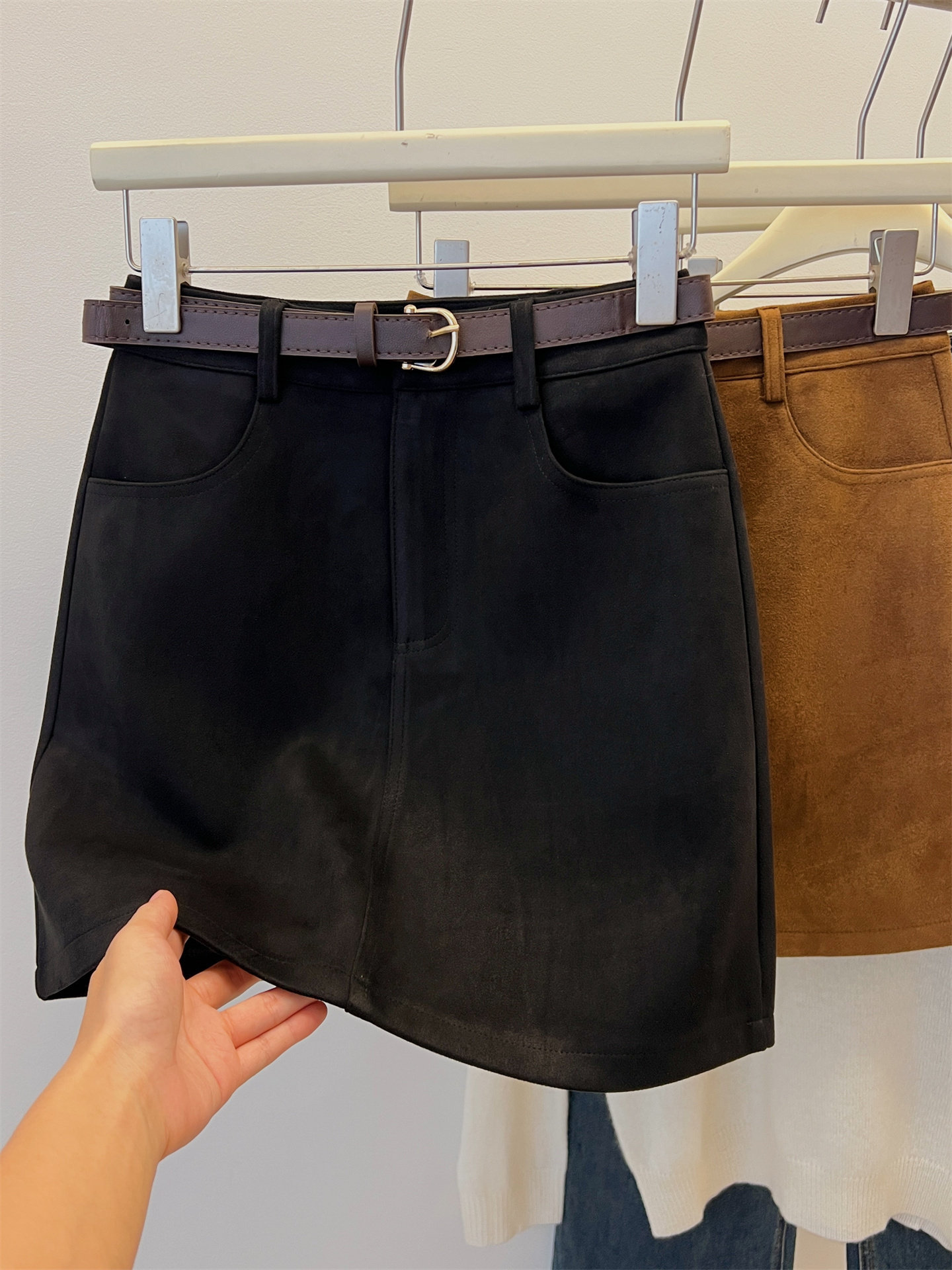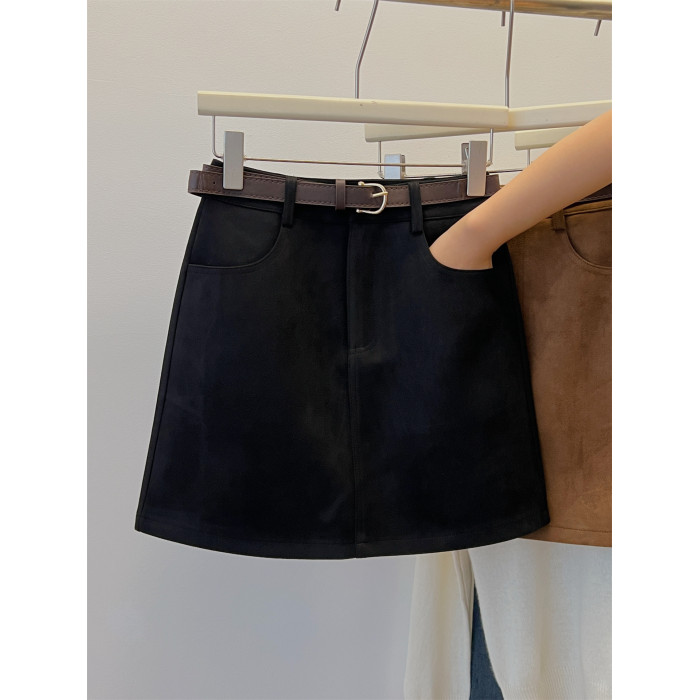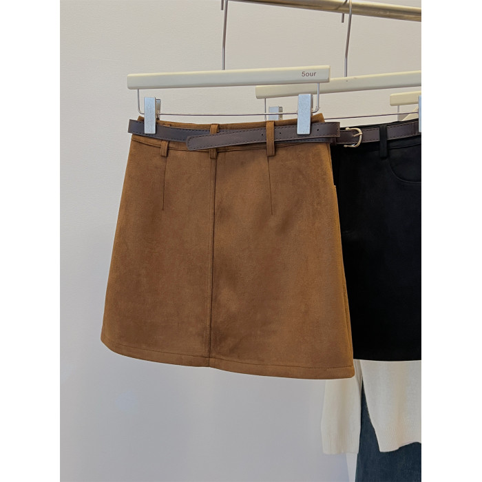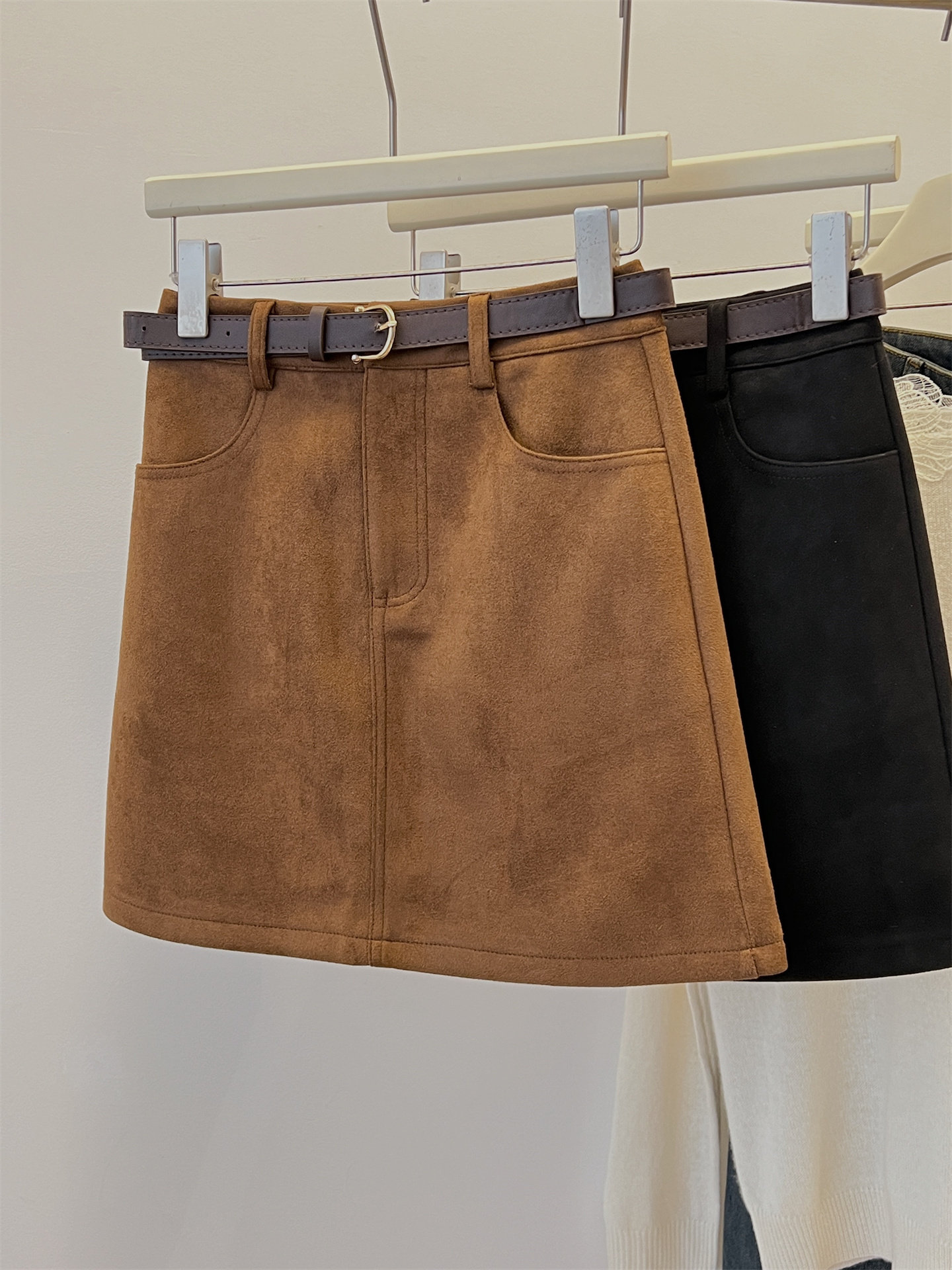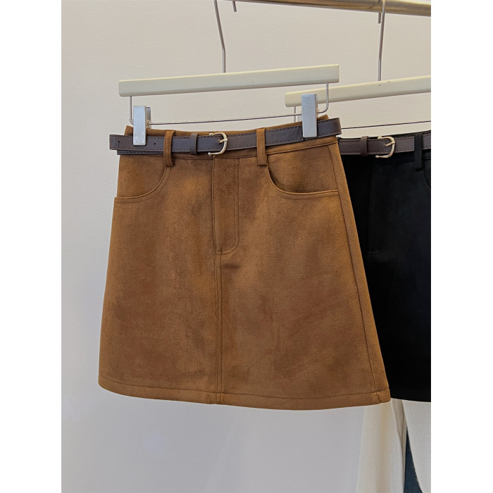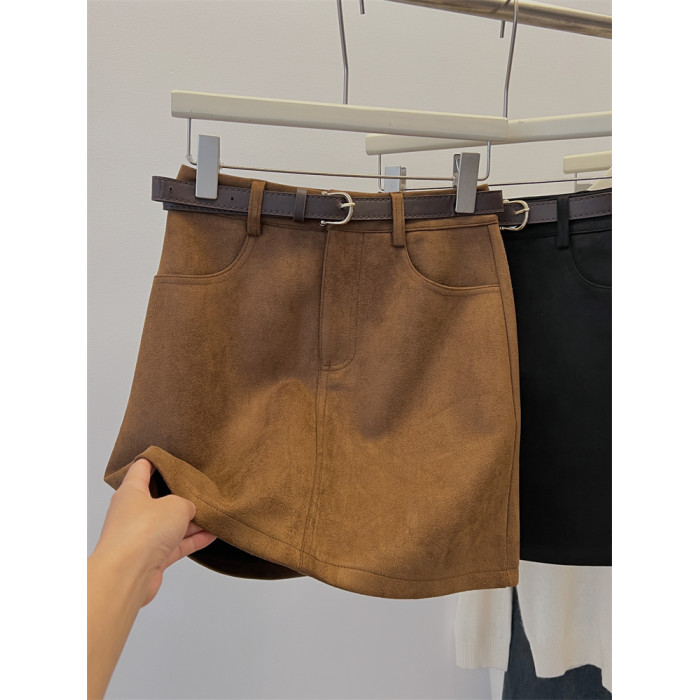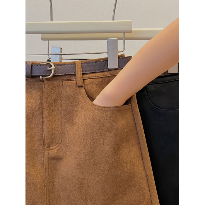 復古棕色麂皮絨半身裙女秋冬胖mm百搭口袋包臀裙高腰顯瘦a字短裙