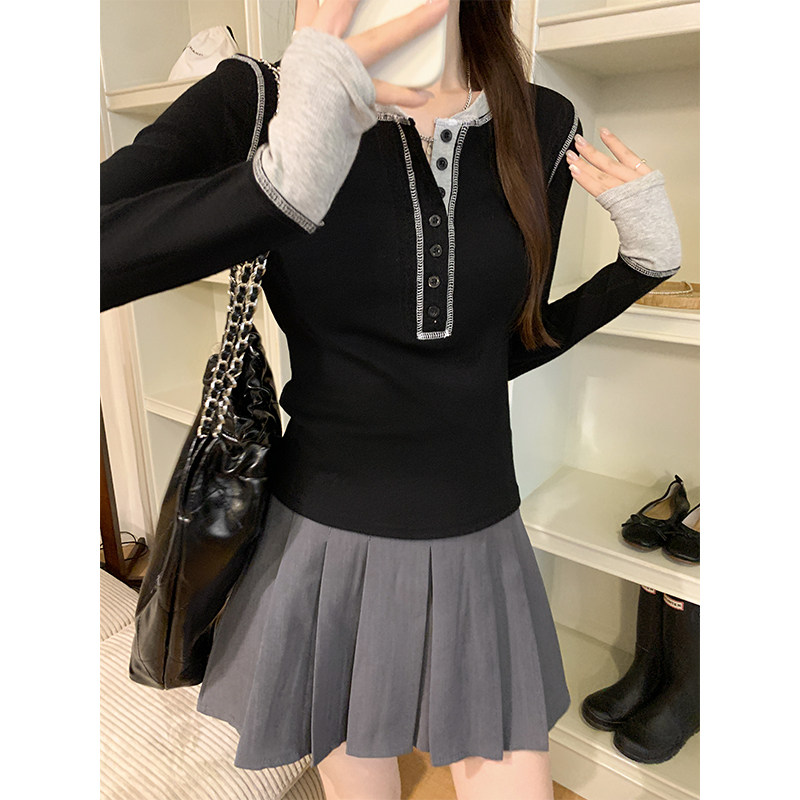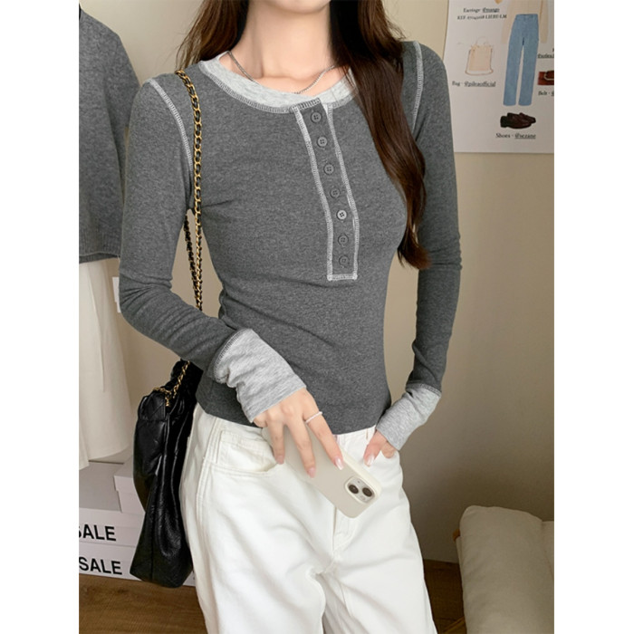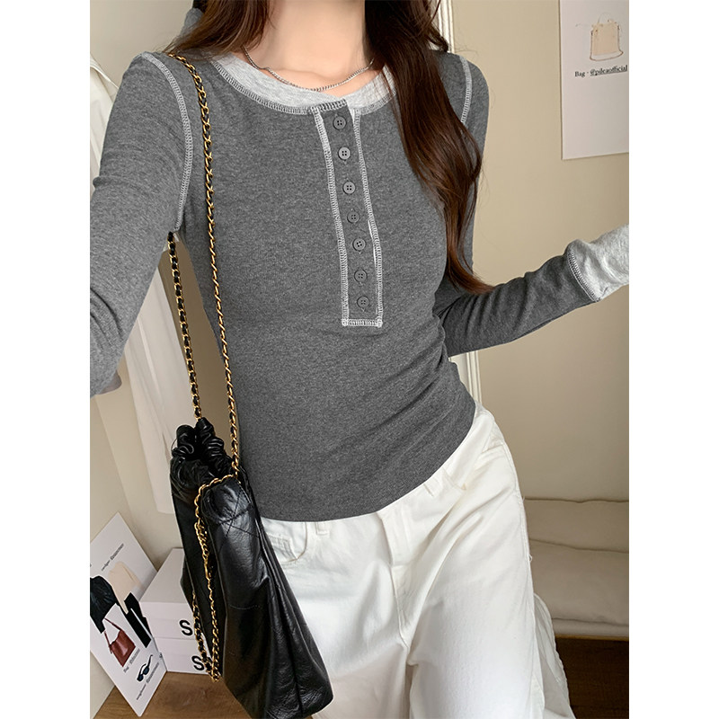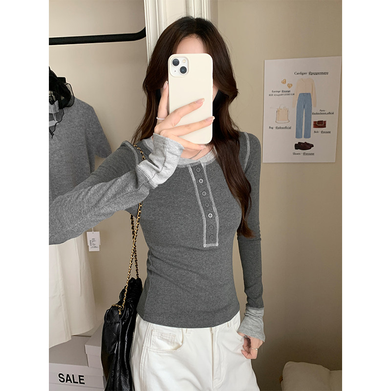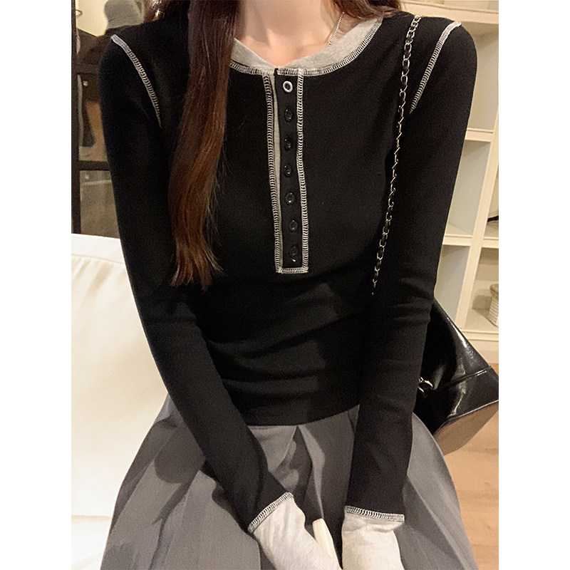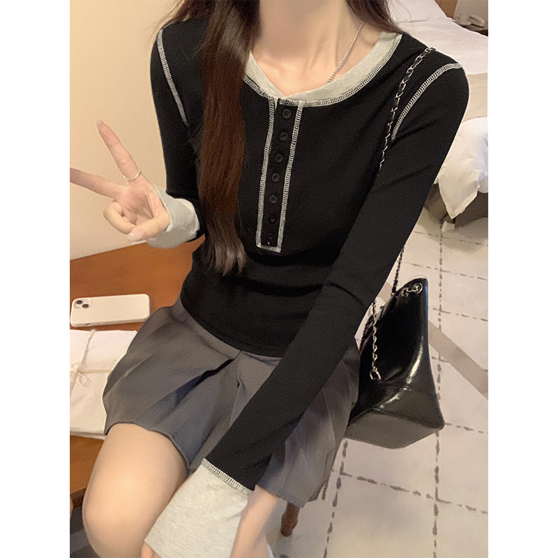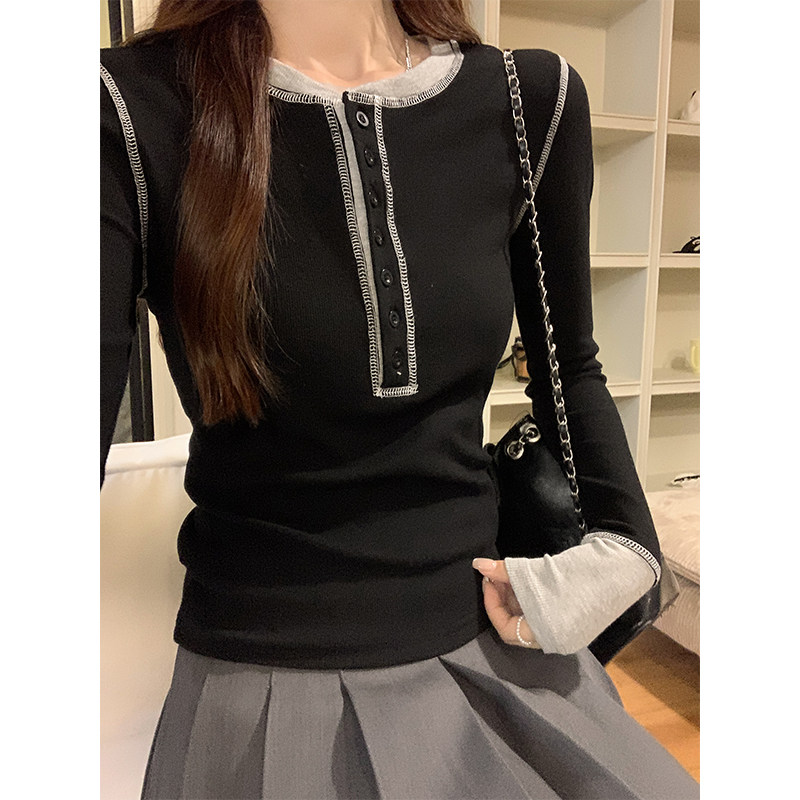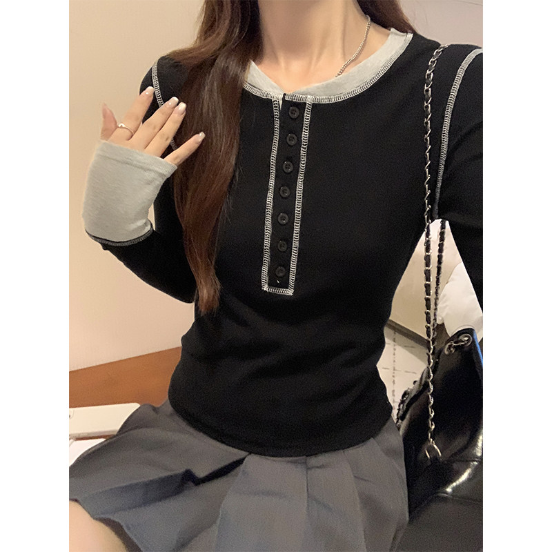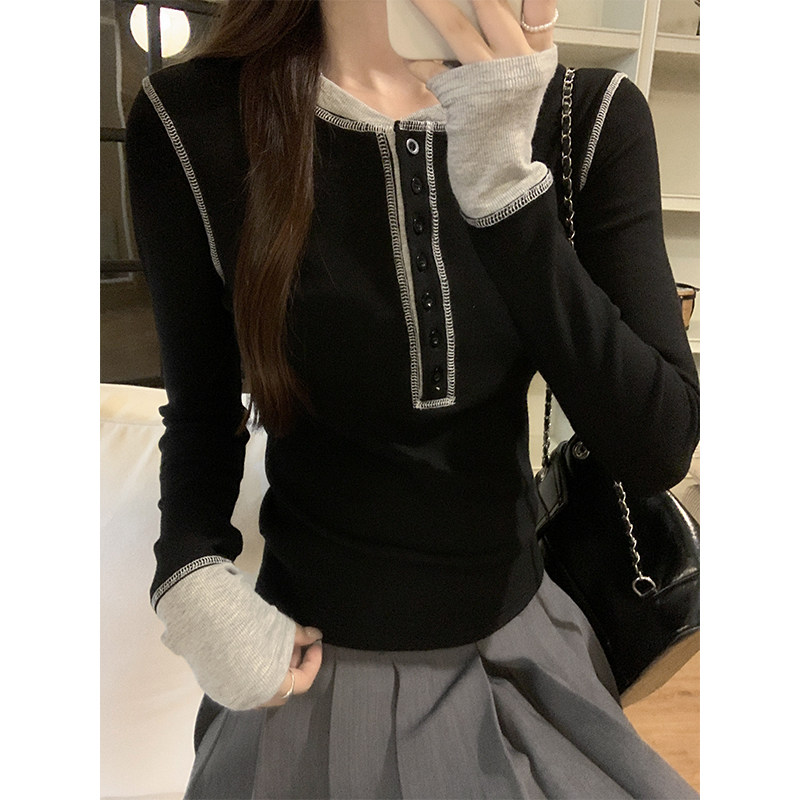 設計感撞色拼接打底衫女春秋2025紐釦V領小衆獨特上衣韓版長袖T恤