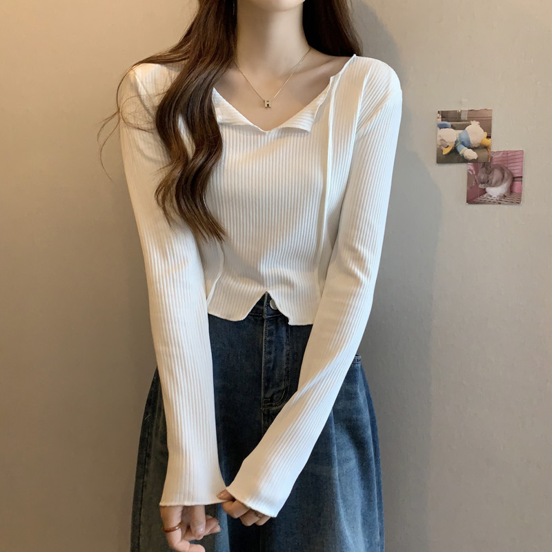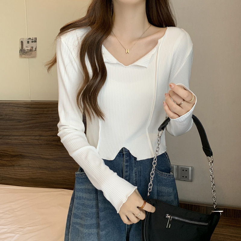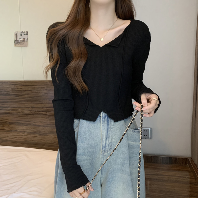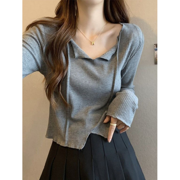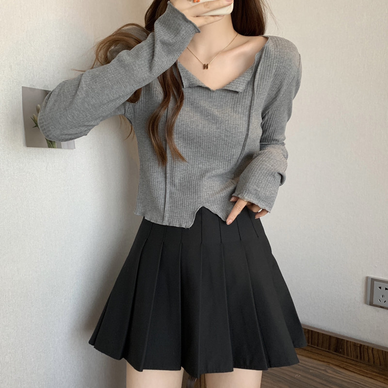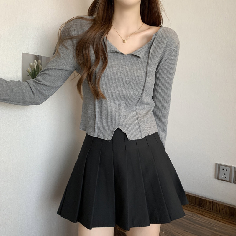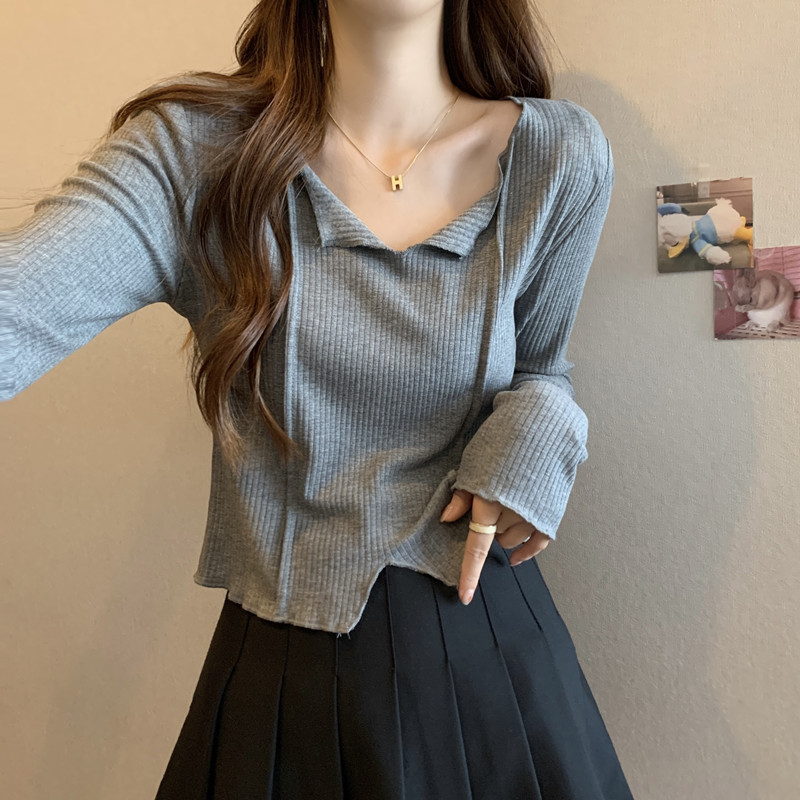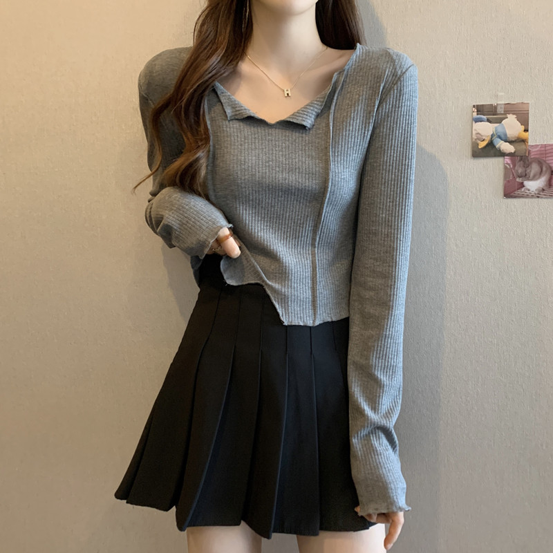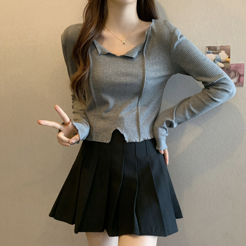 灰色V領短款打底衫女春秋季不規則高腰正肩內搭長袖T恤小個子上衣