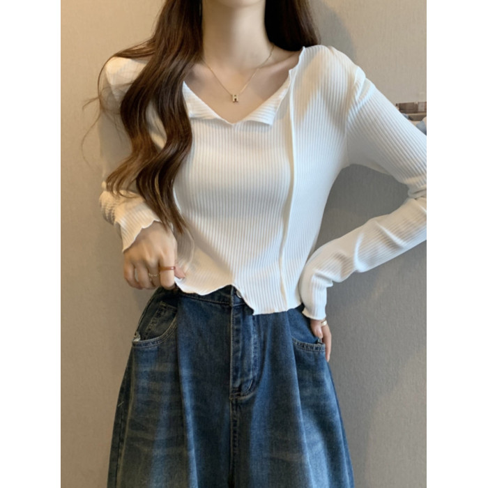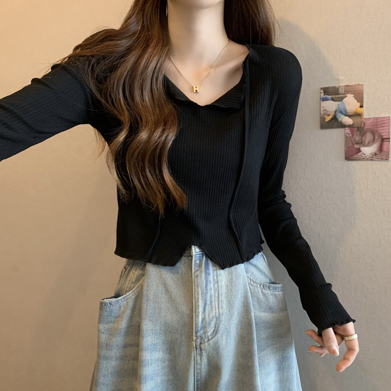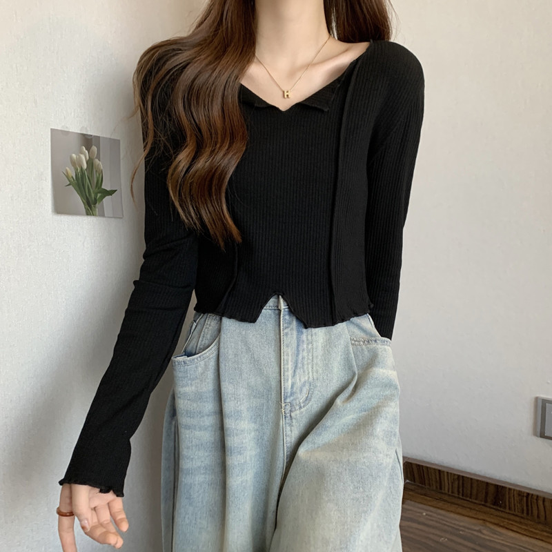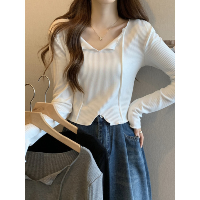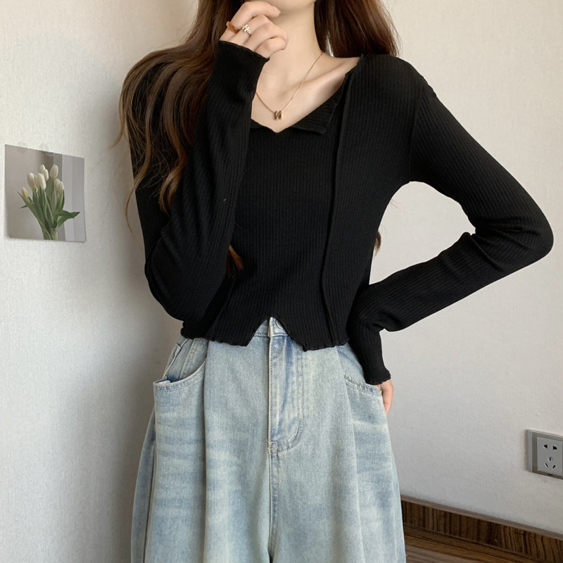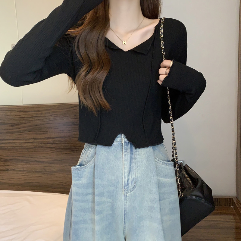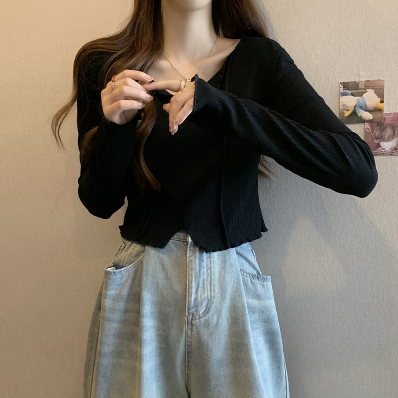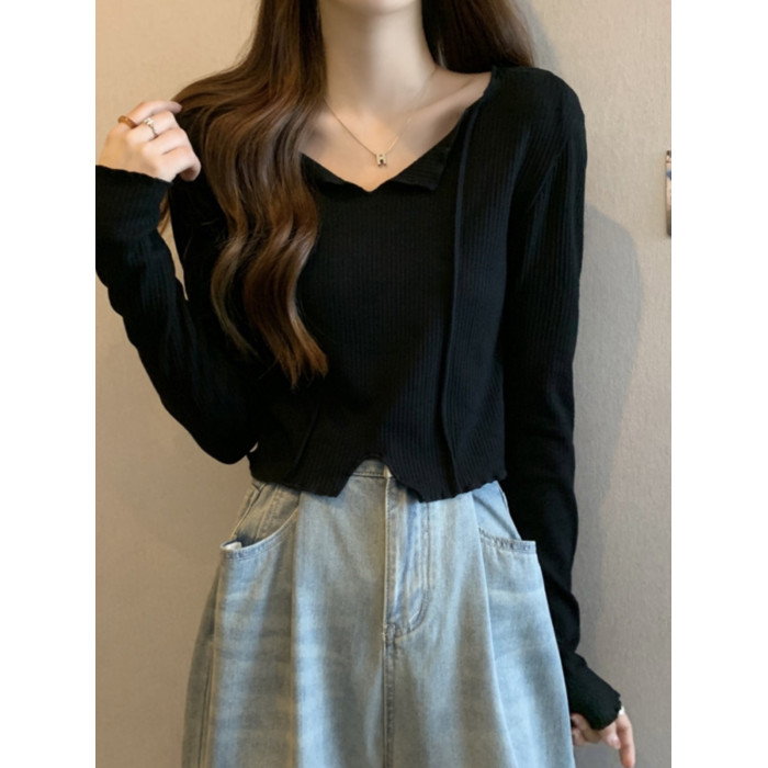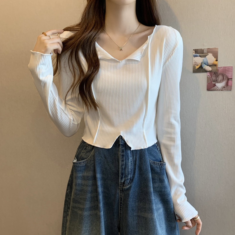 灰色V領短款打底衫女春秋季不規則高腰正肩內搭長袖T恤小個子上衣