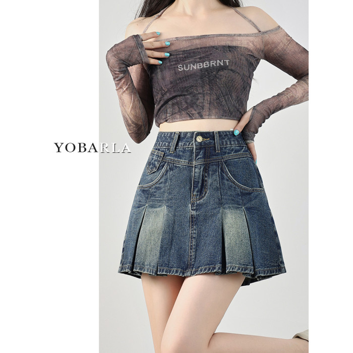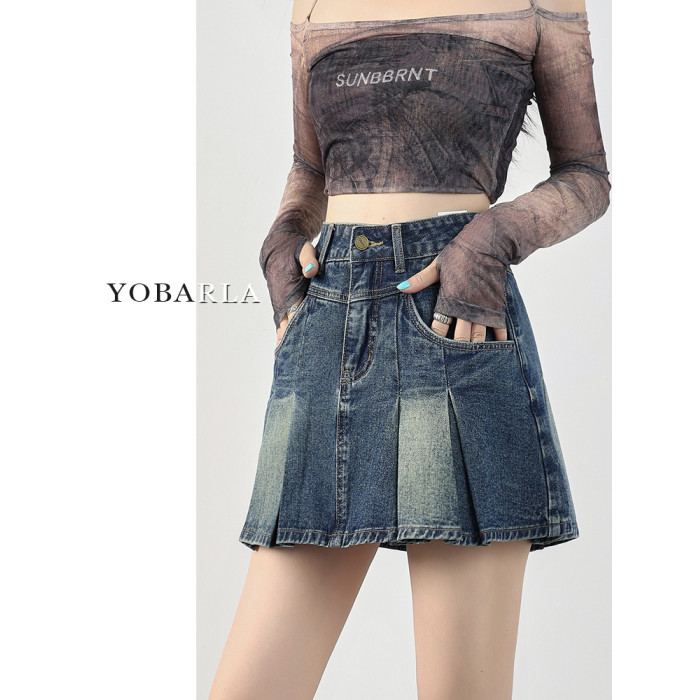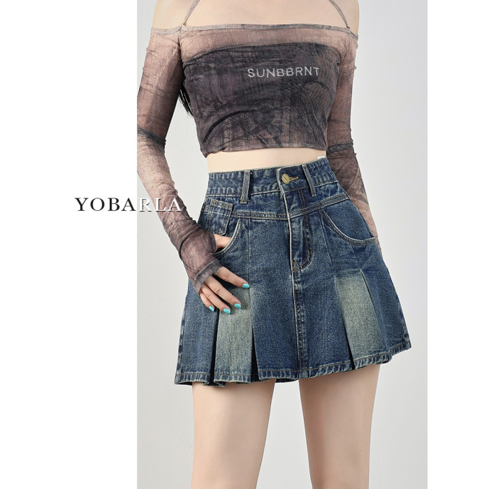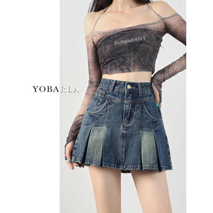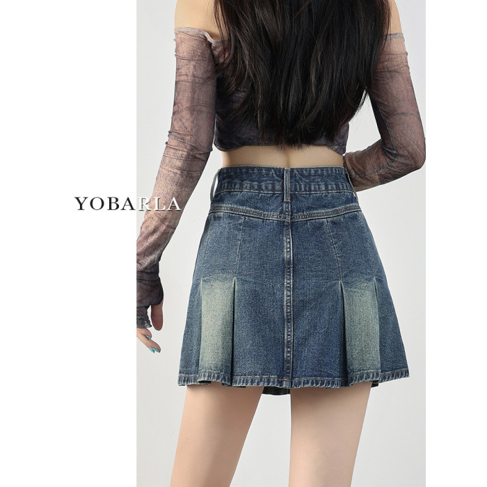 復古百褶牛仔短裙女高腰夏季新款胖mm大碼顯瘦梨形身材a字半身裙