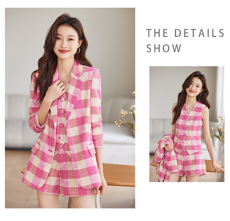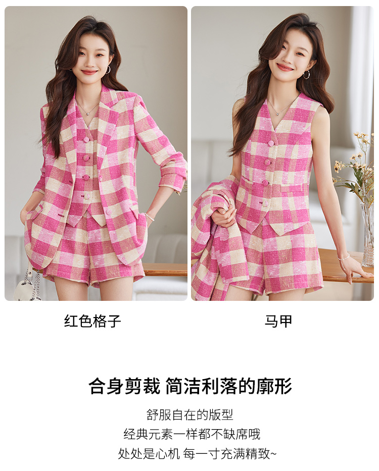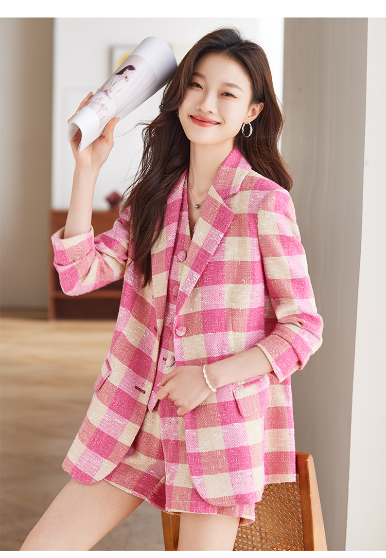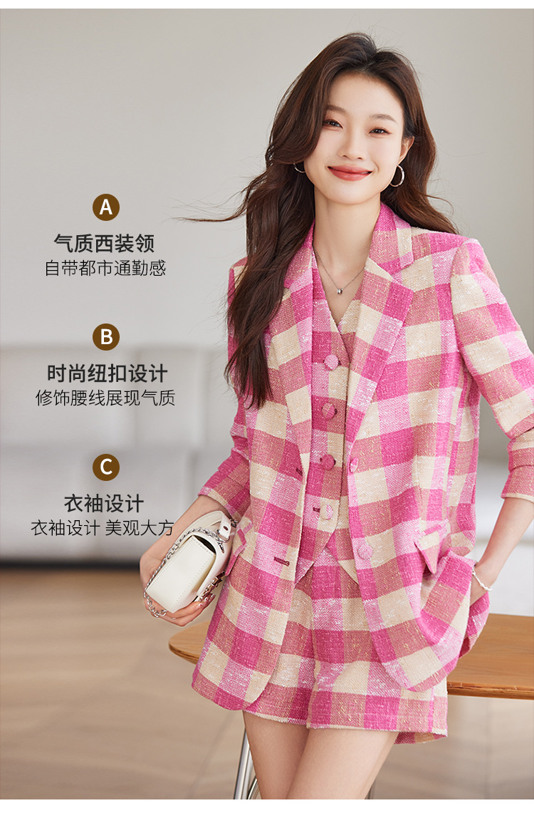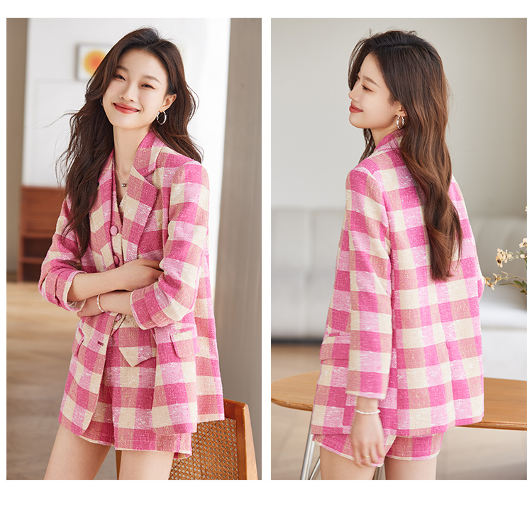 西裝外套女今年流行高級感超好看時尚套裝粉色格子西服短褲三件套