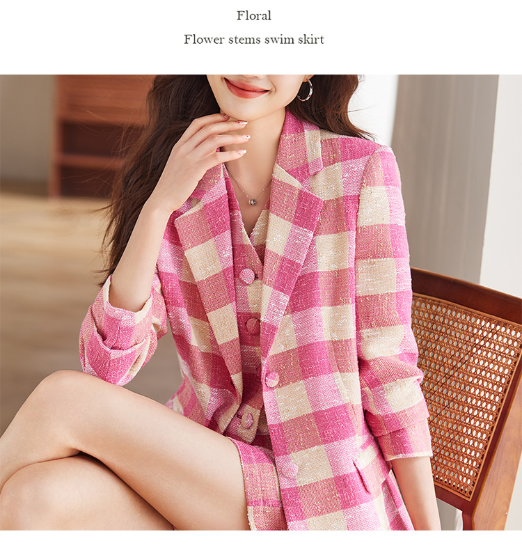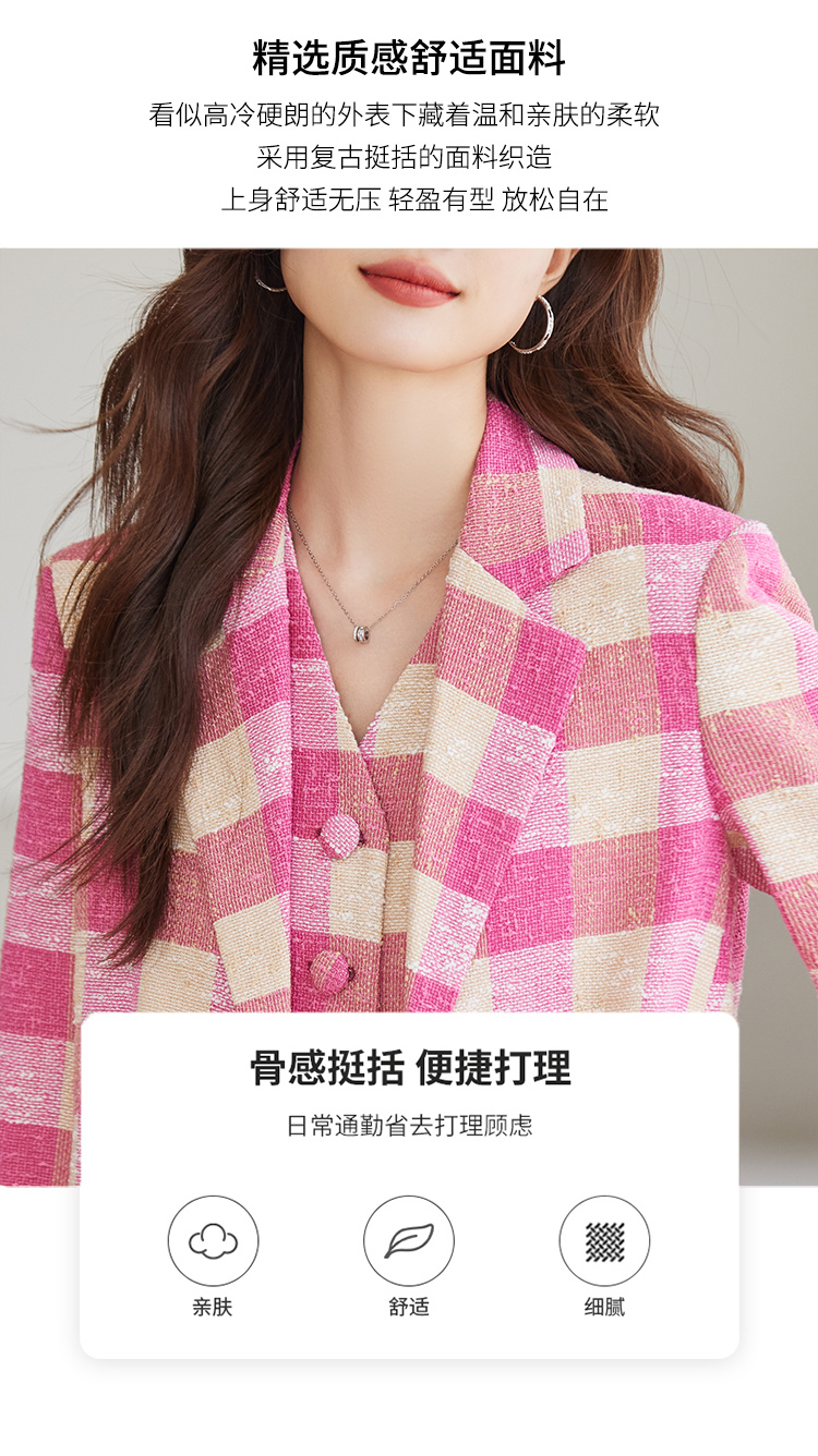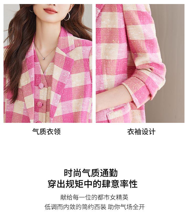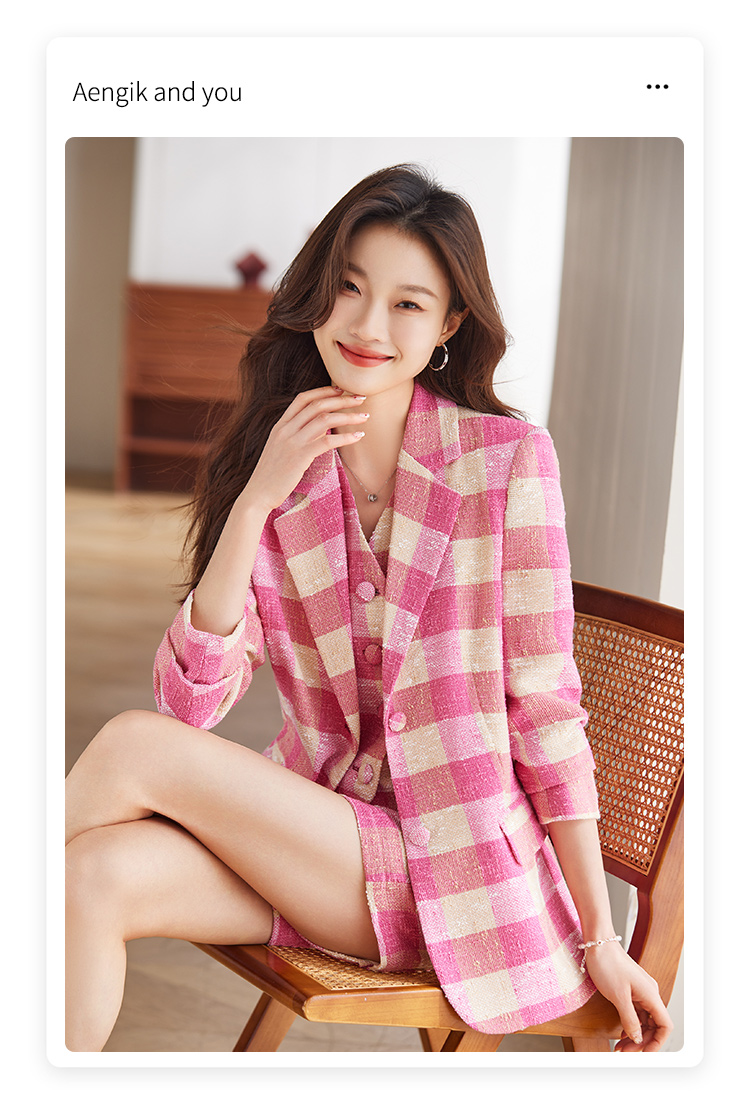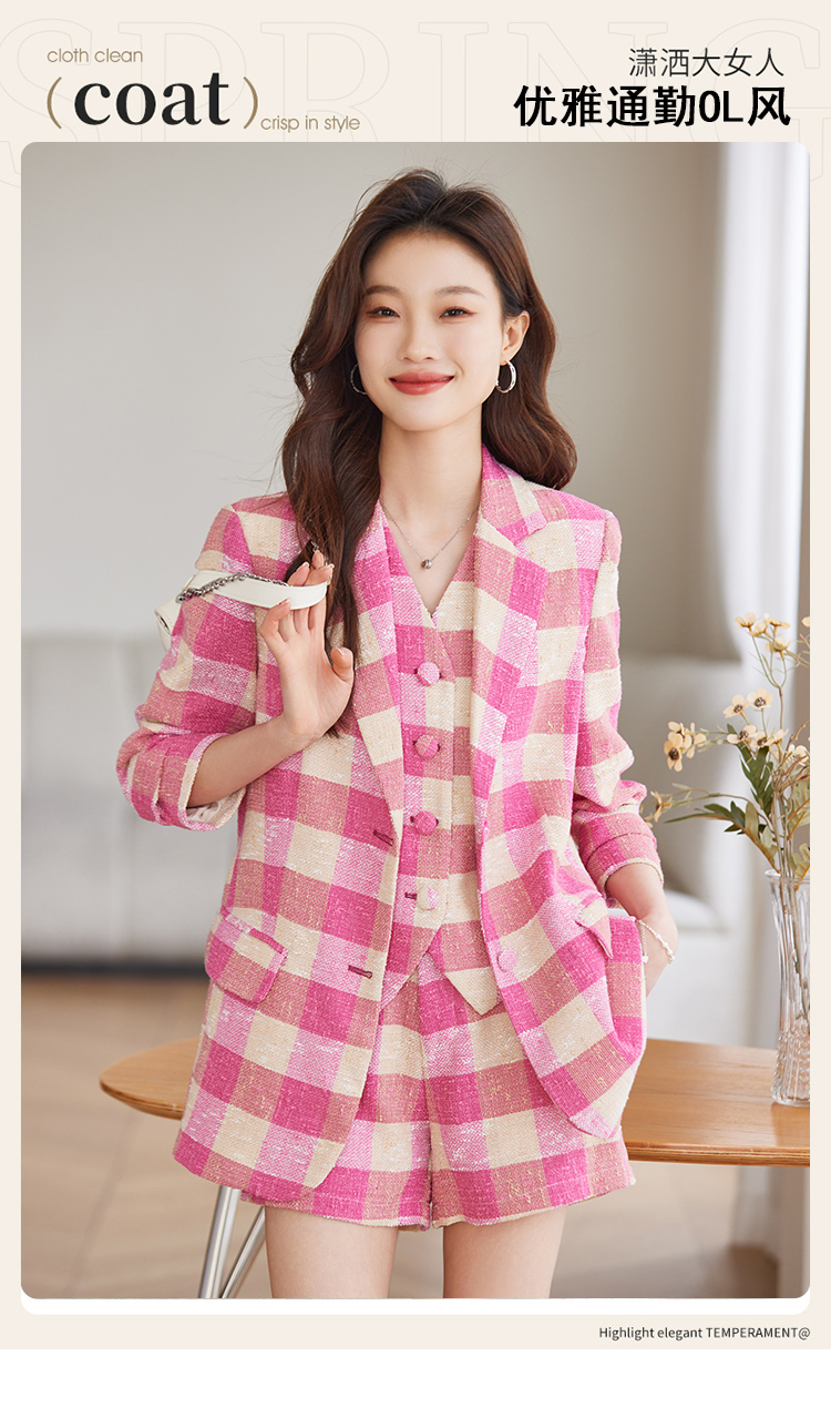 西裝外套女今年流行高級感超好看時尚套裝粉色格子西服短褲三件套