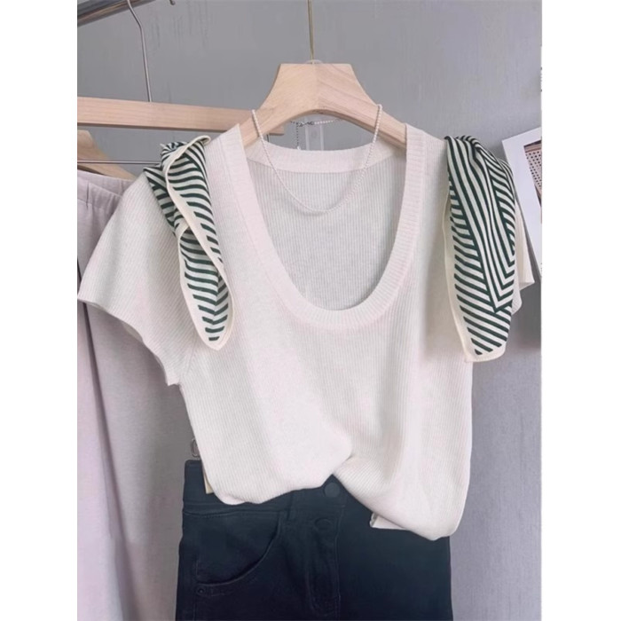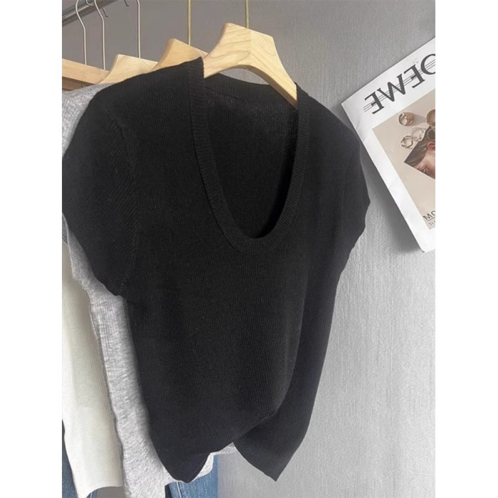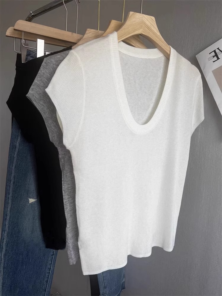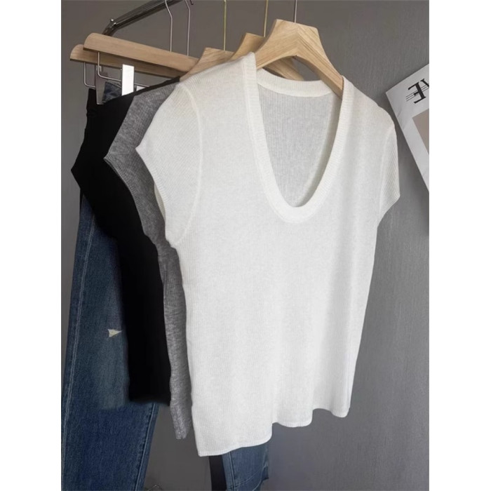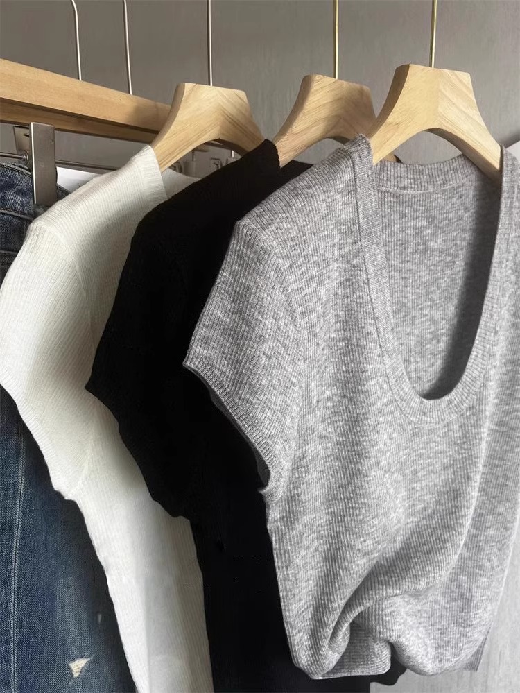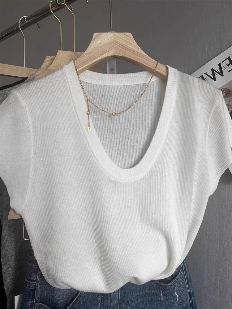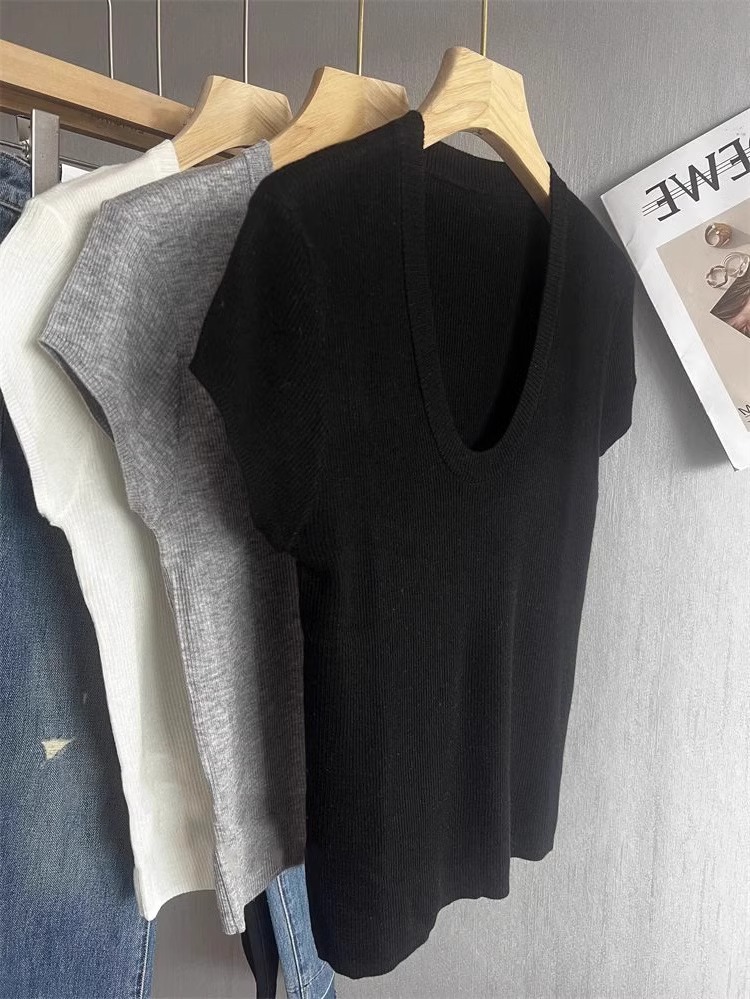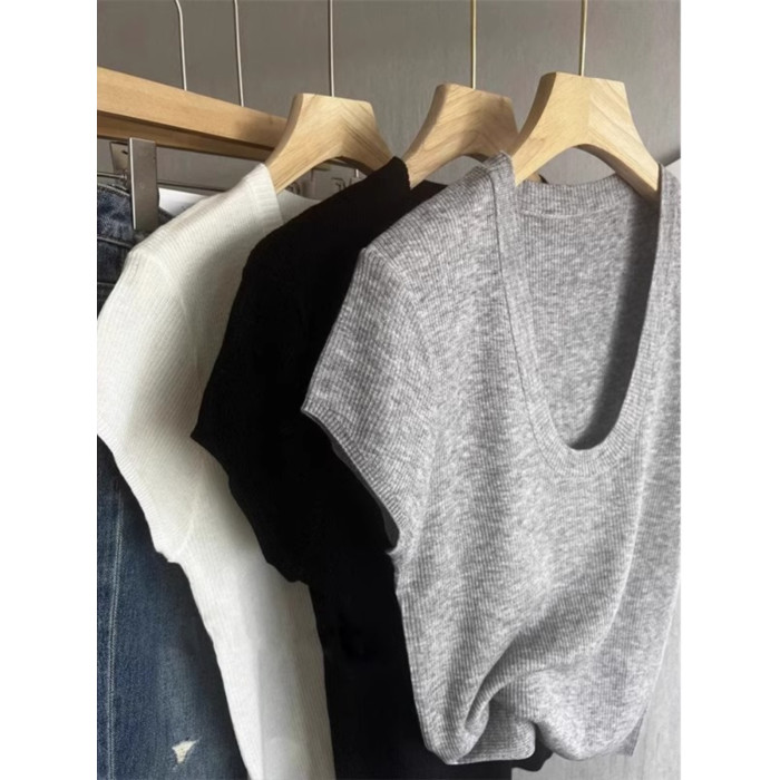 淺灰色薄款U領針織短袖上衣2025夏季新款爆款高級感修身短款T恤女