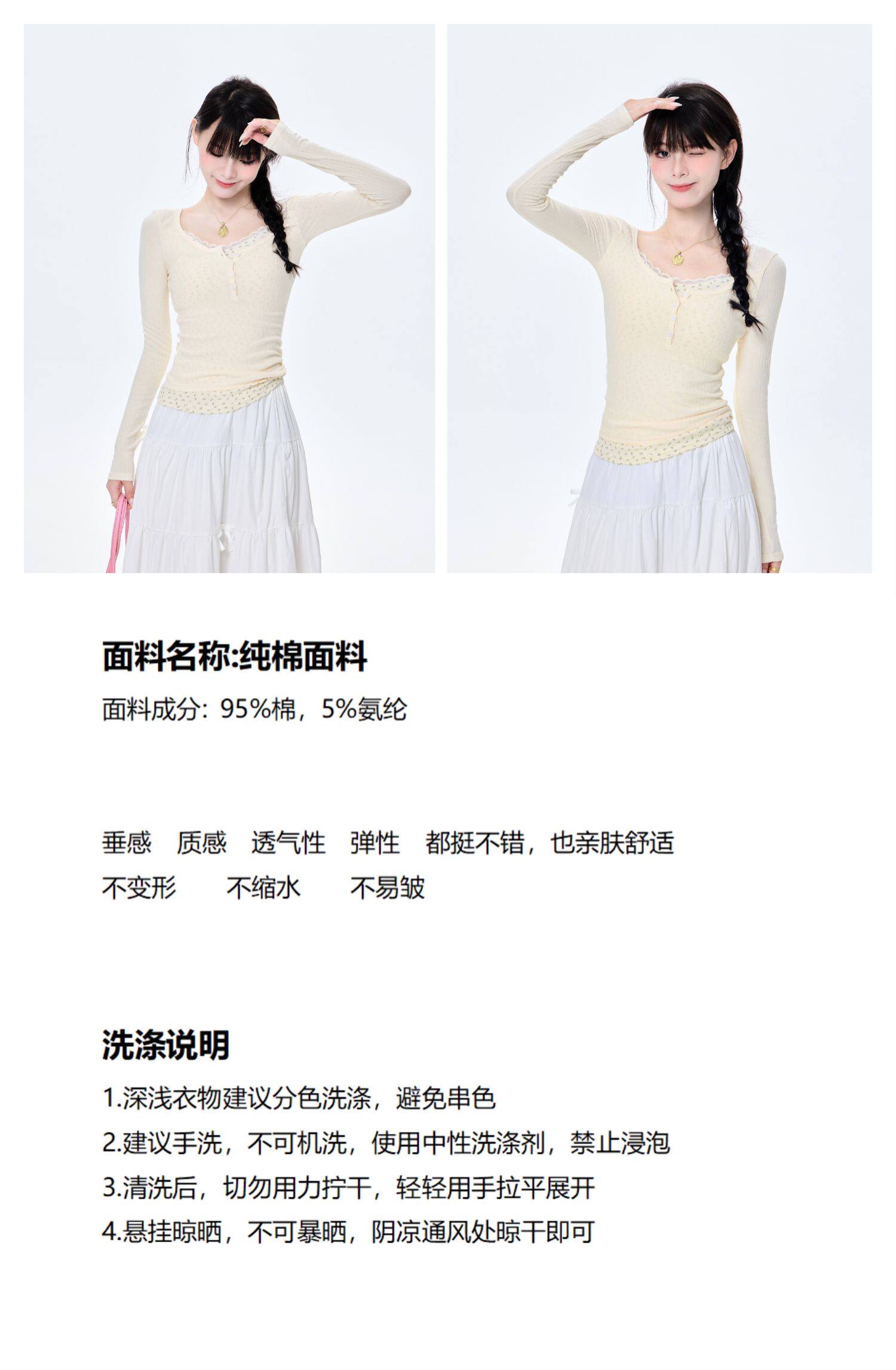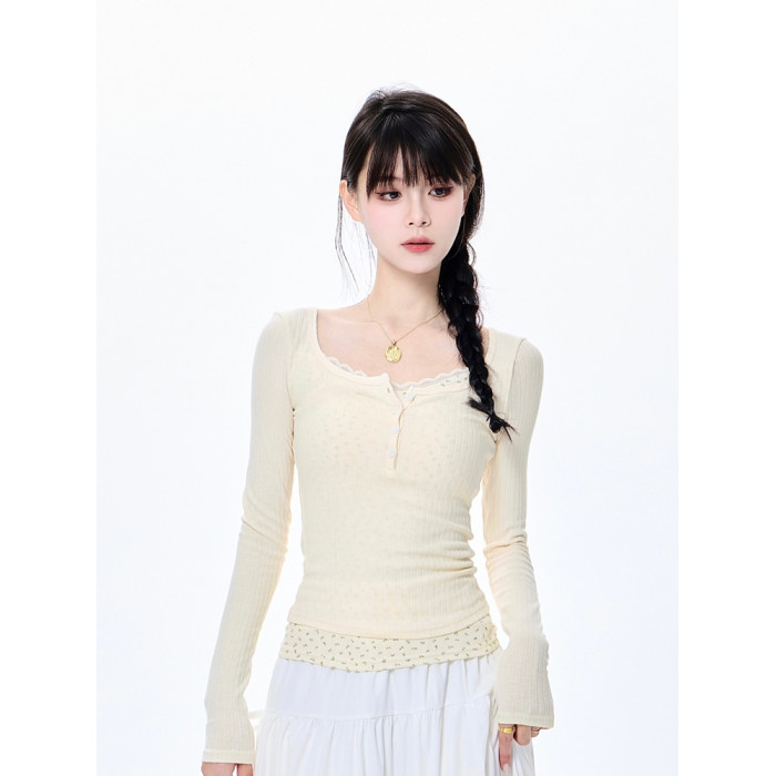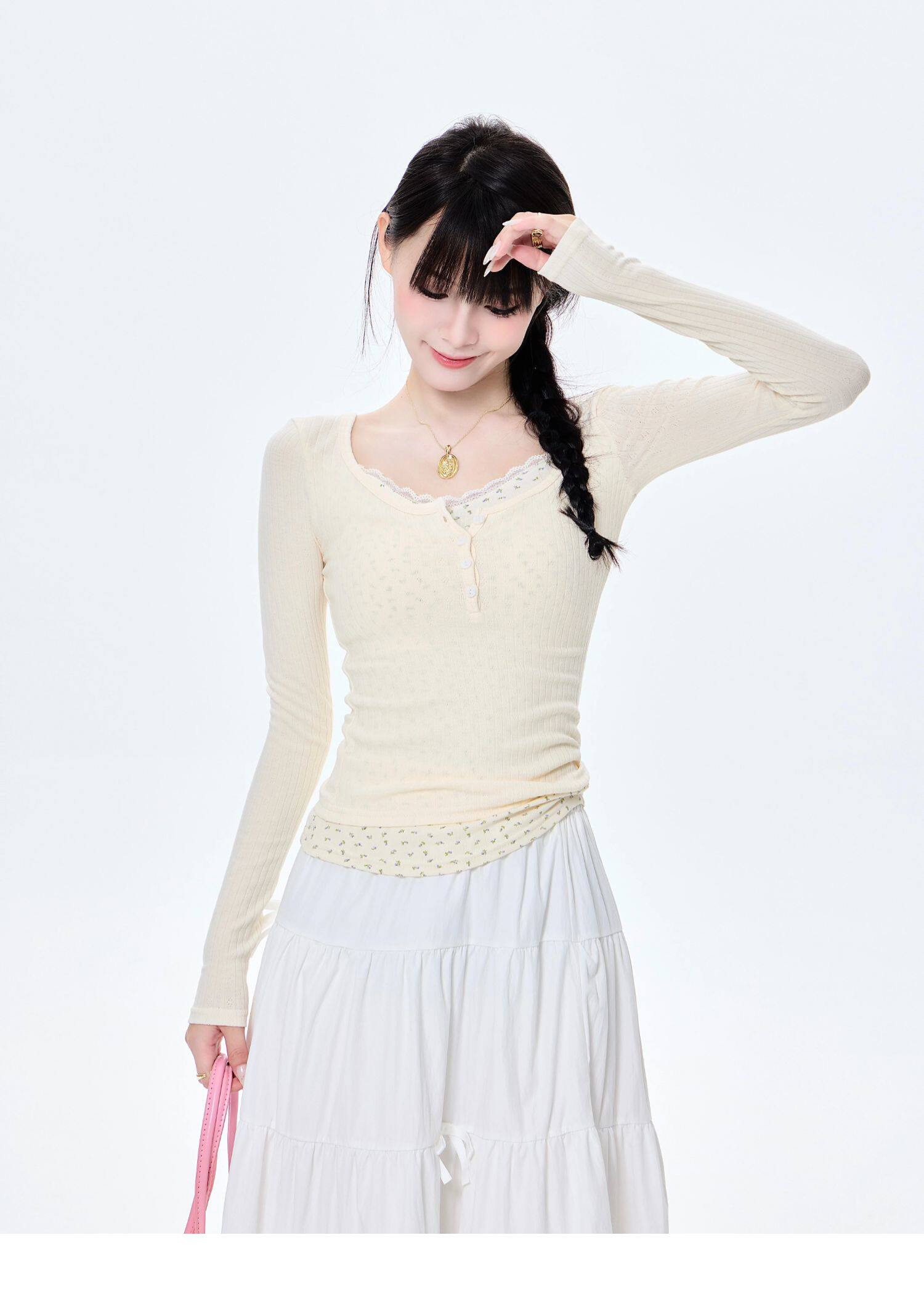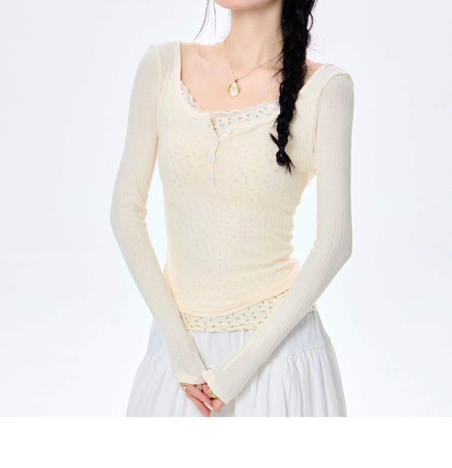 正肩長袖t恤女2025秋季u領設計感上衣小香風內搭百搭韓版蕾絲打底