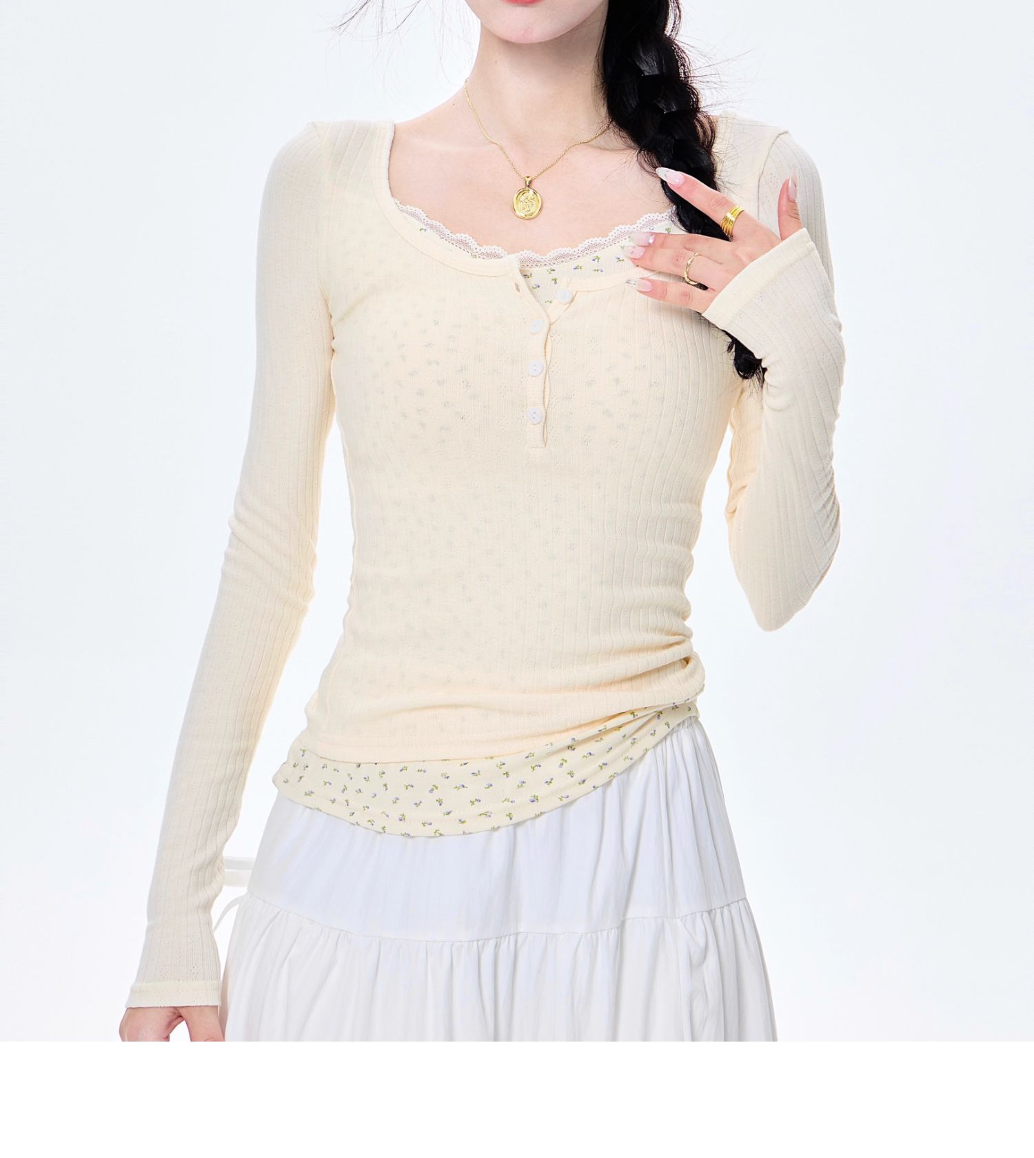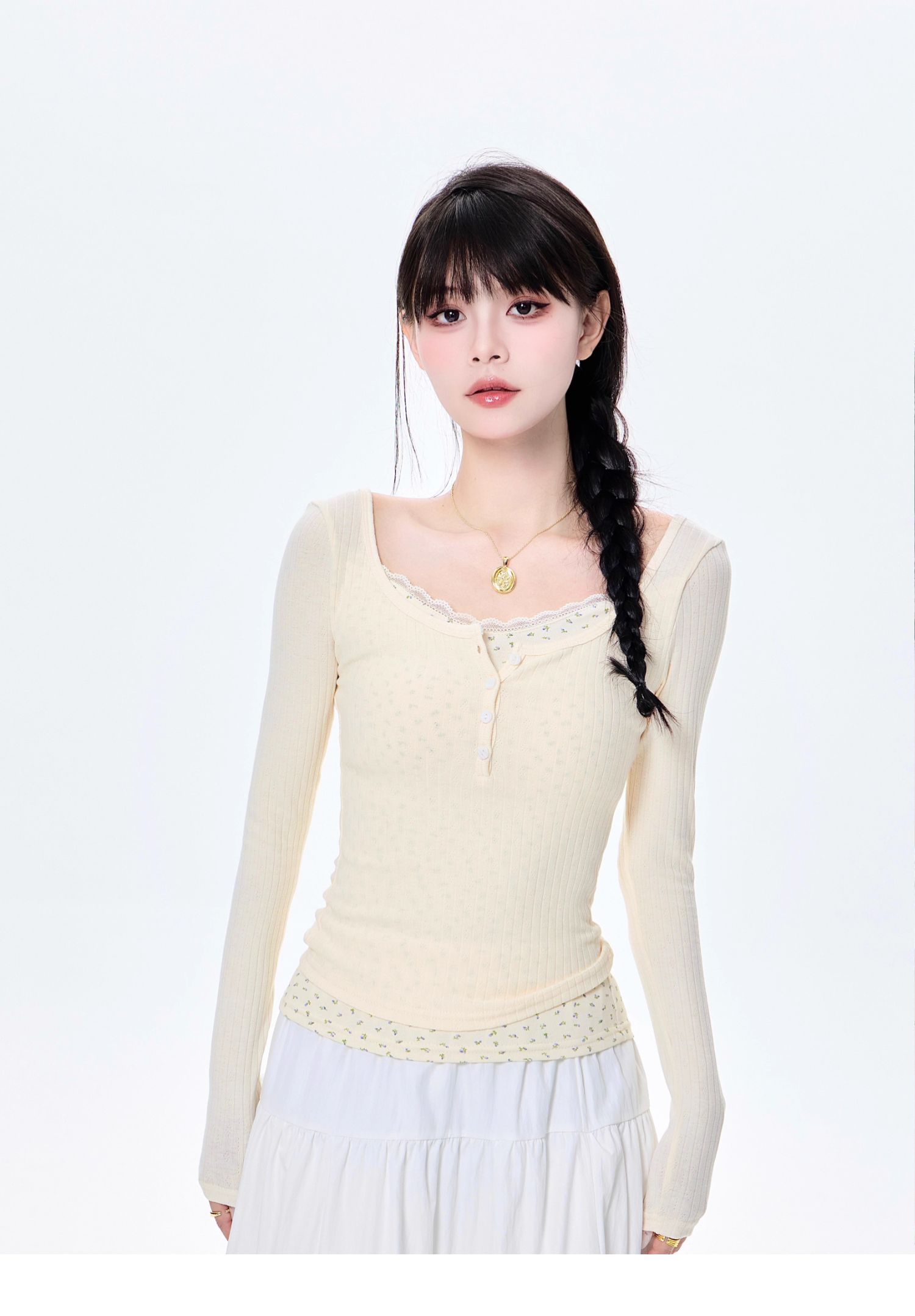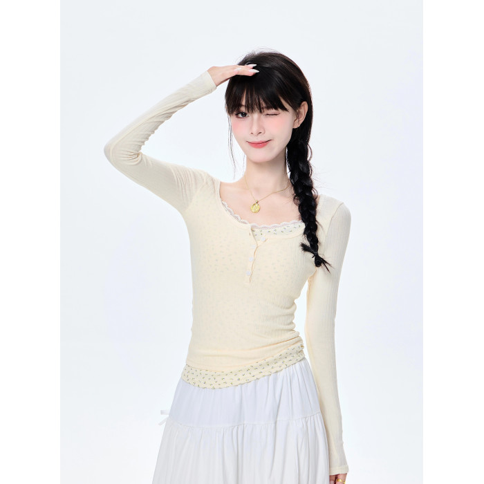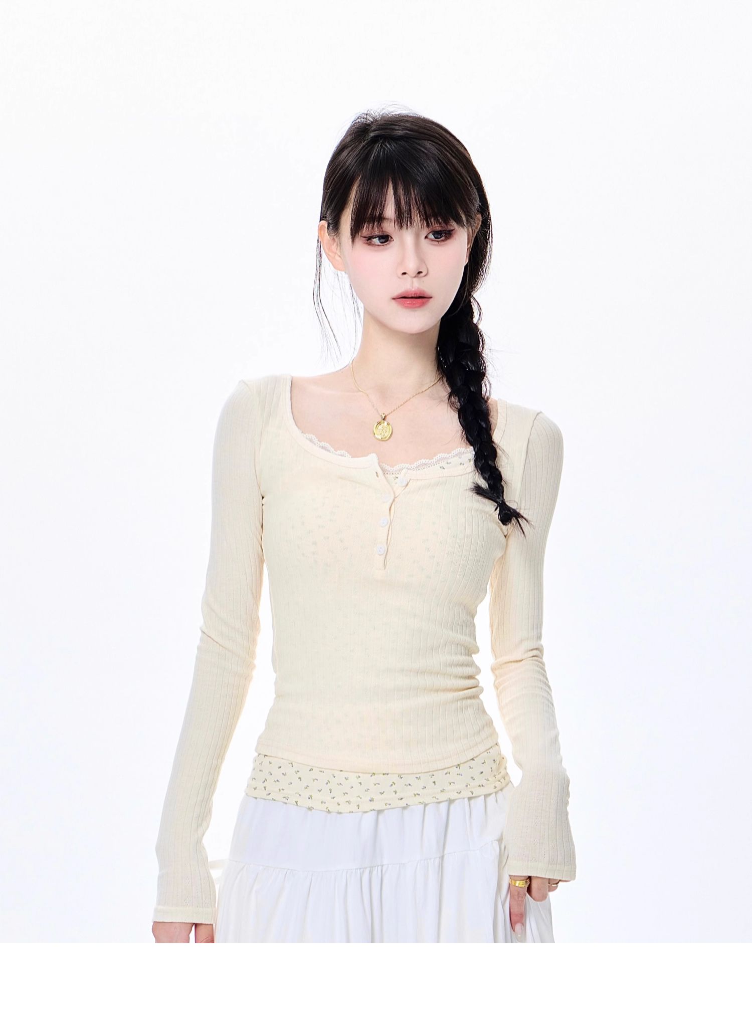 正肩長袖t恤女2025秋季u領設計感上衣小香風內搭百搭韓版蕾絲打底