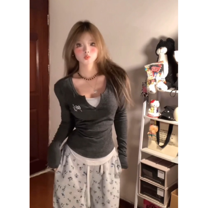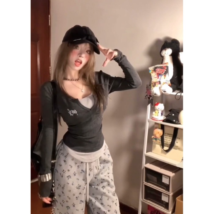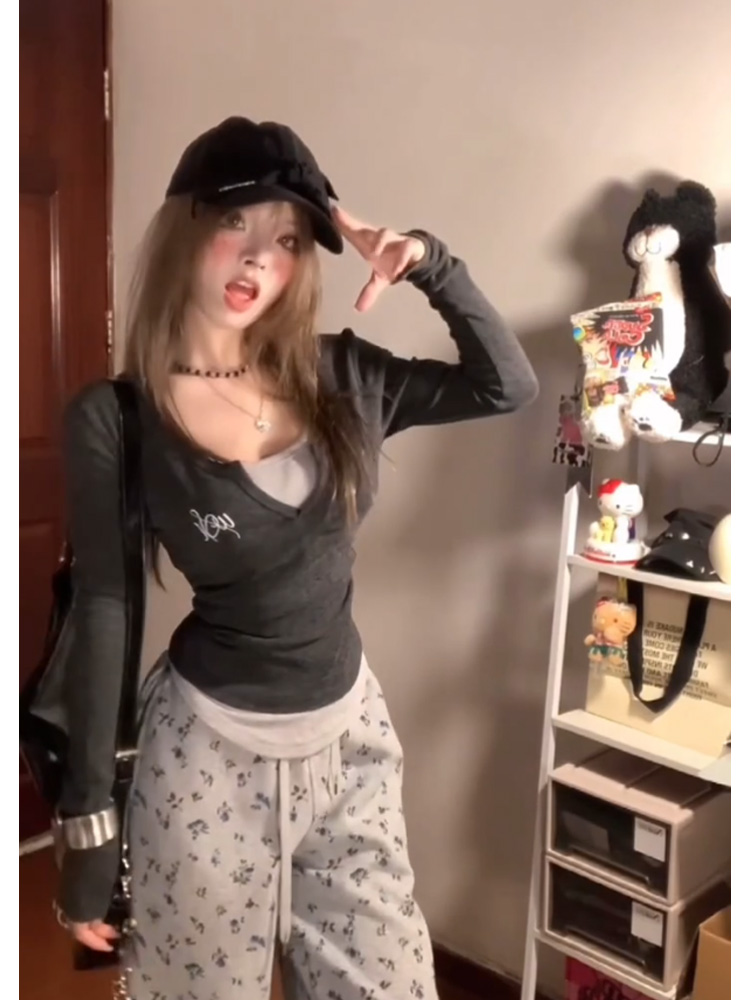 美式復古v領假兩件長袖t恤女秋冬2025新款修身顯瘦甜辣妹打底上衣