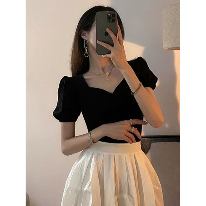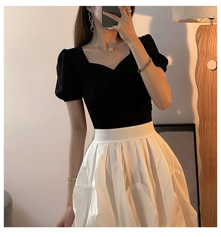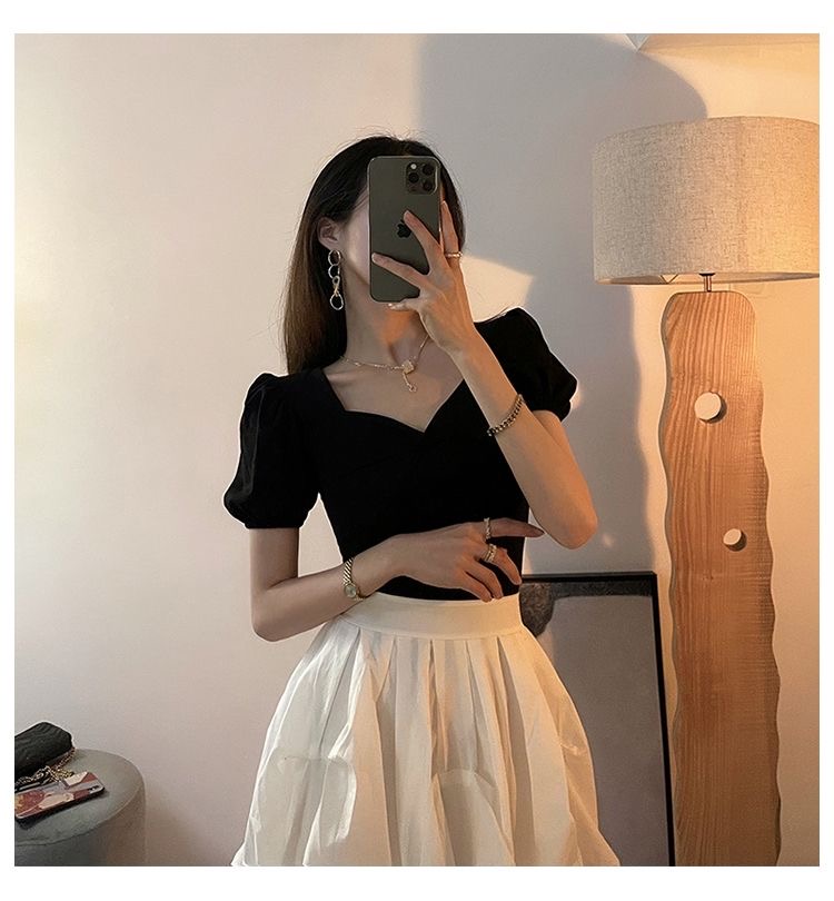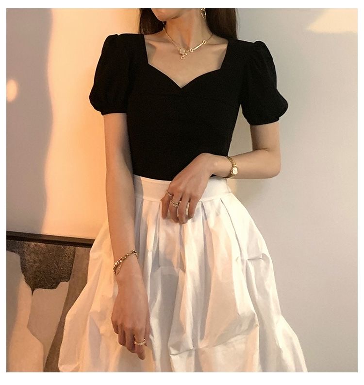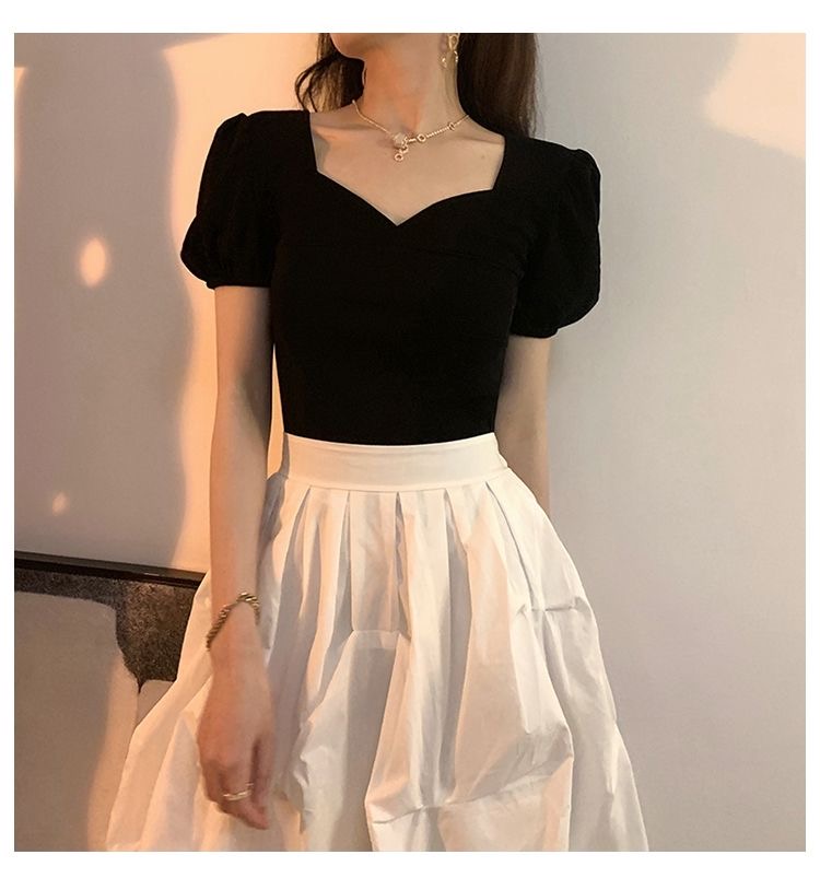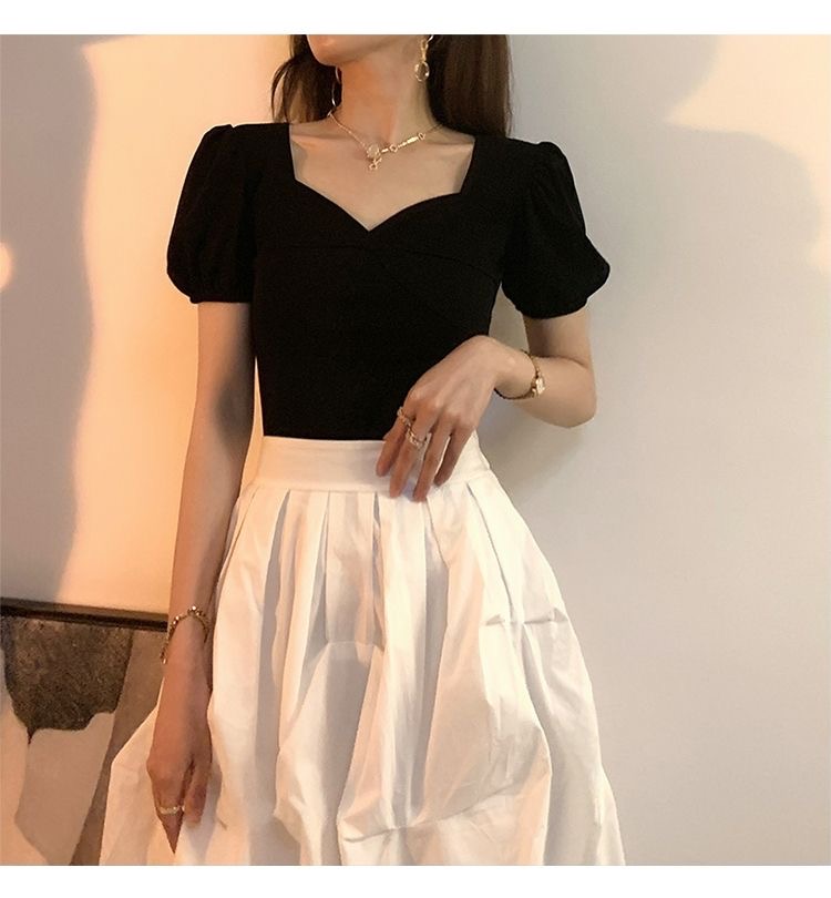 黑色短袖t恤女夏季漏鎖骨法式方領泡泡袖設計感小衆短款別致上衣