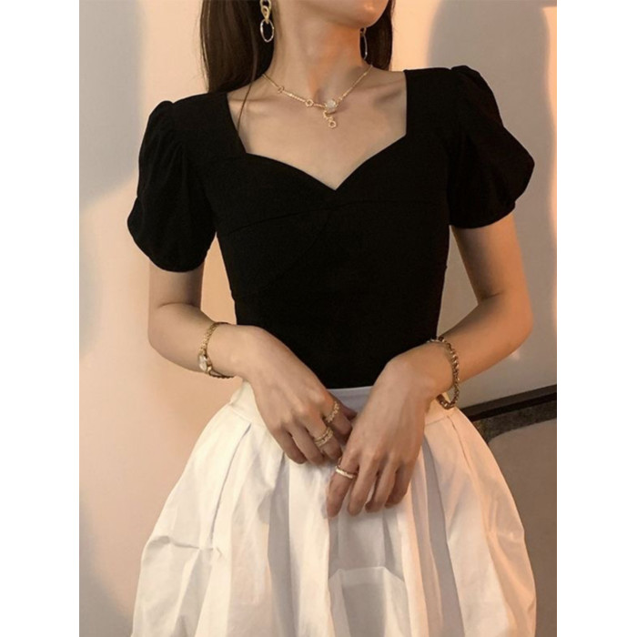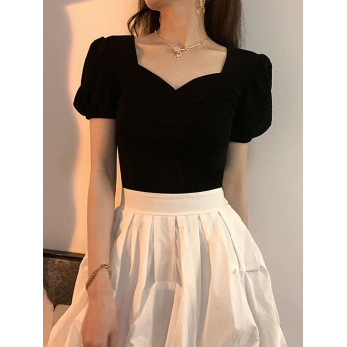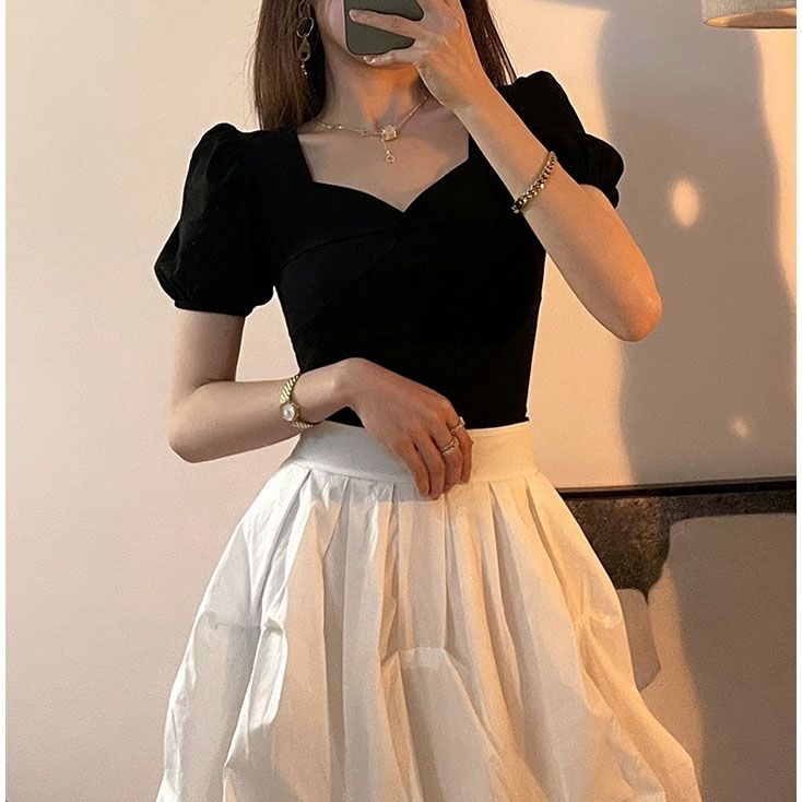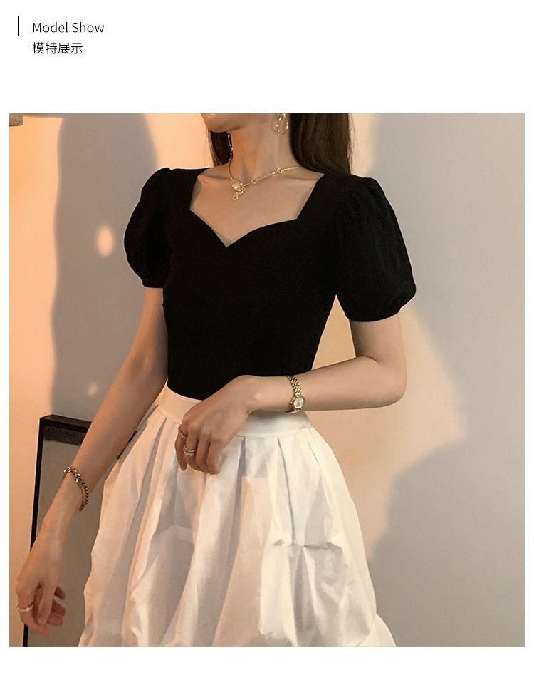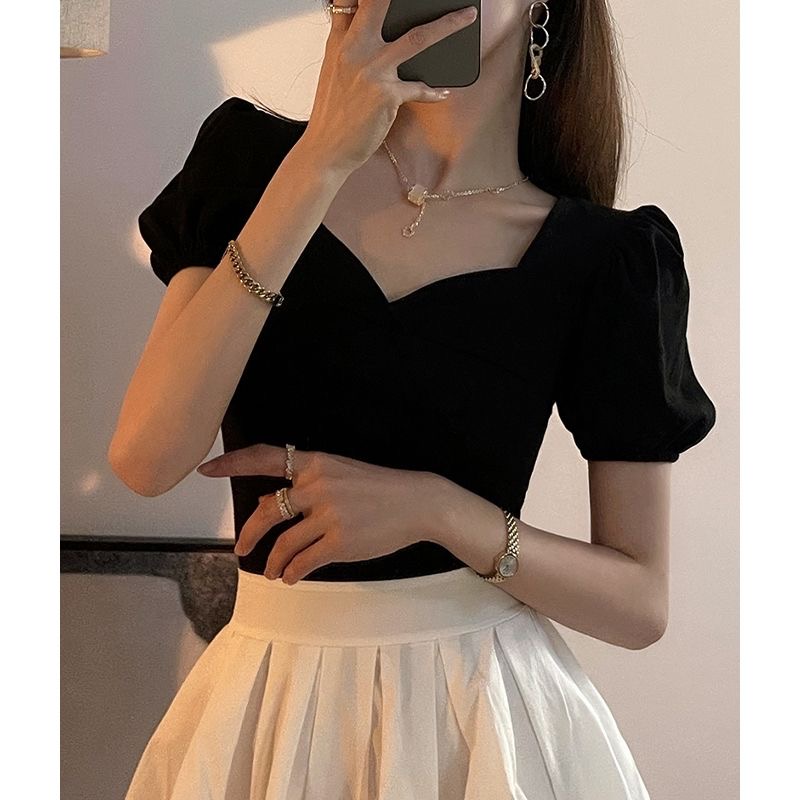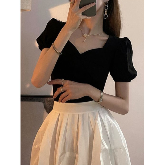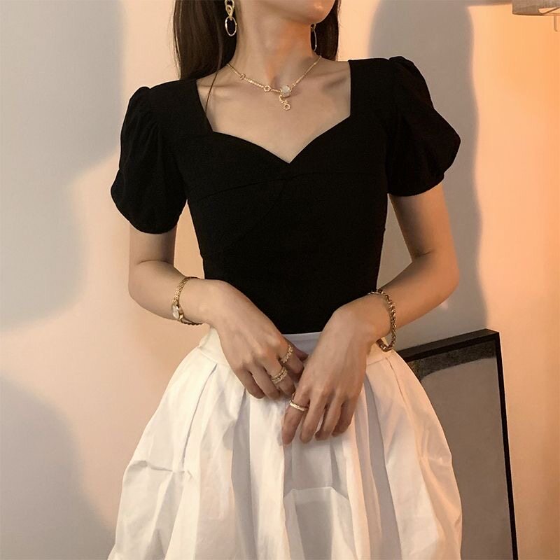 黑色短袖t恤女夏季漏鎖骨法式方領泡泡袖設計感小衆短款別致上衣
