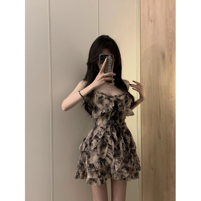 溫柔風水墨碎花吊帶連衣裙子女收腰氣質性感純欲辣妹a字短裙夏季
