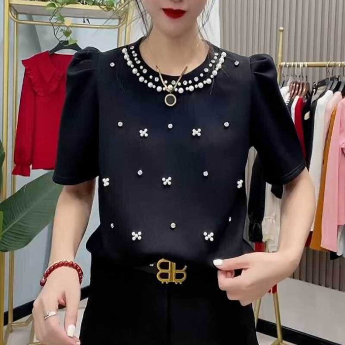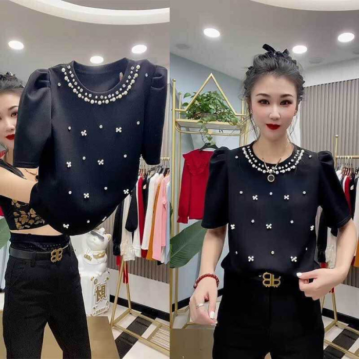小香風重工訂珠釘鑽泡泡袖t恤女2025年夏季新款絕美顯瘦圓領上衣