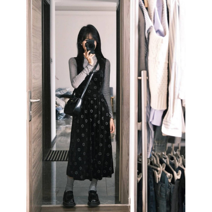 法式復古黑色絲絨吊帶連衣裙子女收腰氣質碎花長裙打底衫套裝秋季