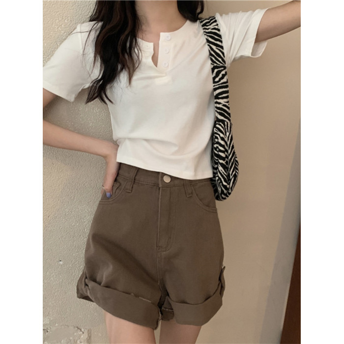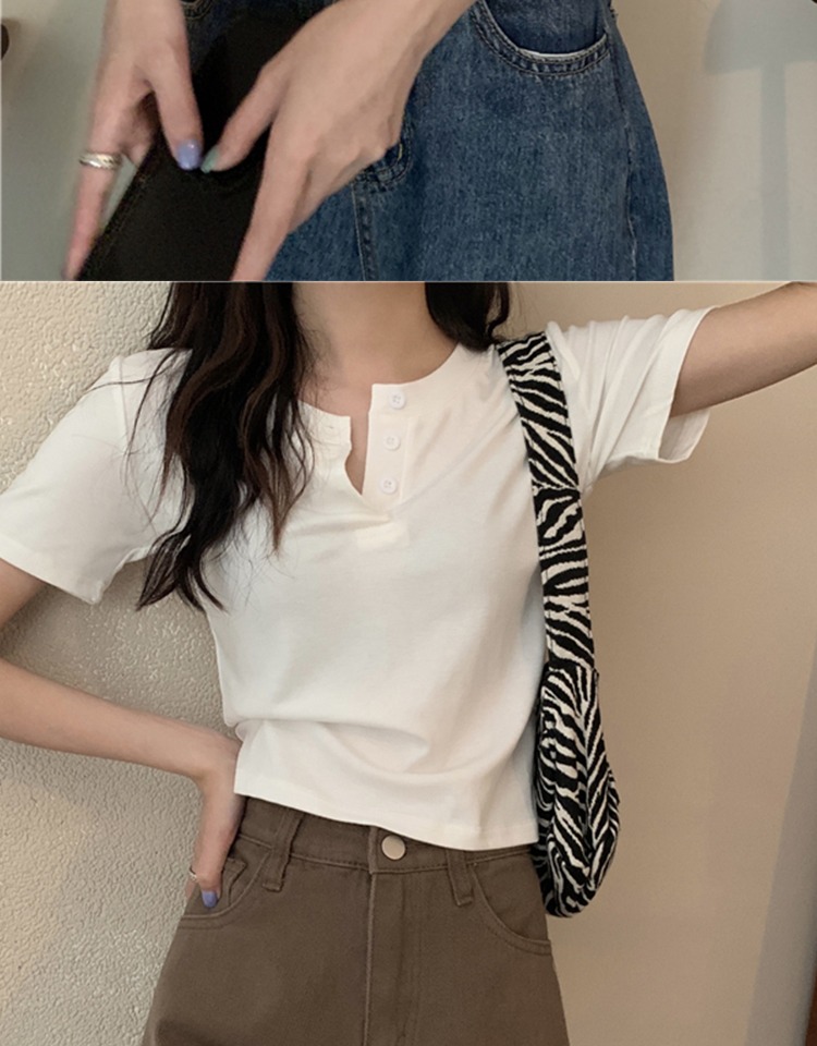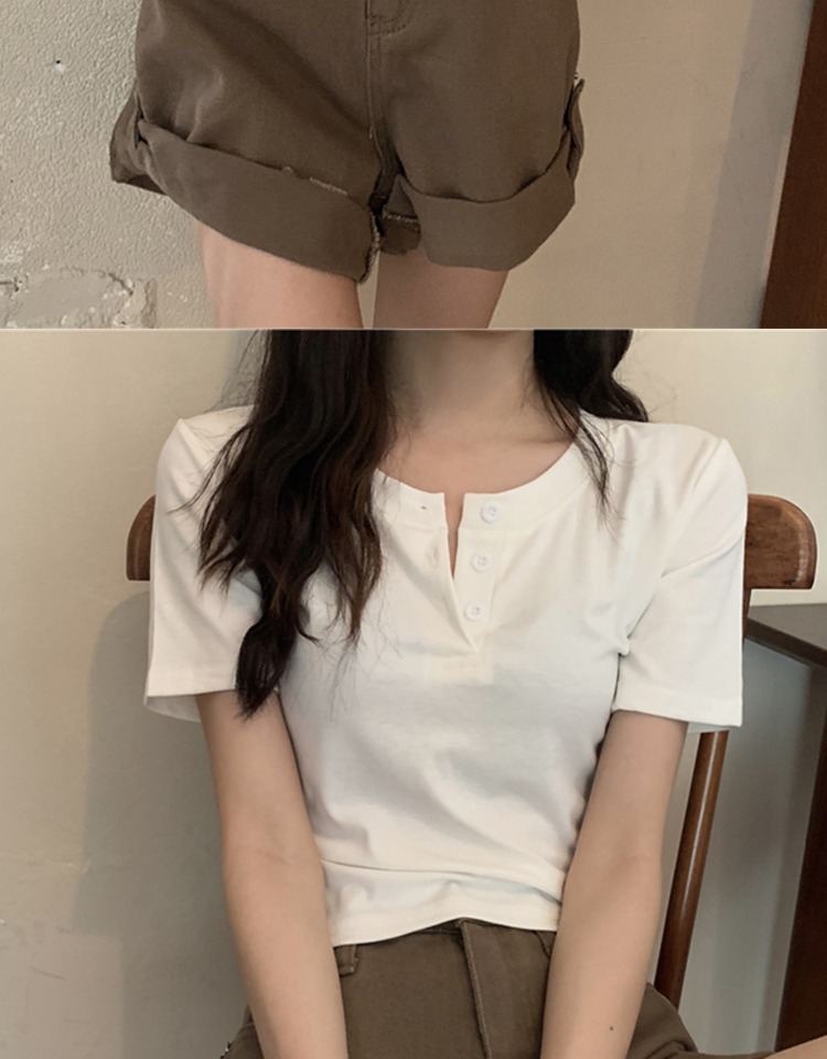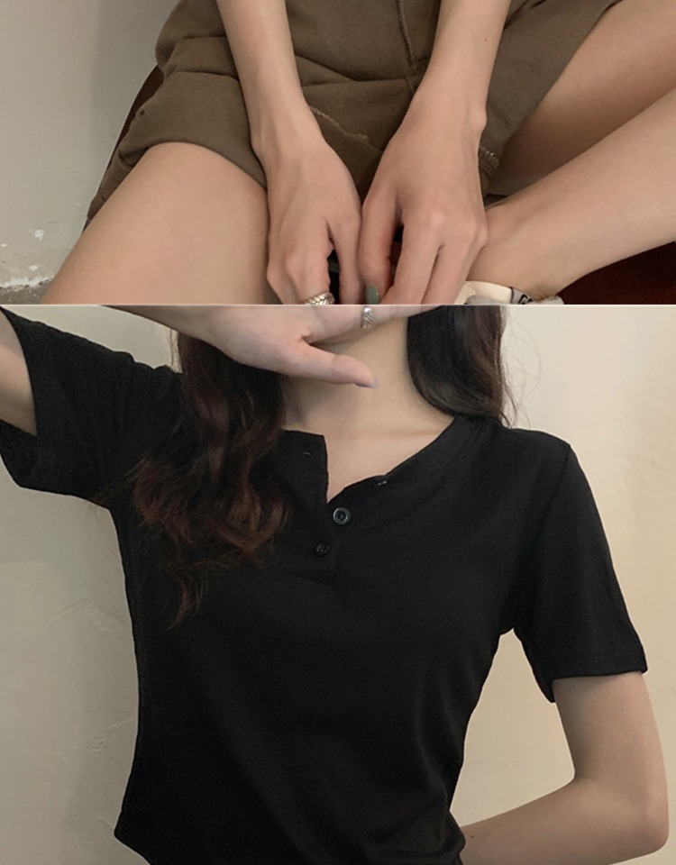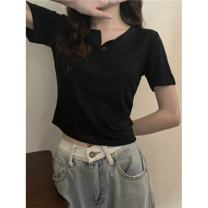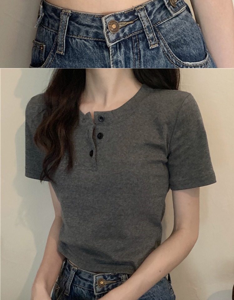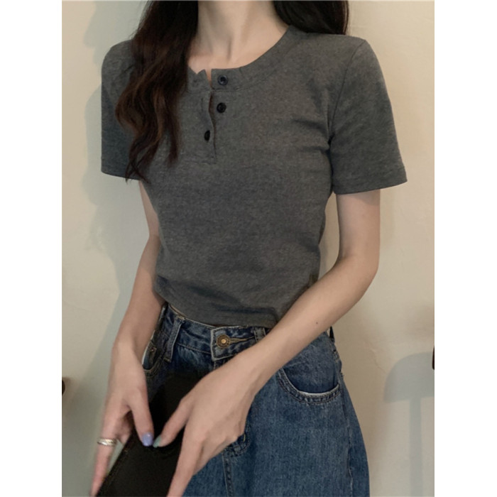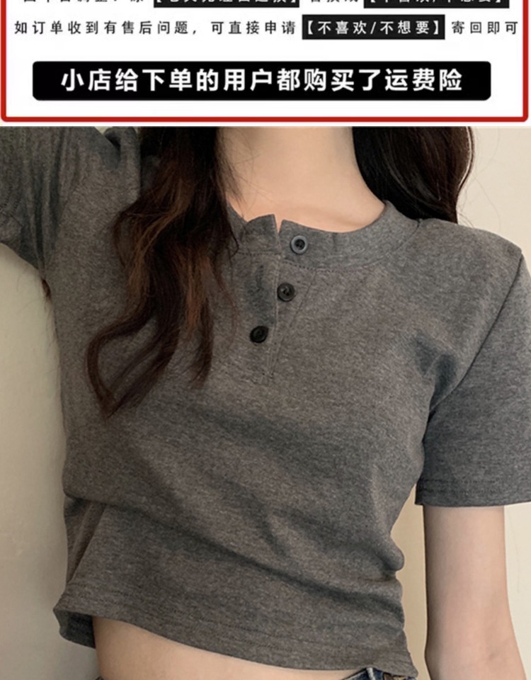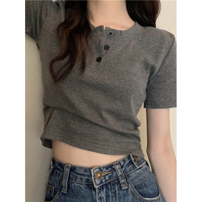 花灰色高級感正肩短袖t恤女夏季棉質半開領小衫辣妹顯瘦短款上衣