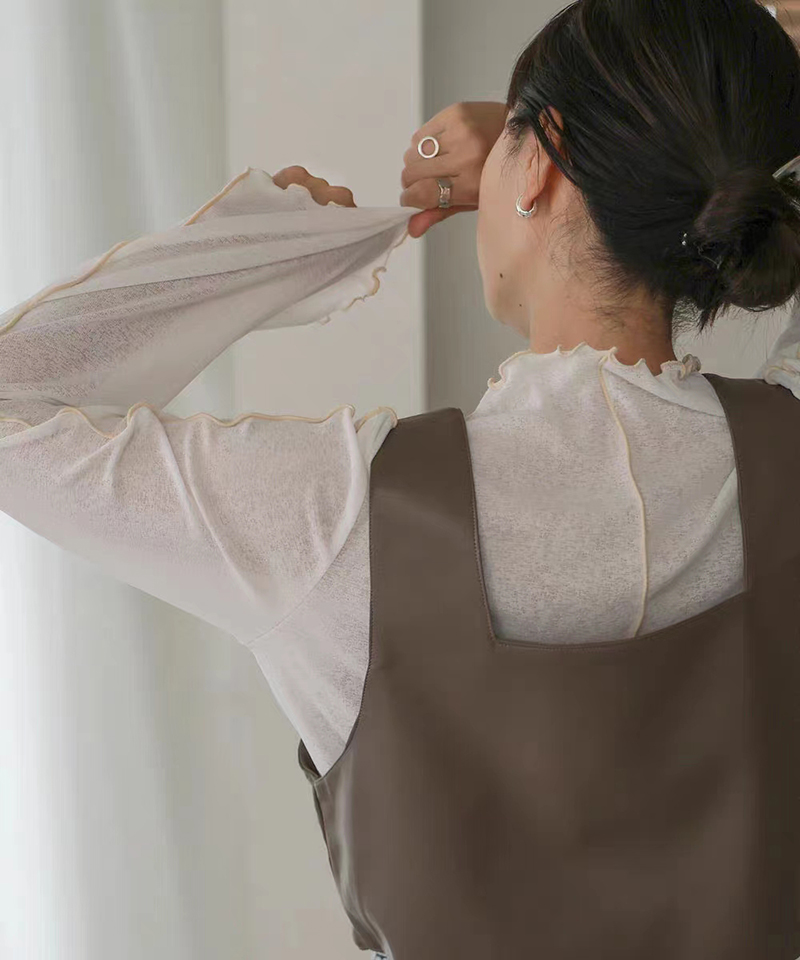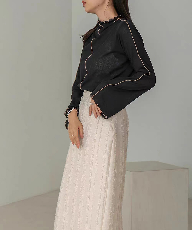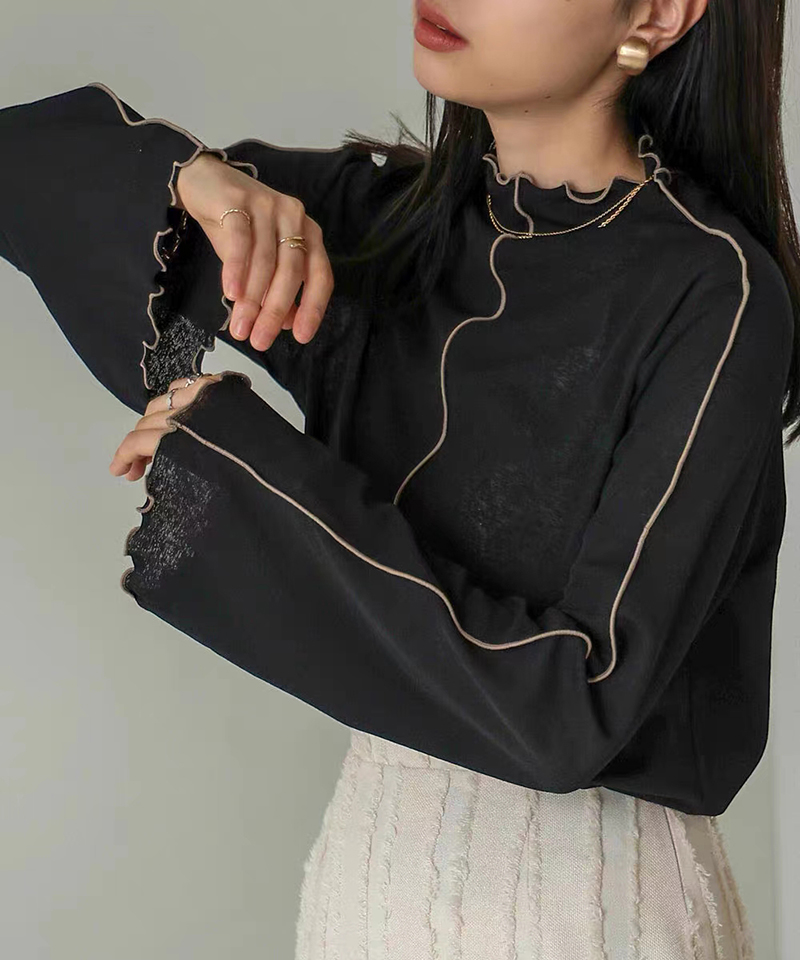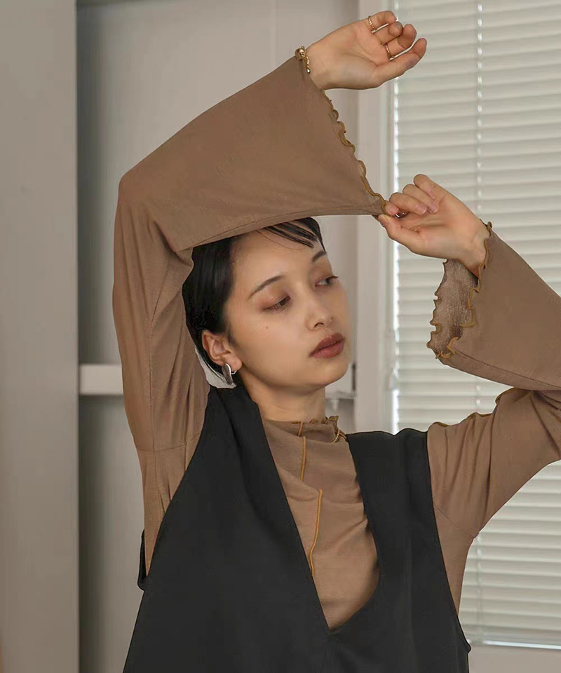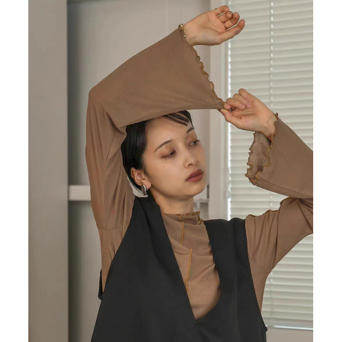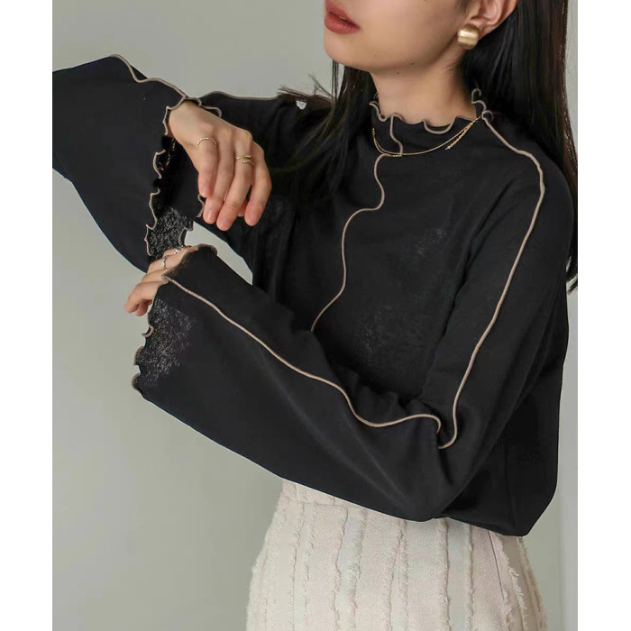 ins秋季新款設計感微喇叭袖小高領透視上衣T恤女木耳邊打底衫