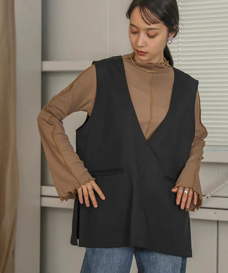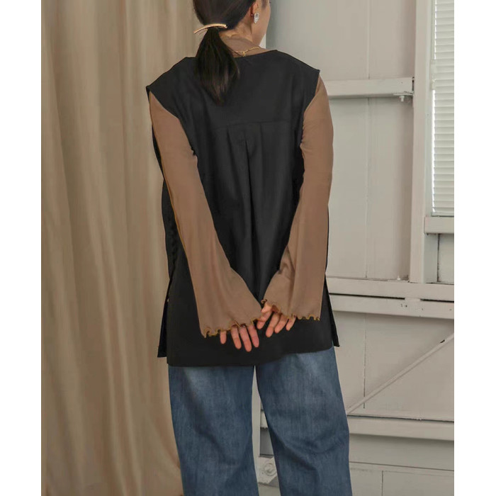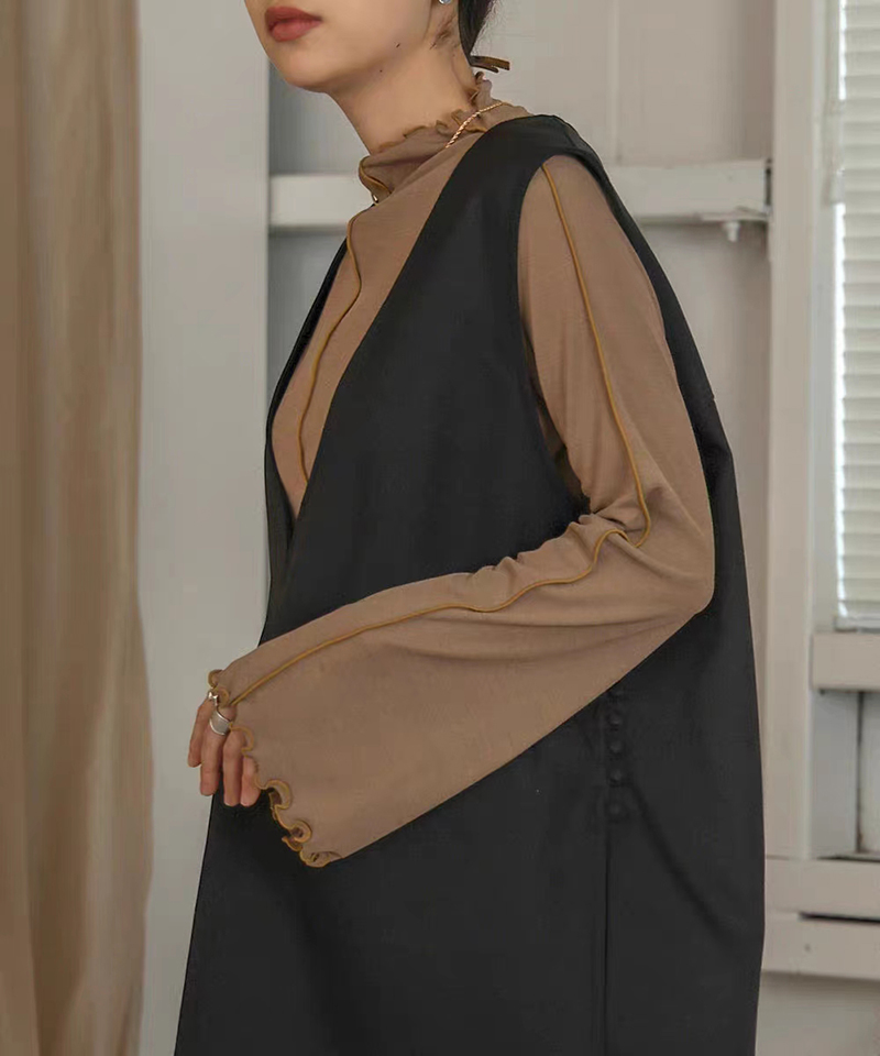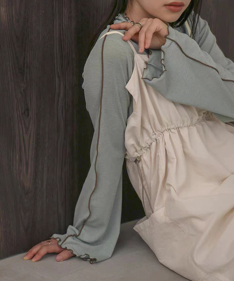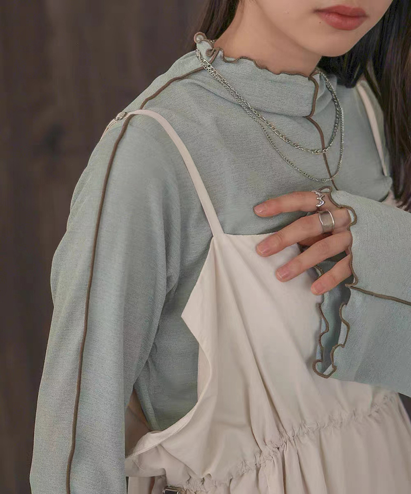 ins秋季新款設計感微喇叭袖小高領透視上衣T恤女木耳邊打底衫
