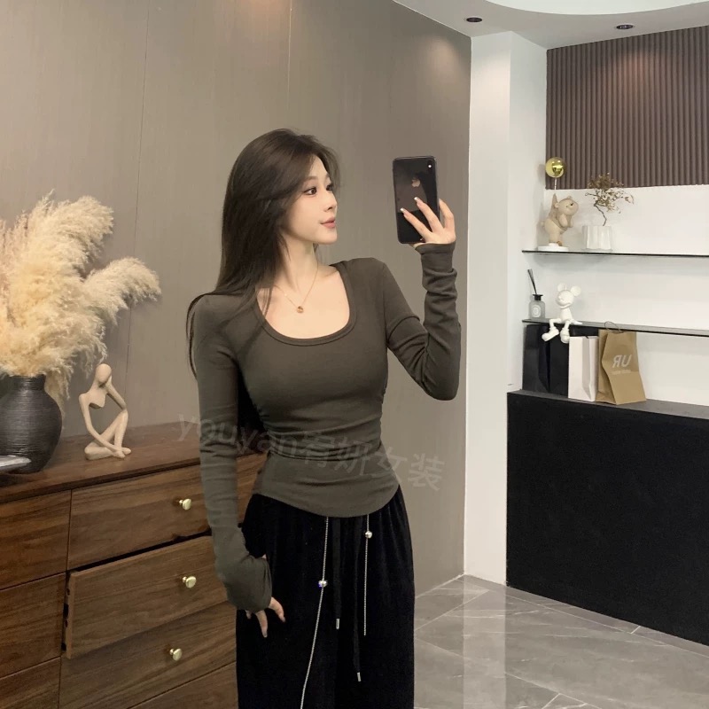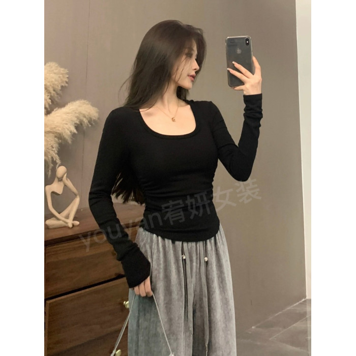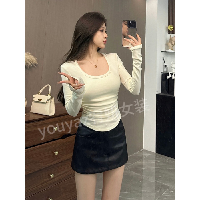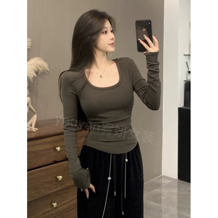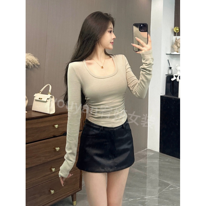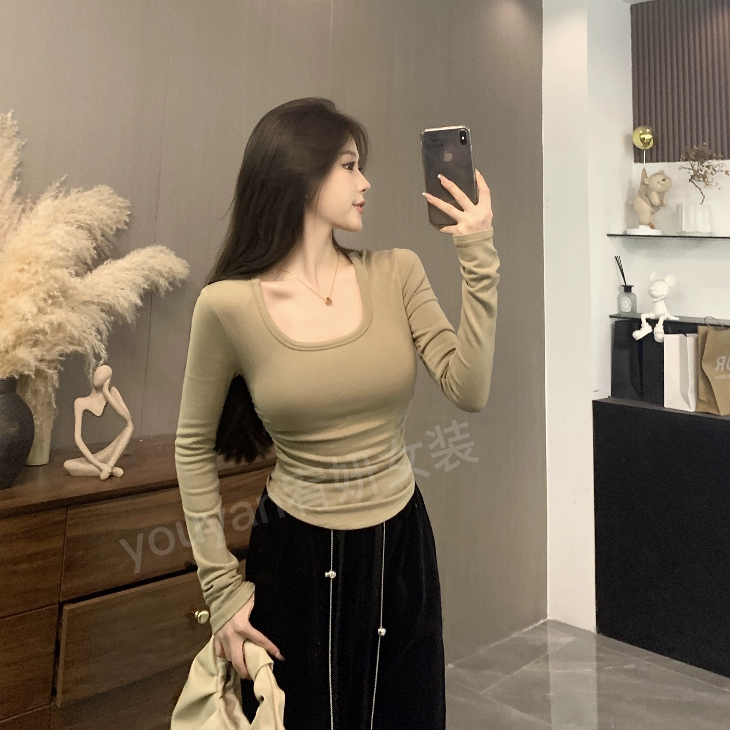 大碼胖mm純色磨毛內搭U領修身長袖T恤女秋冬甜辣妹褶皺打底衫上衣