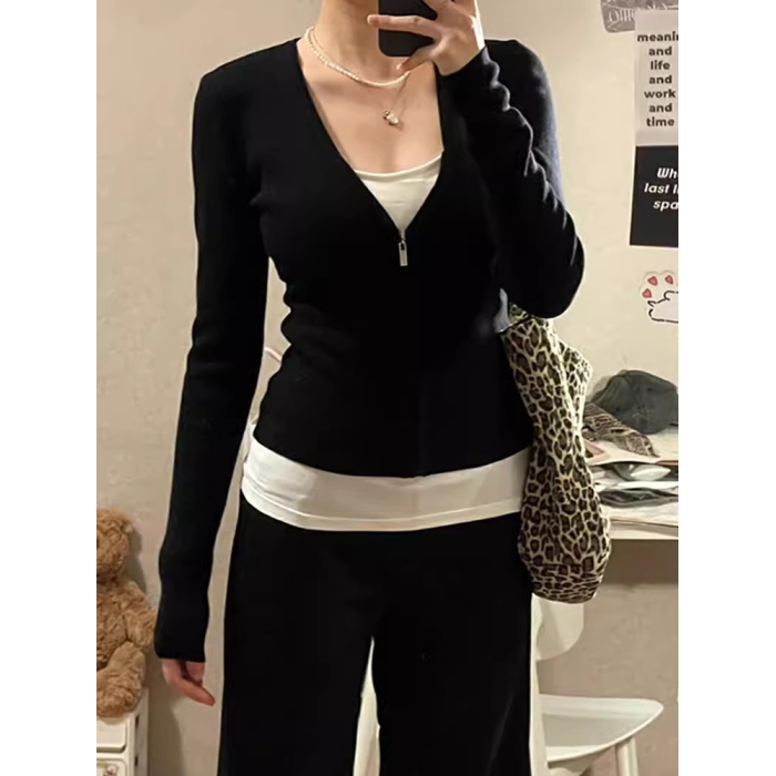 秋裝韓系黑白撞色內搭打底衫長袖t恤女假兩件小衆設計感修身上衣
